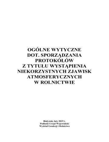 OGÓLNE WYTYCZNE DOT. SPORZĄDZANIA PROTOKÓŁÓW Z TYTUŁU WYSTĄPIENIA NIEKORZYSTNYCH ZJAWISK ATMOSFERYCZNYCH W ROLNICTWIE Białystok, luty 2015 r. Podlaski Urząd Wojewódzki Wydział Geodezji i Rolnictwa Podstawa prawna: 1. Rozporządzenie Rady Ministrów z dnia 27 stycznia 2015 roku w sprawie szczegółowego zakresu i sposobów realizacji niektórych zadań Agencji Restrukturyzacji i Modernizacji Rolnictwa (Dz. U. z dnia 6 lutego 2015 r., poz.187), 2. Rozporządzenie Rady Ministrów z dnia 6 sierpnia 2013 r. zmieniające rozporządzenie w sprawie realizacji niektórych zadań Agencji Restrukturyzacji i Modernizacji Rolnictwa (Dz. U. z dnia 30 sierpnia 2013 r.) 3. Informacja dla Komisji powołanych przez Wojewodę dotyczącą ogólnych zasad szacowania szkód w gospodarstwach rolnych i działach specjalnych produkcji rolnej, w których wystąpiły szkody spowodowane przez suszę, grad, deszcz nawalny, ujemne skutki przezimowania, przymrozki wiosenne, powódź, huragan, piorun, obsunięcie się ziemi –dostępne na stronie PUW na pasku –Klęski w rolnictwie lub na stronie www.minrol.gov.pl, - w zakładce niekorzystne zjawiska atmosferyczne – pomoc, 4. Ustawa z dnia 7 lipca 2005 r. o ubezpieczeniach upraw rolnych i zwierząt gospodarskich (Dz. U. Nr 150, poz. 1249 ze zm.), 5. Rozporządzenie Komisji (WE) Nr 1857/2006 z 15 grudnia 2006 r. w sprawie stosowania art. 87 i 88 Traktatu w odniesieniu do pomocy państwa dla małych i średnich przedsiębiorstw prowadzących działalność związaną z wytwarzaniem produktów rolnych oraz zmieniające rozporządzenie (WE) Nr 70/2001 (DZ. Urz. UE L 358 z 16.12.2006 r. str. 3), 6. Warunki i zasady udzielania kredytów dostępne na stronie Agencji Restrukturyzacji i Modernizacji Rolnictwa w zakładce - pomoc krajowa. Cel szacowania Umożliwienie ubiegania się poszkodowanym producentom rolnym o: Inwestycyjny kredyt klęskowy, Obrotowy kredyt klęskowy, Inne formy pomocy (ogłaszane przez Radę Ministrów). Najczęstsze błędy popełniane przy sporządzaniu dokumentów (protokółu, oświadczeń, kart kalkulacyjnych) to: 1. Błędne nazewnictwo niekorzystnego zjawiska i brak takiego wpisu, 2. brak wpisu wszystkich upraw występujących w gospodarstwie, 3. brak wpisywanych cen i plonów a w produkcji zwierzęcej: zwierząt oraz produktów zwierzęcych, 4. błędnie wpisywane lub brak nazewnictwa niekorzystnego zjawiska atmosferycznego, 5. błędy rachunkowe, 6. brak daty sporządzenia dokumentów i czytelnych podpisów członków komisji i rolnika, 7. Nieuwzględnianie w protokóle szkód w środkach trwałych. Komisje nie zmieniają oświadczeń wystawionych przez rolnika, ale powinni je weryfikować wpisując rzeczywiste dane do protokółu. Wzory druków obowiązujące w województwie podlaskim są do pobrania ze strony Podlaskiego Urzędu Wojewódzkiego – na pasku – Klęski w rolnictwie. Pliki materiałów należy pobierać na bieżąco gdyż są dokonywane zmiany. Ministerstwo Rolnictwa i Rozwoju Wsi przygotowało do realizacji nowe rozporządzenie z dnia 27 stycznia 2015 roku w sprawie szczegółowego zakresu i sposobów realizacji niektórych zadań Agencji Restrukturyzacji i Modernizacji Rolnictwa i „Informacje dla komisji powołanych przez wojewodę dotyczącą ogólnych zasad szacowania szkód w gospodarstwach rolnych i działach specjalnych produkcji rolnej, w których wystąpiły szkody spowodowane przez suszę, grad, deszcz nawalny, ujemne skutki przezimowania, przymrozki wiosenne, powódź, huragan, piorun, obsuniecie się ziemi lub lawinę” – do pobrania na ze strony PUW. Przy sporządzaniu protokółu z oszacowania zakresu i wysokości szkód w gospodarstwach rolnych i działach specjalnych produkcji rolnej spowodowanych niekorzystnymi zjawiskami atmosferycznymi – Komisja powinna stosować następujące zasady: 1. Przed przystąpieniem do prac w Komisji, jej członkowie powinni szczegółowo się zapoznać z wzorami dokumentów oraz objaśnieniami do nich. Rozporządzenie, informacje dla Komisji i wzory dokumentów umieszczone są na stronie Podlaskiego Urzędu Wojewódzkiego - na pasku „Klęski w rolnictwie”. 2. Zgodnie z obowiązującym wzorem protokół należy wypełniać elektronicznie lub pismem drukowanym (czytelnie) z największą starannością. Każdy niewłaściwy zapis powinien być przekreślony i podpisany a nad nim dokonany właściwy zapis. Nie wolno natomiast poprawiać na wcześniej dokonanym zapisie ani też mazać. Przy dokonywaniu zapisów w tabeli w poszczególnych wierszach– wszystkie kolumny muszą być zapisane. 3. W protokóle należy odnotować datę (lub okres) i nazwę wystąpienia niekorzystnego zjawiska oraz dęte zgłoszenia producenta rolnego do gminy. 4. Protokół powinien być sporządzany wyłącznie na podstawie lustracji w terenie uwzględniając zapisy rolnika zawarte we wniosku (złożonym w gminie) o oszacowanie szkód i oświadczeniach – o plonach, cenach oraz kosztach nieponiesionych i poniesionych, ilości zwierząt oraz produkcji zwierzęcej i ich cenach (załącznik nr 1 i nr 2) oraz odszkodowaniach wypłaconych przez firmy ubezpieczeniowe. 5. W protokóle należy dokonać wpisu dotyczącego faktycznego właściciela (właścicieli) lub dzierżawcę gospodarstwa wraz z siedzibą gospodarstwa z miejscem zamieszkania. 6. Wypełniając kolejne punkty protokółu należy uwzględniać wszystkie wyjaśnienia i przypisy. Każda tabela musi być wypełniona. Jeżeli w danym gospodarstwie coś nie występuje to zapisy w kolumnie w tabeli powinny być odnotowane poprzez dokonanie zapisu: nie występuje, zero lub nie dotyczy. 7. W 1 tabeli (produkcja roślinna) protokółu muszą być odnotowane wszystkie uprawy występujące w gospodarstwie bez względu na fakt, czy zostały dotknięte niekorzystnymi zjawiskami czy też nie (nawet, jeżeli są położone na kilku gminach). Suma powierzchni upraw odnotowana w 1 tabeli powinna zgadzać się z powierzchnią UR gospodarstwa 