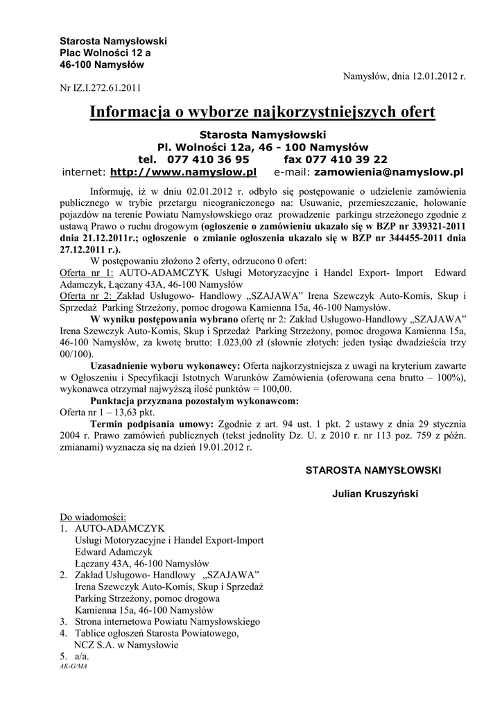 Starosta Namysłowski Plac Wolności 12 a 46-100 Namysłów Namysłów, dnia 12.01.2012 r. Nr IZ.I.272.61.2011 Informacja o wyborze najkorzystniejszych ofert Starosta Namysłowski Pl. Wolności 12a, 46 - 100 Namysłów tel. 077 410 36 95 fax 077 410 39 22 internet: http://www.namyslow.pl e-mail: [email protected] Informuję, iŜ w dniu 02.01.2012 r. odbyło się postępowanie o udzielenie zamówienia publicznego w trybie przetargu nieograniczonego na: Usuwanie, przemieszczanie, holowanie pojazdów na terenie Powiatu Namysłowskiego oraz prowadzenie parkingu strzeŜonego zgodnie z ustawą Prawo o ruchu drogowym (ogłoszenie o zamówieniu ukazało się w BZP nr 339321-2011 dnia 21.12.2011r.; ogłoszenie o zmianie ogłoszenia ukazało się w BZP nr 344455-2011 dnia 27.12.2011 r.). W postępowaniu złoŜono 2 oferty, odrzucono 0 ofert: Oferta nr 1: AUTO-ADAMCZYK Usługi Motoryzacyjne i Handel Export- Import Edward Adamczyk, Łączany 43A, 46-100 Namysłów Oferta nr 2: Zakład Usługowo- Handlowy „SZAJAWA” Irena Szewczyk Auto-Komis, Skup i SprzedaŜ Parking StrzeŜony, pomoc drogowa Kamienna 15a, 46-100 Namysłów. W wyniku postępowania wybrano ofertę nr 2: Zakład Usługowo-Handlowy „SZAJAWA” Irena Szewczyk Auto-Komis, Skup i SprzedaŜ Parking StrzeŜony, pomoc drogowa Kamienna 15a, 46-100 Namysłów, za kwotę brutto: 1.023,00 zł (słownie złotych: jeden tysiąc dwadzieścia trzy 00/100). Uzasadnienie wyboru wykonawcy: Oferta najkorzystniejsza z uwagi na kryterium zawarte w Ogłoszeniu i Specyfikacji Istotnych Warunków Zamówienia (oferowana cena brutto – 100%), wykonawca otrzymał najwyŜszą ilość punktów = 100,00. Punktacja przyznana pozostałym wykonawcom: Oferta nr 1 – 13,63 pkt. Termin podpisania umowy: Zgodnie z art. 94 ust. 1 pkt. 2 ustawy z dnia 29 stycznia 2004 r. Prawo zamówień publicznych (tekst jednolity Dz. U. z 2010 r. nr 113 poz. 759 z późn. zmianami) wyznacza się na dzień 19.01.2012 r. STAROSTA NAMYSŁOWSKI Julian Kruszyński Do wiadomości: 1. AUTO-ADAMCZYK Usługi Motoryzacyjne i Handel Export-Import Edward Adamczyk Łączany 43A, 46-100 Namysłów 2. Zakład Usługowo- Handlowy „SZAJAWA” Irena Szewczyk Auto-Komis, Skup i SprzedaŜ Parking StrzeŜony, pomoc drogowa Kamienna 15a, 46-100 Namysłów 3. Strona internetowa Powiatu Namysłowskiego 4. Tablice ogłoszeń Starosta Powiatowego, NCZ S.A. w Namysłowie 5. a/a. AK-G/MA