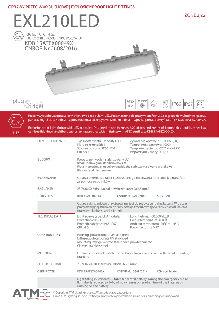 OPRAWY PRZECIWWYBUCHOWE | EXPLOSIONPROOF LIGHT FITTINGS EXL210LED ZONE 2,22 II 3G Ex nA IIC T4 Gc II 3D Ex tc IIIC T65°C-T70°C IP66/67 Dc KDB 15ATEX00049X CNBOP Nr 2608/2016 plug ATEX 4get PZH ZONE 2&22 IP66 IP67 CENTRAL BATTERY Przeciwwybuchowa oprawa oświetleniowa z modułami LED. Przeznaczona do pracy w strefach 2,22 zagrożenia wybuchem gazów, par oraz mgieł cieczy palnych z powietrzem, a także pyłów i włókien palnych. Oprawa posiada certyfikat ATEX KDB 15ATEX00049X. 1.15 Explosionproof light fitting with LED modules. Designed to use in zones 2,22 of gas and steam of flammables liquids, as well as combustible dusts and fibers explosion hazard areas. Light fitting with ATEX certificate KDB 15ATEX00049X. DANE TECHNICZNE: Typ źródła światła: moduły LED Żywotność oprawy: >50.000h L70B10 Klasa ochronności: I Temperatura barwowa: 4000K Stopień ochrony: IP66, IP67 Temp. otoczenia: od -20°C do +45°C CRI: >80Współczynnik mocy: ≥ 0,97 BUDOWA: Korpus: poliwęglan stabilizowany UV Klosz: poliwęglan stabilizowany UV Płyta montażowa: ocynkowana blacha stalowa malowana proszkowo Klamry: stal nierdzewna MOCOWANIE: Oprawa przeznaczona do bezpośredniego mocowania na ścianie lub na suficie za pomocą wsporników ZASILANIE: 230V, 0/50-60Hz, zaciski przyłączeniowe: 3x2.5 mm2 CERTYFIKAT: KDB 15ATEX00049X Oprawa standardowo przystosowana jest do pracy z centralną baterią. W trakcie pracy awaryjnej strumień oprawy zostaje zredukowany do 50%, co wydłuża czas pracy instalacji zasilanej z baterii. CNBOP Nr 2608/2016 Atest PZH TECHNICAL DATA: Light source type: LED modules Long lifetime: >50.000h L70B10 Protection class: IColour temperature: 4000K Protection degree: IP66, IP67 Ambient temp.: from -20°C to +45°C CRI: >80 Power factor: ≥ 0,97 CONSTRUCTION: Housing: polycarbonate UV stabilized Diffuser: polycarbonate UV stabilized Mounting tray: galvanized steel sheet, powder painted Clamps: stainless steel MOUNTING: Luminaire for direct installation on the ceiling or on the wall with use of mounting brackets ELECTRICAL UNIT: 230V, 0/50-60Hz, terminal block: 3x2.5 mm2 CERTIFICATE: KDB 15ATEX00049X Light fitting in standard suitable for central battery. During the emergency mode, light flux is reduced to 50%, what increases oprerating time of the installation running on the battery. CNBOP No. 2608/2016 PZH certificate © Copyright ATM Lighting sp. z o.o. Wszystkie prawa zastrzeżone. Firma ATM Lighting sp. z o.o. zastrzega możliwość wprowadzenia zmian bez uprzedniego informowania. OPRAWY PRZECIWWYBUCHOWE | EXPLOSIONPROOF LIGHT FITTINGS ZONE 2,22 WYMIARY | DIMENSIONS FOTOMETRIA | PHOTOMETRY Ø9mm L L1 B B1 300 H 450 600 750 TYP | TYPE EXL210LED-0600 EXL210LED-1200 EXL210LED-1500 L 673 1283 1583 L1 450 660 900 B 190 190 190 B1 160 160 160 H 134 134 134 ZESTAWIENIE TYPÓW | TYPES COMPARISON TYP OPRAWY TYPE OF LIGHT FITTING EXL210LED-0600-E2 EXL210LED-0600-E4 EXL210LED-1200-E4 EXL210LED-1200-E8 EXL210LED-1500-E6 STRUMIEŃ OPRAWY [lm] MOC POBIERANA [W] SPRAWNOŚĆ [lm/W] ZAMIENNIK T8 LUMINOUS FLUX [lm] POWER CONSUMPTION [W] EFFICIENCY [lm/W] REPLACEMENT T8 20,4 2x18 2482 122 42,2 2x36 4631 110 47,1 2x36 5550 118 65,7 2x58 8512 130 59,8 2x58 7031 118 1.16 PORÓWNANIE OSZCZĘDNOŚCI | SAVINGS COMPARISON TYP OPRAWY TYPE OF LIGHT FITTING EXL210LED-0600-E2 EXL210LED-0600-E4 EXL210LED-1200-E4 EXL210LED-1200-E8 EXL210LED-1500-E6 OSZCZĘDNOŚCI* SAVINGS* 46% 46% 40% 49% 53% OSZCZĘDNOŚĆ SYSTEMU 1:1** SYSTEM SAVINGS 1:1** 56% 46% 50% 58% 53% * oszczędności zużycia energii elektrycznej oprawy EXL210LED w porównaniu do opraw innych producentów wyposażonych w źródła światła T8 | power consumption savings of EXL210LED luminaire compared to other producers standard T8 light fittings ** oszczędności zużycia energii elektrycznej oprawy EXL210LED w porównaniu do opraw innych producentów wyposażonych w źródła światła T8, przy założeniu zachowania jednakowego strumienia świetlnego porównywanych urządzeń | power consumption savings of EXL210LED luminaire compared to other producers standard T8 light fittings, assuming equal light flux of compared devices ŚREDNI STRUMIEŃ AWARYJNY | MEAN EMERGENCY MODE LUMINOUS FLUX TYP OPRAWY TYPE OF LIGHT FITTING EXL210LED-0600-E2 EXL210LED-0600-E4 EXL210LED-1200-E4 EXL210LED-1200-E8 EXL210LED-1500-E6 WERSJA A3*** [lm] A3 VERSION*** [lm] 461 509 507 579 516 WERSJA ZB [lm] ZB VERSION [lm] 1241 2316 2775 4256 3516 *** oprawa w wersji A3 posiada wewnętrzny moduł zasilający zdolny do podtrzymywania pracy w trybie awaryjnym, przez okres minimum 3 godzin, w przypadku zaniku napięcia zasilania | A3 version of light fitting is equiped with internal power supply module capable of continuous work in emergency mode, for at least three hours, in case of mains failure © Copyright ATM Lighting sp. z o.o. All rights reserved. Technical modification reserved without prior notice. www.atmlighting.pl [email protected] OPRAWY PRZECIWWYBUCHOWE | EXPLOSIONPROOF LIGHT FITTINGS DOSTĘPNE KONFIGURACJE | AVAILABLE OPTIONS E X L 2 1 0 L ED E 3 E PC PC 0 6 0 0 2 4 30 10 M 20 A3 1 2 0 0 4 5 33 11 P 25 ZB 1 5 0 0 6 40 20 8 44 21 RST wersja awaryjna emergency version materiał klosza diffuser material materiał obudowy housing material wpusty kablowe cable inlets okablowanie wiring zasilanie power supply ilość /quantity typ modułu LED / LED module type przybliżona długość approximate length typ type grupa group 22 1.17 plug 4get Opcjonalna wersja z zestawem gniazda i wtyku, dzięki czemu nie jest wymagane otwarcie oprawy podczas montażu. Rozwiązanie tego typu pozwala na ekspresowy montaż oraz upraszcza dalszą eksploatację urządzenia. Optional version with plug&socket set, so it is not needed to open the fitting during installation. This solution allows fast assembly and simplifies further exploatation © Copyright ATM Lighting sp. z o.o. Wszystkie prawa zastrzeżone. Firma ATM Lighting sp. z o.o. zastrzega możliwość wprowadzenia zmian bez