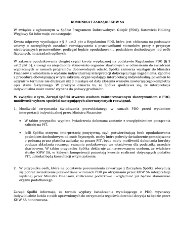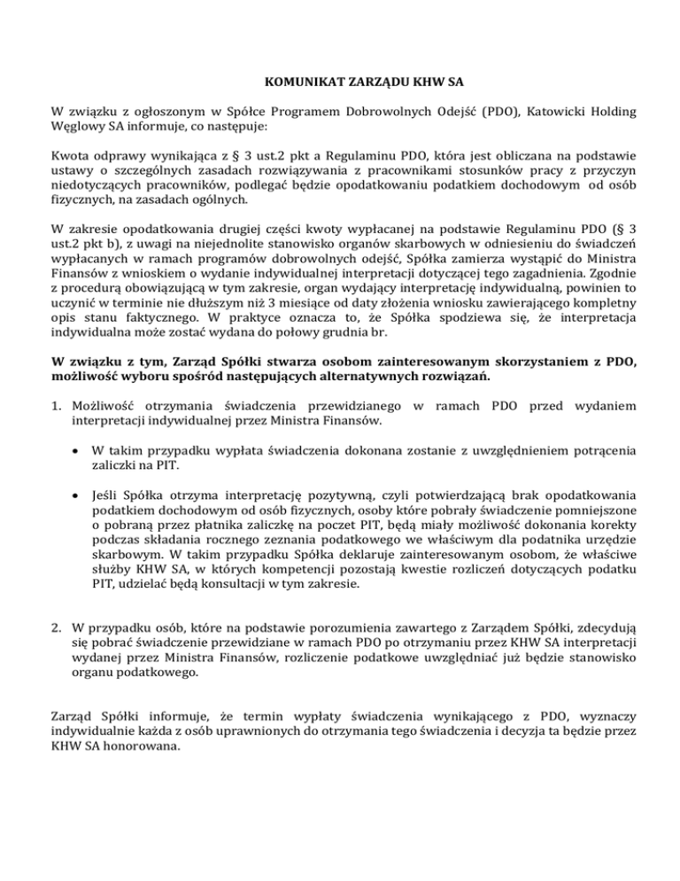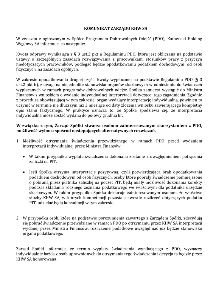 KOMUNIKAT ZARZĄDU KHW SA W związku z ogłoszonym w Spółce Programem Dobrowolnych Odejść (PDO), Katowicki Holding Węglowy SA informuje, co następuje: Kwota odprawy wynikająca z § 3 ust.2 pkt a Regulaminu PDO, która jest obliczana na podstawie ustawy o szczególnych zasadach rozwiązywania z pracownikami stosunków pracy z przyczyn niedotyczących pracowników, podlegać będzie opodatkowaniu podatkiem dochodowym od osób fizycznych, na zasadach ogólnych. W zakresie opodatkowania drugiej części kwoty wypłacanej na podstawie Regulaminu PDO (§ 3 ust.2 pkt b), z uwagi na niejednolite stanowisko organów skarbowych w odniesieniu do świadczeń wypłacanych w ramach programów dobrowolnych odejść, Spółka zamierza wystąpić do Ministra Finansów z wnioskiem o wydanie indywidualnej interpretacji dotyczącej tego zagadnienia. Zgodnie z procedurą obowiązującą w tym zakresie, organ wydający interpretację indywidualną, powinien to uczynić w terminie nie dłuższym niż 3 miesiące od daty złożenia wniosku zawierającego kompletny opis stanu faktycznego. W praktyce oznacza to, że Spółka spodziewa się, że interpretacja indywidualna może zostać wydana do połowy grudnia br. W związku z tym, Zarząd Spółki stwarza osobom zainteresowanym skorzystaniem z PDO, możliwość wyboru spośród następujących alternatywnych rozwiązań. 1. Możliwość otrzymania świadczenia przewidzianego w ramach PDO przed wydaniem interpretacji indywidualnej przez Ministra Finansów. W takim przypadku wypłata świadczenia dokonana zostanie z uwzględnieniem potrącenia zaliczki na PIT. Jeśli Spółka otrzyma interpretację pozytywną, czyli potwierdzającą brak opodatkowania podatkiem dochodowym od osób fizycznych, osoby które pobrały świadczenie pomniejszone o pobraną przez płatnika zaliczkę na poczet PIT, będą miały możliwość dokonania korekty podczas składania rocznego zeznania podatkowego we właściwym dla podatnika urzędzie skarbowym. W takim przypadku Spółka deklaruje zainteresowanym osobom, że właściwe służby KHW SA, w których kompetencji pozostają kwestie rozliczeń dotyczących podatku PIT, udzielać będą konsultacji w tym zakresie. 2. W przypadku osób, które na podstawie porozumienia zawartego z Zarządem Spółki, zdecydują się pobrać świadczenie przewidziane w ramach PDO po otrzymaniu przez KHW SA interpretacji wydanej przez Ministra Finansów, rozliczenie podatkowe uwzględniać już będzie stanowisko organu podatkowego. Zarząd Spółki informuje, że termin wypłaty świadczenia wynikającego z PDO, wyznaczy indywidualnie każda z osób uprawnionych do otrzymania tego świadczenia i decyzja ta będzie przez KHW SA honorowana.