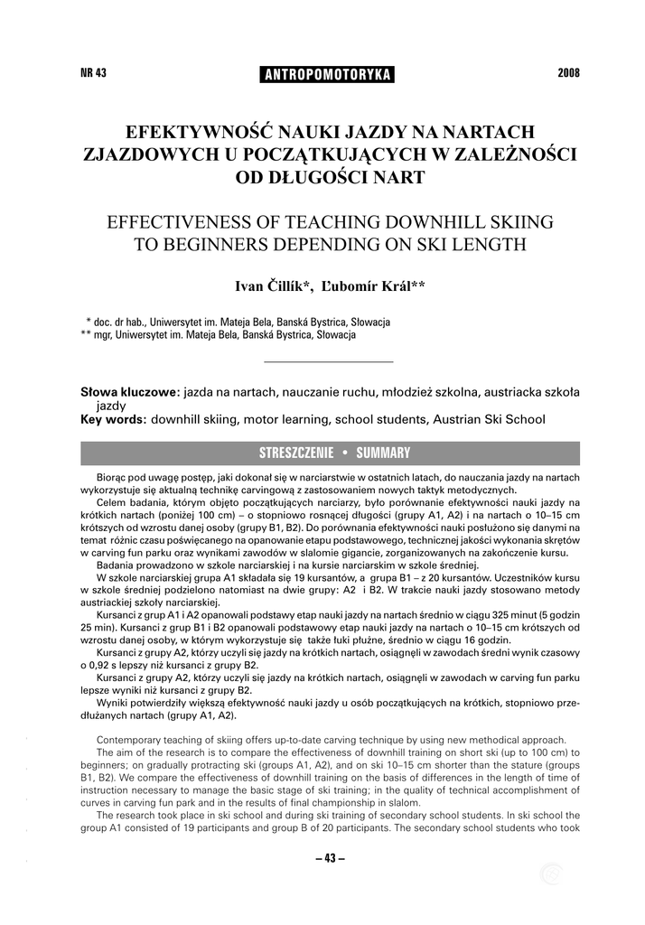 NR 43 AN TRO PO MO TO RY KA 2008 EFEKTYWNOŚĆ NAUKI JAZDY NA NARTACH ZJAZDOWYCH U POCZĄTKUJĄCYCH W ZALEŻNOŚCI OD DŁUGOŚCI NART EFFECTIVENESS OF TEACHING DOWNHILL SKIING TO BEGINNERS DEPENDING ON SKI LENGTH Ivan Čillík*, Ľubomír Král** ** doc. dr hab., Uniwersytet im. Mateja Bela, Banská Bystrica, Słowacja ** mgr, Uniwersytet im. Mateja Bela, Banská Bystrica, Słowacja Słowa kluczowe: jazda na nartach, nauczanie ruchu, młodzież szkolna, austriacka szkoła jazdy Key words: downhill skiing, motor learning, school students, Austrian Ski School STRESZCZENIE • SUMMARY – 43 – - - - Contemporary teaching of skiing offers up-to-date carving technique by using new methodical approach. The aim of the research is to compare the effectiveness of downhill training on short ski (up to 100 cm) to beginners; on gradually protracting ski (groups A1, A2), and on ski 10–15 cm shorter than the stature (groups B1, B2). We compare the effectiveness of downhill training on the basis of differences in the length of time of instruction necessary to manage the basic stage of ski training; in the quality of technical accomplishment of curves in carving fun park and in the results of final championship in slalom. The research took place in ski school and during ski training of secondary school students. In ski school the group A1 consisted of 19 participants and group B of 20 participants. The secondary school students who took - Biorąc pod uwagę postęp, jaki dokonał się w narciarstwie w ostatnich latach, do nauczania jazdy na nartach wykorzystuje się aktualną technikę carvingową z zastosowaniem nowych taktyk metodycznych. Celem badania, którym objęto początkujących narciarzy, było porównanie efektywności nauki jazdy na krótkich nartach (poniżej 100 cm) – o stopniowo rosnącej długości (grupy A1, A2) i na nartach o 10–15 cm krótszych od wzrostu danej osoby (grupy B1, B2). Do porównania efektywności nauki posłużono się danymi na temat różnic czasu poświęcanego na opanowanie etapu podstawowego, technicznej jakości wykonania skrętów w carving fun parku oraz wynikami zawodów w slalomie gigancie, zorganizowanych na zakończenie kursu. Badania prowadzono w szkole narciarskiej i na kursie narciarskim w szkole średniej. W szkole narciarskiej grupa A1 składała się 19 kursantów, a grupa B1 – z 20 kursantów. Uczestników kursu w szkole średniej podzielono natomiast na dwie grupy: A2 i B2. W trakcie nauki jazdy stosowano metody austriackiej szkoły narciarskiej. Kursanci z grup A1 i A2 opanowali podstawy etap nauki jazdy na nartach średnio w ciągu 325 minut (5 godzin 25 min). Kursanci z grup B1 i B2 opanowali podstawowy etap nauki jazdy na nartach o 10–15 cm krótszych od wzrostu danej osoby, w którym wykorzystuje się także łuki płużne, średnio w ciągu 16 godzin. Kursanci z grupy A2, którzy uczyli się jazdy na krótkich nartach, osiągnęli w zawodach średni wynik czasowy o 0,92 s lepszy niż kursanci z grupy B2. Kursanci z grupy A2, którzy uczyli się jazdy na krótkich nartach, osiągnęli w zawodach w carving fun parku lepsze wyniki niż kursanci z grupy B2. Wyniki potwierdziły większą efektywność nauki jazdy u osób początkujących na krótkich, stopniowo przedłużanych nartach (grupy A1, A2). Ivan Čillik, Ľubomír Král part in the ski training were divided in two groups A2 (9 participants) and B2 (9 participants). During teaching there were used the methodical techniques according to Austrian ski school. Participants of groups A1 and A2 mastered the basic stage of ski teaching in 325 minutes (5 hours 25 min) in average. Participants of groups B1 and B2 mastered the basic stage of ski teaching in 16 hours by using the methodology of teaching skiing on ski 10–15 cm shorter than a stature with the use of snow plow turn. The students – group A2, who were training on short ski, arrived at better average final time: they were 0,92 seconds faster than the students of group B2. The results confirmed higher effectiveness of teaching skiing to beginners on short ski, on gradually protracting ski (groups A1, A2). - - - - - Wstęp Jak wykazuje historia narciarstwa, narty krótkie zaprojektowano i wprowadzono do użytku w dwu istniejących niezależnie od siebie centrach. I tak w USA krótkich nart zaczął używać w 1938 roku amerykański łyżwiarz figurowy Jimmy Maden, który po doznanej kontuzji zaczął jeździć na nartach dla dzieci. W późniejszym czasie zaprojektował on narty z zagiętymi piętkami (double-ended ski) i wprowadził je do narciarstwa akrobatycznego oraz nauki jazdy dzieci [1]. Nieco wcześniej, bo w 1930 roku, pojawiły się na terenie Alp tzw. firngleitery, czyli narty do jazdy po firnie przeznaczone dla alpinistów; były to wykonane domowym sposobem narty o długości 50–90 cm [2]. W 1940 roku krótkie narty weszły do użycia w środowisku szkół narciarskich, a konkretnie w Kitzbühlskiej Szkole Narciarstwa. W pełni wykorzystano je do nauki jazdy w 1951 roku, kiedy to dyrektor Karl Koller stworzył klasę nauki jazdy na krótkich nartach, a w 1952 roku opracował odpowiedni system nauki. Przy tej okazji szkoleniowiec ten wymienił zalety używania tego typu nart zarówno przez początkujących, jak i bardziej zaawansowanych narciarzy. Koller podkreślił również, iż stosowanie krótkich nart pozwala zwalczyć strach, który w trakcie nauki jazdy stanowi jeden z największych problemów u początkujących narciarzy. W latach 1954–1959 w Kitzbühlskiej Szkole Narciarstwa rozwijała się metoda nauki jazdy na nartach o rosnącej długości [1]. Krótkie narty i narty o rosnącej długości stały się przedmiotem zainteresowania uczestników kongresu INTERSKI w Aspen w 1968 roku. Wielkim propagatorem ich stosowania był prof. George Twardokens z Uniwersytetu w Nevadzie, który zajmował się metodą GLM (graduated length method), czyli metodą stopniowego zwiększania długości nart podczas nauki