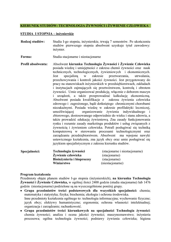TECHNOLOGIA ŻYWNOŚCI i ŻYWIENIE CZŁOWIEKA STUDIA I