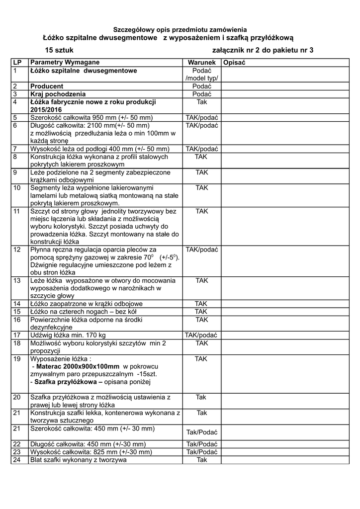 Szczegółowy opis przedmiotu zamówienia Łóżko szpitalne dwusegmentowe z wyposażeniem i szafką przyłóżkową 15 sztuk LP 1 Parametry Wymagane Łóżko szpitalne dwusegmentowe 2 3 4 Producent Kraj pochodzenia Łóżka fabrycznie nowe z roku produkcji 2015/2016 Szerokość całkowita 950 mm (+/- 50 mm) Długość całkowita: 2100 mm(+/- 50 mm) z możliwością przedłużania leża o min 100mm w każdą stronę Wysokość leża od podłogi 400 mm (+/- 50 mm) Konstrukcja łóżka wykonana z profili stalowych pokrytych lakierem proszkowym Leże podzielone na 2 segmenty zabezpieczone krążkami odbojowymi Segmenty leża wypełnione lakierowanymi lamelami lub metalową siatką montowaną na stałe pokrytą lakierem proszkowym. Szczyt od strony głowy jednolity tworzywowy bez miejsc łączenia lub składania z możliwością wyboru kolorystyki. Szczyt posiada uchwyty do prowadzenia łóżka. Szczyt montowany na stałe do konstrukcji łóżka Płynna ręczna regulacja oparcia pleców za pomocą sprężyny gazowej w zakresie 700 (+/-50). Dźwignie regulacyjne umieszczone pod leżem z obu stron łóżka Leże łóżka wyposażone w otwory do mocowania wyposażenia dodatkowego w narożnikach w szczycie głowy Łóżko zaopatrzone w krążki odbojowe Łóżko na czterech nogach – bez kół Powierzchnie łóżka odporne na środki dezynfekcyjne Udźwig łóżka min. 170 kg Możliwość wyboru kolorystyki szczytów min 2 propozycji Wyposażenie łóżka : - Materac 2000x900x100mm w pokrowcu zmywalnym paro przepuszczalnym -15szt. - Szafka przyłóżkowa – opisana poniżej 5 6 7 8 9 10 11 12 13 14 15 16 17 18 19 20 21 Szafka przyłóżkowa z możliwością ustawienia z prawej lub lewej strony łóżka Konstrukcja szafki lekka, kontenerowa wykonana z tworzywa sztucznego Szerokość całkowita: 450 mm (+/- 30 mm) 22 23 24 Długość całkowita: 450 mm (+/-30 mm) Wysokość całkowita: 825 mm (+/-30 mm) Blat szafki wykonany z tworzywa 21 załącznik nr 2 do pakietu nr 3 Warunek Opisać Podać /model typ/ Podać Podać Tak TAK/podać TAK/podać TAK/podać TAK TAK TAK TAK TAK/podać TAK TAK TAK TAK TAK/podać TAK TAK Tak Tak Tak/Podać Tak/Podać Tak/Podać Tak 25 Czoła szuflad i drzwiczek wyposażone w uchwyty do otwierania nie wystające poza obrys szafki 26 Szafka wyposażona w uchwyty na ręczniki umieszczone na dwóch bokach szafki - składane do korpusu szafki 27 Szafka wyposażona w dodatkowy wysuwany blat boczny np. do pisania lub jako miejsce na gazety, książkę itp. 28 Szafka wyposażona w cztery koła o śr. min. 50 mm , w tym 2 z blokadą Warunki gwarancji i serwisu 1 Okres gwarancji minimum 36 miesięcy 2 3 4 5 6 W okresie gwarancji bezpłatne naprawy i przeglądy techniczne wykonywane na koszt Dostawcy włącznie z dojazdem Gwarancja sprzedaży części zamiennych po upływie okresu gwarancyjnego przez okres min. 10 lat Instrukcja obsługi w języku polskim w wersji papierowej i elektronicznej dostarczona wraz z dostawą Dostawa potwierdzona protokołem przekazania, montaż, uruchomienie oraz przeszkolenie personelu na koszt Dostawcy Założenie paszportów technicznych w dniu przekazania do eksploatacji Tak Tak Tak Tak Tak/podać okres gwarancji Tak Tak Tak Tak Tak Powyższe warunki graniczne stanowią wymagania odcinające. Nie spełnienie nawet jednego z w/w wymagań, spowoduje odrzucenie oferty. Brak opisu będzie traktowany jako brak danego parametru w oferowanej konfiguracji łózka. Oświadczamy, że przedstawione w ofercie dane są prawdziwe oraz zobowiązujemy się w przypadku wygrania przetargu do dostarczenia łózek spełniających wyspecyfikowane parametry. .................................................. ( Miejscowość i data ) .......................................... ( podpis osoby upoważnionej do składania oświadczeń woli w imieniu Wykonawcy )