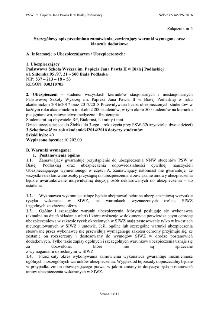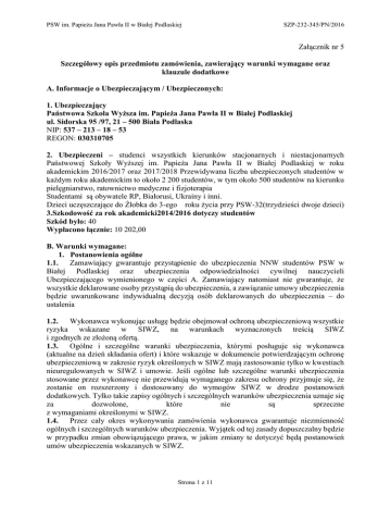 PSW im. Papieża Jana Pawła II w Białej Podlaskiej SZP-232-345/PN/2016 Załącznik nr 5 Szczegółowy opis przedmiotu zamówienia, zawierający warunki wymagane oraz klauzule dodatkowe A. Informacje o Ubezpieczającym / Ubezpieczonych: 1. Ubezpieczający Państwowa Szkoła Wyższa im. Papieża Jana Pawła II w Białej Podlaskiej ul. Sidorska 95 /97, 21 – 500 Biała Podlaska NIP: 537 – 213 – 18 – 53 REGON: 030310705 2. Ubezpieczeni – studenci wszystkich kierunków stacjonarnych i niestacjonarnych Państwowej Szkoły Wyższej im. Papieża Jana Pawła II w Białej Podlaskiej w roku akademickim 2016/2017 oraz 2017/2018 Przewidywana liczba ubezpieczonych studentów w każdym roku akademickim to około 2 200 studentów, w tym około 500 studentów na kierunku pielęgniarstwo, ratownictwo medyczne i fizjoterapia Studentami są obywatele RP, Białorusi, Ukrainy i inni. Dzieci uczęszczające do Żłobka do 3-ego roku życia przy PSW-32(trzydzieści dwoje dzieci) 3.Szkodowość za rok akademicki2014/2016 dotyczy studentów Szkód było: 40 Wypłacono łącznie: 10 202,00 B. Warunki wymagane: 1. Postanowienia ogólne 1.1. Zamawiający gwarantuje przystąpienie do ubezpieczenia NNW studentów PSW w Białej Podlaskiej oraz ubezpieczenia odpowiedzialności cywilnej nauczycieli Ubezpieczającego wymienionego w części A. Zamawiający natomiast nie gwarantuje, że wszystkie deklarowane osoby przystąpią do ubezpieczenia, a zawiązanie umowy ubezpieczenia będzie uwarunkowane indywidualną decyzją osób deklarowanych do ubezpieczenia – do ustalenia 1.2. Wykonawca wykonując usługę będzie obejmował ochroną ubezpieczeniową wszystkie ryzyka wskazane w SIWZ, na warunkach wyznaczonych treścią SIWZ i zgodnych ze złożoną ofertą. 1.3. Ogólne i szczególne warunki ubezpieczenia, którymi posługuje się wykonawca (aktualne na dzień składania ofert) i które wskazuje w dokumencie potwierdzającym ochronę ubezpieczeniową w zakresie ryzyk określonych w SIWZ mają zastosowanie tylko w kwestiach nieuregulowanych w SIWZ i umowie. Jeśli ogólne lub szczególne warunki ubezpieczenia stosowane przez wykonawcę nie przewidują wymaganego zakresu ochrony przyjmuje się, że zostanie on rozszerzony i dostosowany do wymogów SIWZ w drodze postanowień dodatkowych. Tylko takie zapisy ogólnych i szczególnych warunków ubezpieczenia uznaje się za dozwolone, które nie są sprzeczne z wymaganiami określonymi w SIWZ. 1.4. Przez cały okres wykonywania zamówienia wykonawca gwarantuje niezmienność ogólnych i szczególnych warunków ubezpieczenia. Wyjątek od tej zasady dopuszczalny będzie w przypadku zmian obowiązującego prawa, w jakim zmiany te dotyczyć będą postanowień umów ubezpieczenia wskazanych w SIWZ. Strona 1 z 11 PSW im. Papieża Jana Pawła II w Białej Podlaskiej SZP-232-345/PN/2016 1.5. Zamawiający nie stawia jednak wymogu, aby wykonawca posiadał ogólne warunki ubezpieczenia dla każdego rodzaju ubezpieczenia wskazanego w opisie przedmiotu zamówienia, z uwagi na fakt, że postanowienia SIWZ i umowy mają pierwszeństwo przed ustaleniami tego rodzaju dokumentów. W przypadku braku warunków odpowiadających ubezpieczeniu zawartemu w SIWZ w sprawach nieuregulowanych przez zamawiającego będą miały zastosowanie wyłącznie obowiązujące przepisy prawa, w szczególności Kodeksu cywilnego oraz ewentualnie inne ogólne lub szczególne warunki ubezpieczenia wskazane przez wykonawcę, w zakresie niestojącym w sprzeczności z wymaganiami SIWZ. 1.6. Wykonawca gwarantuje niezmienność warunków, stawek i składek rocznych wynikających złożonej oferty, przez cały okres wykonywania zamówienia i we wszystkich rodzajach ubezpieczeń. 1.7. Wykonawca akceptuje proporcjonalną zmianę ceny ochrony ubezpieczeniowej w stosunku do ceny ofertowej z uwagi na zmienność w czasie ilości ubezpieczonych osób. 1.8. W przypadku, gdy ogólne lub szczególne warunki ubezpieczenia przewidują odmowę lub ograniczenie wypłaty świadczenia lub ograniczenie bądź zawieszenie ochrony ubezpieczeniowej z powodu niedopełnienia przez zamawiającego wymienionych w nich obowiązków, nie będą miały one zastosowania jeśli ich niedopełnienie nie było obarczone winą umyślną lub nie miało wpływu na wystąpienie lub rozmiar zdarzenia skutkującego wypłatą świadczenia. Powyższe stosuje się również do nieprzekazania lub przekazania z opóźnieniem wykonawcy istotnych informacji mających związek z umową ubezpieczenia. 1.9. W przygotowaniu programu ubezpieczeniowego (szczegółowego opisu przedmiotu zamówienia), doprowadzeniu do zawarcia umów ubezpieczenia, czynnościach przygotowawczych do zawarcia umów ubezpieczenia oraz zawieraniu i obsłudze ubezpieczeń uczestniczy i pośredniczy broker ubezpieczeniowy, Inter-Broker sp. z o.o., z siedzibą w Toruniu. Wykonawca wynagradza prowizyjnie Inter-Broker sp. z o.o. z siedzibą w Toruniu według stawek zwyczajowo przyjętych dla firm brokerskich przez cały okres obowiązywania umowy na wykonanie zamówienia wynikający z SIWZ. 1. Definicje 1.1. Ubezpieczający – Państwowa Szkoła Wyższa im. Papieża Jana Pawła II w Białej Podlaskiej, która zawiera umowę dobrowolnego, grupowego ubezpieczenia NNW w imieniu ubezpieczonych studentów i dzieci w żłobku. 1.2. Ubezpieczony – osoba fizyczna (student oraz dziecko uczęszczające do żłobka PSW im. Papieża Jana Pawła II w Białej Podlaskiej), która jest objęta ochroną ubezpieczeniową. 1.3. Uprawniony - osoba upoważniona do otrzymania świadczenia w razie śmierci Ubezpieczonego; w przypadku nie wyznaczenia osoby uprawnionej świadczenie przysługuje członkom rodziny Ubezpieczonego według następującej kolejności: małżonkowi, dzieciom, rodzicom, innym ustawowym spadkobiercom w kolejności przewidzianej prawem spadkowym; jeżeli świadczenie przysługuje kilku osobom, to jego wysokość dzieli się między te osoby w równych częściach. 1.4. Nieszczęśliwy wypa