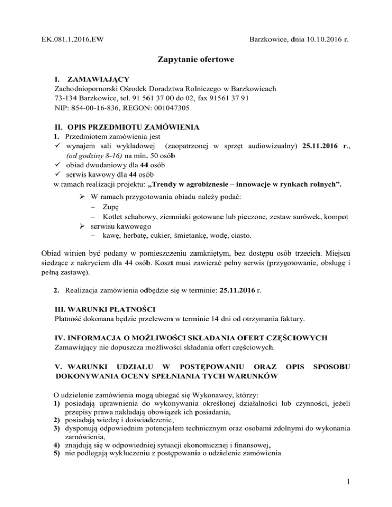 EK.081.1.2016.EW Barzkowice, dnia 10.10.2016 r. Zapytanie ofertowe I. ZAMAWIAJĄCY Zachodniopomorski Ośrodek Doradztwa Rolniczego w Barzkowicach 73-134 Barzkowice, tel. 91 561 37 00 do 02, fax 91561 37 91 NIP: 854-00-16-836, REGON: 001047305 II. OPIS PRZEDMIOTU ZAMÓWIENIA 1. Przedmiotem zamówienia jest wynajem sali wykładowej (zaopatrzonej w sprzęt audiowizualny) 25.11.2016 r., (od godziny 8-16) na min. 50 osób obiad dwudaniowy dla 44 osób serwis kawowy dla 44 osób w ramach realizacji projektu: „Trendy w agrobiznesie – innowacje w rynkach rolnych”. W ramach przygotowania obiadu należy podać: Zupę Kotlet schabowy, ziemniaki gotowane lub pieczone, zestaw surówek, kompot serwisu kawowego kawę, herbatę, cukier, śmietankę, wodę, ciasto. Obiad winien być podany w pomieszczeniu zamkniętym, bez dostępu osób trzecich. Miejsca siedzące z nakryciem dla 44 osób. Koszt musi zawierać pełny serwis (przygotowanie, obsługę i pełną zastawę). 2. Realizacja zamówienia odbędzie się w terminie: 25.11.2016 r. III. WARUNKI PŁATNOŚCI Płatność dokonana będzie przelewem w terminie 14 dni od otrzymania faktury. IV. INFORMACJA O MOŻLIWOŚCI SKŁADANIA OFERT CZĘŚCIOWYCH Zamawiający nie dopuszcza możliwości składania ofert częściowych. V. WARUNKI UDZIAŁU W POSTĘPOWANIU ORAZ DOKONYWANIA OCENY SPEŁNIANIA TYCH WARUNKÓW OPIS SPOSOBU O udzielenie zamówienia mogą ubiegać się Wykonawcy, którzy: 1) posiadają uprawnienia do wykonywania określonej działalności lub czynności, jeżeli przepisy prawa nakładają obowiązek ich posiadania, 2) posiadają wiedzę i doświadczenie, 3) dysponują odpowiednim potencjałem technicznym oraz osobami zdolnymi do wykonania zamówienia, 4) znajdują się w odpowiedniej sytuacji ekonomicznej i finansowej, 5) nie podlegają wykluczeniu z postępowania o udzielenie zamówienia 1 Zamawiający uzna, iż wykonawca spełnia warunki udziału w postępowaniu w momencie, gdy złoży oświadczenie o spełnieniu warunków udziału w postępowaniu. Ocena spełnienia tego warunku, przeprowadzona będzie według reguły: spełnia/nie spełnia. VII. KRYTERIA OCENY OFERT Zamawiający dokona oceny ważnych ofert na podstawie następujących kryteriów: Cena brutto oferty - waga 100% Ocena ofert w zakresie przedstawionego kryterium cena brutto, zostanie dokonana wg następujących zasad: Oferta może uzyskać 100 punktów. Ocena punktowa kryterium dokonana zostanie zgodnie z formułą: cena min. C= -------------------- x 100 pkt cena oferty C - ilość punktów przyznana ocenianej ofercie w ramach kryterium cena brutto za realizację zamówienia cena min. - najniższa cena brutto zaoferowana w złożonych ofertach cena oferty - cena brutto oferty ocenianej VIII. MIEJSCE ORAZ TERMIN SKŁADANIA OFERT 1. Oferta powinna być przesłana za pośrednictwem: poczty, kuriera, drogą elektroniczną lub też dostarczona osobiście na adres: Zachodniopomorski Ośrodek Doradztwa Rolniczego w Barzkowicach, 73-134 Barzkowice lub adres e-mail: [email protected] do dnia 18.10.2016 r. do godz. 9:00. 2. Oferty złożone po terminie nie będą rozpatrywane. IX. OPIS SPOSOBU PRZYGOTOWANIA OFERTY Oferta powinna zawierać: - dane Wykonawcy - adres lub siedzibę, numer telefonu, numer NIP, adres e-mail, - datę sporządzenia oferty, - podpis wykonawcy - wartość oferty brutto, wartość oferty netto oraz wartość podatku VAT (cena podana w ofercie nie może zawierać kosztów ubezpieczenia, cła i akcyzy) - termin ważności oferty X. INFORMACJE DOTYCZĄCE WYBORU NAJKORZYSTNIEJSZEJ OFERTY O wyborze najkorzystniejszej oferty Zamawiający zawiadomi za pośrednictwem poczty elektronicznej wszystkich potencjalnych wykonawców, do których zostało przesłane zapytanie ofertowe oraz wszystkich potencjalnych wykonawców, którzy złożyli ofertę, a także opublikuje informację na własnej stronie internetowej. XI. DODATKOWE INFORMACJE Dodatkowych informacji udziela Ewa Wenc pod numerem telefonu 91 479 40 20 w godz. od 7.30 – 15.30, e-mail: [email protected] . 2