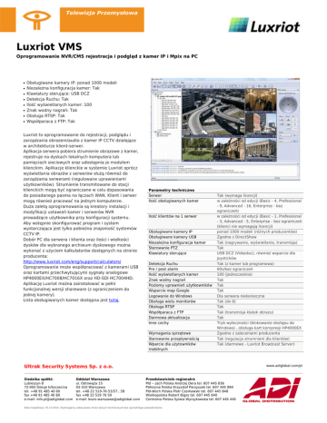 Luxriot VMS Oprogramowanie NVR/CMS rejestracja i podgląd z kamer IP i Mpix na PC ● ● ● ● ● ● ● ● Obsługiwane kamery IP: ponad 1000 modeli Niezależna konfiguracja kamer: Tak Klawiatury sterujące: USB DCZ Detekcja Ruchu: Tak Ilość wyświetlanych kamer: 100 Znak wodny nagrań: Tak Obsługa RTSP: Tak Współparaca z FTP: Tak Luxriot to oprogramowanie do rejestracji, podglądu i zarządzania obrazem/audio z kamer IP CCTV działające w architekturze klient-serwer. Aplikacja serwera pobiera strumienie obrazowe z kamer, rejestruje na dyskach lokalnych komputera lub pamięciach sieciowych oraz udostępnia je modułom klienckim. Aplikacje klienckie w systemie Luxriot oprócz wyświetlania obrazów z serwerów służą również do zarządzania serwerami (regulowane uprawieniami użytkowników). Strumienie transmitowane do stacji klienckich mogą być ograniczane w celu dopasowania do posiadanego pasma na łączach WAN. Klient i serwer mogą również pracować na jednym komputerze. Duża zaletą oprogramowania są kreatory instalacji i modyfikacji ustawień kamer i serwerów NVR prowadzące użytkownika przy konfiguracji systemu. Aby wstępnie skonfigurować program i system wystarczająca jest tylko pobieżna znajomość systemów CCTV IP. Dobór PC dla serwera i klienta oraz ilości i wielkości dysków dla wybranego archiwum dyskowego można wykonać z użyciem kalkulatorów dostępnych na stronie producenta: http://www.luxriot.com/eng/support/calculators/ Oprogramowanie może współpracować z kamerami USB oraz kartami przechwytującymi sygnały analogowe HP4000EX/HC7008/HC7016X oraz HD-SDI HC7004HD. Aplikację Luxriot można zainstalować w pełni funkcjonalnej wersji shareware (z ograniczeniem do jednej kamery). Lista obsługiwanych kamer dostępna jest tutaj. Parametry techniczne Serwer Ilość obsługiwanych kamer Ilość klientów na 1 serwer Obsługiwane kamery IP Obsługiwane kamery USB Niezależna konfiguracja kamer Sterowanie PTZ Klawiatury sterujące Detekcja Ruchu Pre / post alarm Ilość wyświetlanych kamer Znak wodny nagrań Poziomy uprawnień użytkowników Wsparcie map Google Logowanie do Windows Obsługa wielu monitorów Obsługa RTSP Współparaca z FTP Darmowa aktualizacja Inne cechy Wymagania sprzętowe Sterowanie przepływnością Wparcie dla użytowników mobilnych Tak (wymaga licencji) w zależności od edycji (Basic - 4, Prefessional - 9, Advanced - 16, Enterprise - bez ograniczeń) w zależności od edycji (Basic - 1, Prefessional - 3, Advanced - 5, Enterprise - bez ograniczeń (klienci nie wymagają licencji) ponad 1000 modeli (różnych producentów) Zgodne z DirectShow Tak (nagrywanie, wyświetlanie, transmisja) Tak USB DCZ (Videotec), również wsparcie dla joysticków Tak (z kamer lub programowa) 60s/bez ograniczeń 100 (jednocześnie) Tak Tak Tak Dla serwera niekonieczne Tak (do 6) Tak Tak (transmisja klatek obrazu) Tak Tryb wyłaczności (blokowanie dostępu do Windows) , obsługa kart kompresji HP4000EX Zgodne z zaleceniami producenta Tak (regulacja strumnieni dla klientów) Tak (darmowe - Luxriot Broadcast Server) www.adiglobal.com/pl Ultrak Security Systems Sp. z o.o. Siedziba spółki: Lubieszyn 8 72-002 Dołuje k/Szczecina tel. +48 91 485 40 60 fax +48 91 485 40 80 e-mail: [email protected] Oddział Warszawa ul. Odrowąża 15 03-310 Warszawa tel. +48 22 519-76-53/57...58 fax +48 22 519 76 59 e-mail: [email protected] Przedstawiciele regionalni: Płd – zach Polska Andrzej Dera tel. 607 445 836 Północna Polska Krzysztof Parzyszek tel. 607 445 894 Płd-Wsch Polska Piotr Czerkawski tel. 607 445 848 Wielkopolska Robert Bigos tel. 607 445 640 Centralna Polska Sylwia Wyrzykowska tel. 607 445 445 Data modyfikacji: 25.12.2012. Zastrzegamy sobie prawo zmian danych technicznych bez uprzedniego powiadomienia.
