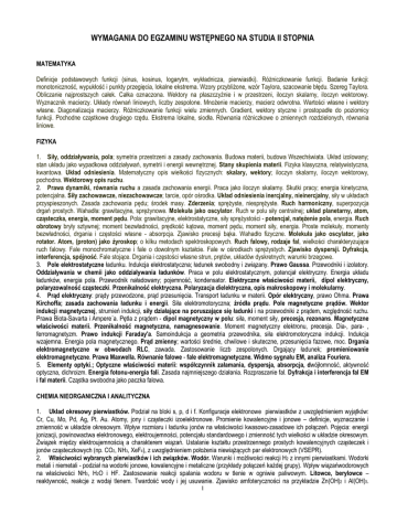 WYMAGANIA DO EGZAMINU WSTĘPNEGO NA STUDIA II STOPNIA MATEMATYKA Definicje podstawowych funkcji (sinus, kosinus, logarytm, wykładnicza, pierwiastki). Różniczkowanie funkcji. Badanie funkcji: monotoniczność, wypukłość i punkty przegięcia, lokalne ekstrema. Wzory przybliżone, wzór Taylora, szacowanie błędu. Szereg Taylora. Obliczanie najprostszych całek. Całka oznaczona. Wektory na płaszczyźnie i w przestrzeni, iloczyn skalarny, iloczyn wektorowy. Wyznacznik macierzy. Układy równań liniowych, liczby zespolone. Mnożenie macierzy, macierz odwrotna. Wartości własne i wektory własne. Diagonalizacja macierzy. Różniczkowanie funkcji wielu zmiennych. Gradient, wektory styczne i prostopadłe do poziomicy funkcji. Pochodne cząstkowe drugiego rzędu. Ekstrema lokalne, siodła. Równania różniczkowe o zmiennych rozdzielonych, równania liniowe. FIZYKA 1. Siły, oddziaływania, pola; symetria przestrzeni a zasady zachowania. Budowa materii, budowa Wszechświata. Układ izolowany; stan układu jako wypadkowa oddziaływań, symetrii i energii wewnętrznej. Stany skupienia materii. Fizyka klasyczna, relatywistyczna, kwantowa. Układ odniesienia. Matematyczny opis wielkości fizycznych: skalary, wektory; iloczyn skalarny, iloczyn wektorowy, pochodna. Wektorowy opis ruchu. 2. Prawa dynamiki, równania ruchu a zasada zachowania energii. Praca jako iloczyn skalarny. Skutki pracy; energia kinetyczna, potencjalna. Siły zachowawcze, niezachowawcze; tarcie, opór ośrodka. Układ odniesienia inercjalny, nieinercjalny, siły w układach przyspieszonych. Zasada zachowania pędu; środek masy. Zderzenia; sprężyste, niesprężyste. Ruch harmoniczny, superpozycja drgań prostych. Wahadła: grawitacyjne, sprężynowe. Molekuła jako oscylator. Ruch w polu siły centralnej; układ planetarny, atom, cząsteczka, energia, moment pędu. Pola: grawitacyjne, elektrostatyczne, siły sprężystości - potencjał, natężenie pola, energia. Ruch obrotowy bryły sztywnej; moment bezwładności, prędkość kątowa, moment pędu, moment siły, energia. Proste molekuły, momenty bezwładności, drgania i częstości własne - absorpcja. Zjawisko precesji bąka. Wahadło fizyczne. Molekuła jako oscylator, jako rotator. Atom, (proton) jako żyroskop; o kilku metodach spektroskopowych. Ruch falowy, rodzaje fal, wielkości charakteryzujące ruch falowy. Fale monochromatyczne i fale o dowolnym kształcie. Fale w ośrodkach sprężystych. Zjawisko dyspersji. Dyfrakcja, interferencja, spójność. Fale stojące. Drgania i częstości własne strun, prętów, układów dyskretnych; warunki brzegowe. 3. Pole elektrostatyczne ładunku. Indukcja elektrostatyczna; ładunek swobodny i związany. Prawo Gaussa. Przewodniki i izolatory. Oddziaływania w chemii jako oddziaływania ładunków. Praca w polu elektrostatycznym, potencjał elektryczny. Energia układu ładunków, energia pola. Przewodnik naładowany; pojemność, kondensator. Elektryczne właściwości materii, dipol elektryczny, polaryzowalność cząsteczki. Przenikalność elektryczna. Polaryzacja dielektryczna, opis makroskopowy i molekularny. 4. Prąd elektryczny: prądy przewodzone, prąd przesunięcia. Transport ładunku w materii. Opór elektryczny, prawo Ohma. Prawa Kirchoffa; zasada zachowania ładunku i energii. Siła elektromotoryczna; źródła prądu. Pole magnetyczne prądów. Wektor indukcji magnetycznej, strumień indukcji, siły działające na poruszające się ładunki i na przewodniki z prądem, względność ruchu. Prawa Biota-Savarta i Ampere´a. Pętla z prądem - dipol magnetyczny w polu: siła, moment siły, precesja, rezonans. Magnetyczne właściwości materii. Przenikalność magnetyczna, namagnesowanie. Moment magnetyczny elektronu, precesja. Dia-, para- , ferromagnetyzm. Prawo indukcji Faraday'a. Samoindukcja a geometria przewodnika, siła elektromotoryczna indukcji. Indukcja wzajemna. Energia pola magnetycznego. Prąd zmienny; wartości średnie, chwilowe i skuteczne, przesunięcia fazowe, moc. Drgania elektromagnetyczne w obwodach RLC, zawada. Zastosowanie liczb zespolonych. Drgający ładunek; promieniowanie elektromagnetyczne. Prawa Maxwella. Równanie falowe - fale elektromagnetyczne. Widmo sygnału EM, analiza Fouriera. 5. Elementy optyki.; Optyczne właściwości materii: współczynnik załamania, dyspersja, absorpcja, dwójłomność, aktywność optyczna, dichroizm. Energia fotonu-energia fali. Zasada najmniejszego działania. Rozpraszanie fal. Dyfrakcja i interferencja fal EM i fal materii. Cząstka swobodna jako paczka falowa. CHEMIA NIEORGANICZNA I ANALITYCZNA 1. Układ okresowy pierwiastków. Podział na bloki s, p, d i f. Konfiguracje elektronowe pierwiastków z uwzględnieniem wyjątków: Cr, Cu, Mo, Pd, Ag, Pt. Au. Atomy, jony i cząsteczki izoelektronowe. Promienie kowalencyjne i jonowe – definicje, wyznaczanie i zmienność w układzie okresowym. Wpływ rozmiaru i ładunku jonów na właściwości kwasowo-zasadowe ich połączeń. Pojęcia: energii jonizacji, powinowactwa elektronowego, elektroujemności, potencjału standardowego i zmienność tych wielkości w układzie okresowym. Związek między elektroujemnością a charakterem wiązań. Ustalanie kształtu przestrzennego prostych kowalencyjnych cząsteczek i jonów cząsteczkowych (np. CO2, NH3, XeF4), z uwzględnieniem położenia niewiążących par elektronowych (VSEPR). 2. Właściwości wybranych pierwiastków i ich związków. Wodór. Warunki i możliwości reakcji H2 z innymi pierwiastkami. Wodorki metali i niemetali - podział na wodorki jonowe, kowalencyjne i metaliczne (przykłady połączeń każdej grupy). Wpływ wiązańwodorowych na właściwości NH3, H2O i HF. Zastosowanie reakcji spalania wodoru w tlenie w ogniwie paliwowym. Litowce, berylowce – reaktywność, reakcje z wodąi tlenem. Twardość wody i jej usuwanie. Zjawisko amfoteryczności na przykładzie Zn(OH)2 i Al(OH)3. 1 Węgiel i krzem. Struktura najważniejszych odmia