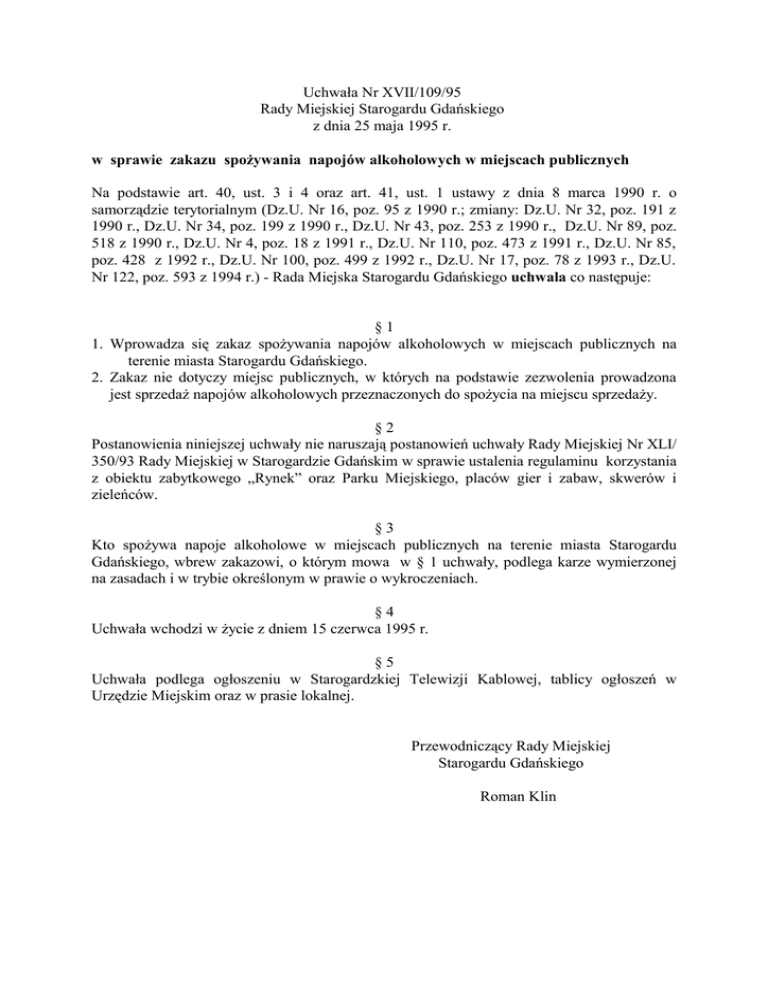 Uchwała Nr XVII/109/95 Rady Miejskiej Starogardu Gdańskiego z dnia 25 maja 1995 r. w sprawie zakazu spożywania napojów alkoholowych w miejscach publicznych Na podstawie art. 40, ust. 3 i 4 oraz art. 41, ust. 1 ustawy z dnia 8 marca 1990 r. o samorządzie terytorialnym (Dz.U. Nr 16, poz. 95 z 1990 r.; zmiany: Dz.U. Nr 32, poz. 191 z 1990 r., Dz.U. Nr 34, poz. 199 z 1990 r., Dz.U. Nr 43, poz. 253 z 1990 r., Dz.U. Nr 89, poz. 518 z 1990 r., Dz.U. Nr 4, poz. 18 z 1991 r., Dz.U. Nr 110, poz. 473 z 1991 r., Dz.U. Nr 85, poz. 428 z 1992 r., Dz.U. Nr 100, poz. 499 z 1992 r., Dz.U. Nr 17, poz. 78 z 1993 r., Dz.U. Nr 122, poz. 593 z 1994 r.) - Rada Miejska Starogardu Gdańskiego uchwala co następuje: §1 1. Wprowadza się zakaz spożywania napojów alkoholowych w miejscach publicznych na terenie miasta Starogardu Gdańskiego. 2. Zakaz nie dotyczy miejsc publicznych, w których na podstawie zezwolenia prowadzona jest sprzedaż napojów alkoholowych przeznaczonych do spożycia na miejscu sprzedaży. §2 Postanowienia niniejszej uchwały nie naruszają postanowień uchwały Rady Miejskiej Nr XLI/ 350/93 Rady Miejskiej w Starogardzie Gdańskim w sprawie ustalenia regulaminu korzystania z obiektu zabytkowego „Rynek” oraz Parku Miejskiego, placów gier i zabaw, skwerów i zieleńców. §3 Kto spożywa napoje alkoholowe w miejscach publicznych na terenie miasta Starogardu Gdańskiego, wbrew zakazowi, o którym mowa w § 1 uchwały, podlega karze wymierzonej na zasadach i w trybie określonym w prawie o wykroczeniach. §4 Uchwała wchodzi w życie z dniem 15 czerwca 1995 r. §5 Uchwała podlega ogłoszeniu w Starogardzkiej Telewizji Kablowej, tablicy ogłoszeń w Urzędzie Miejskim oraz w prasie lokalnej. Przewodniczący Rady Miejskiej Starogardu Gdańskiego Roman Klin Uzasadnienie: W ostatnim okresie nasiliło się spożywanie napojów alkoholowych w miejscach publicznych, na ulicach, placach, skwerach. Osoby spożywające alkohol wywołują różnego rodzaju zdarzenia (bójki, zaczepianie), które zakłócają spokój i porządek publiczny, także ciszę nocną. Zachowanie osób pijących stwarza również zagrożenie zdrowia ludzi, albowiem osoby te dopuszczają się rękoczynów do osób przechodzących w pobliżu. Należy nadmienić, że zagadnienie będące przedmiotem uchwały nie jest uregulowane w innych przepisach prawa. Ustawa z dnia 26 października 1982 r. o wychowaniu w trzeźwości i przeciwdziałaniu alkoholizmowi (Dz.U. Nr 35 poz. 230 z późn. zmianami) reguluje jedynie zakaz sprzedaży w obiektach zamkniętych (art. 14 ust. 1-4) bądź w konkretnych miejscach (art. 14 ust. 5). Nie można wprowadzić zakazu spożywania alkoholu w drodze regulaminu (art. 14 ust. 6) albowiem może on obejmować jedynie określony teren, a nie teren całego miasta. Należy nadmienić, że obowiązkiem władz lokalnych jest utrzymanie porządku publicznego i zapewnienie spokoju mieszkańcom. Publiczne, grupowe spożywanie alkoholu wywołuje zgorszenie i stanowi naruszenie porządku publicznego, świadkami publicznych libacji bywają dzieci. Ratyfikowana przez Polskę konwencja o prawach dziecka nakłada na administrację państw członków obowiązek podejmowania wszelkich środków ochronnych w celu zabezpieczenia interesów dzieci. Wolność osobista w państwie prawa nie ma charakteru absolutnego, co oznacza, że istnieją określone granice korzystania z wolności, które wynikają z konieczności zachowania reguł rządzących wspólnym życiem w każdej zbiorowości ludzi. Tymi zasadami kierował się Sąd Najwyższy w wyroku z dnia 8 kwietnia 1994 r. uchylając wyrok NSA 02 w Katowicach stwierdzający nieważność tego rodzaju uchwały podjętej przez Radę Miasta Kęty. Zgodnie z uchwałą Nr XXIX/215/92 Rady Miejskiej w Kętach z dnia 27 listopada 1992 r. wprowadza się całkowity zakaz spożywania napojów alkoholowych na terenie Rynku w Kętach. Za Zarząd /-/ Paweł Piotr Janikowski członek Zarządu Miejskiego