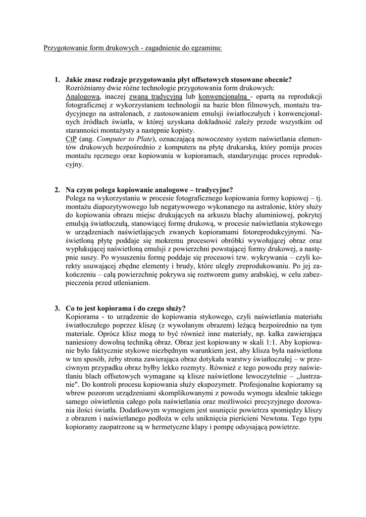 Przygotowanie form drukowych - zagadnienie do egzaminu: 1. Jakie znasz rodzaje przygotowania płyt offsetowych stosowane obecnie? Rozróżniamy dwie różne technologie przygotowania form drukowych: Analogową, inaczej zwaną tradycyjną lub konwencjonalną - opartą na reprodukcji fotograficznej z wykorzystaniem technologii na bazie błon filmowych, montażu tradycyjnego na astralonach, z zastosowaniem emulsji światłoczułych i konwencjonalnych źródłach światła, w której uzyskana dokładność zależy przede wszystkim od staranności montażysty a następnie kopisty. CtP (ang. Computer to Plate), oznaczającą nowoczesny system naświetlania elementów drukowych bezpośrednio z komputera na płytę drukarską, który pomija proces montażu ręcznego oraz kopiowania w kopioramach, standaryzując proces reprodukcyjny. 2. Na czym polega kopiowanie analogowe – tradycyjne? Polega na wykorzystaniu w procesie fotograficznego kopiowania formy kopiowej – tj. montażu diapozytywowego lub negatywowego wykonanego na astralonie, który służy do kopiowania obrazu miejsc drukujących na arkuszu blachy aluminiowej, pokrytej emulsją światłoczułą, stanowiącej formę drukową, w procesie naświetlania stykowego w urządzeniach naświetlających zwanych kopioramami fotoreprodukcyjnymi. Naświetloną płytę poddaje się mokremu procesowi obróbki wywołującej obraz oraz wypłukującej naświetloną emulsji z powierzchni powstającej formy drukowej, a następnie suszy. Po wysuszeniu formę poddaje się procesowi tzw. wykrywania – czyli korekty usuwającej zbędne elementy i brudy, które uległy zreprodukowaniu. Po jej zakończeniu – całą powierzchnię pokrywa się roztworem gumy arabskiej, w celu zabezpieczenia przed utlenianiem. 3. Co to jest kopiorama i do czego służy? Kopiorama - to urządzenie do kopiowania stykowego, czyli naświetlania materiału światłoczułego poprzez kliszę (z wywołanym obrazem) leżącą bezpośrednio na tym materiale. Oprócz klisz mogą to być również inne materiały, np. kalka zawierająca naniesiony dowolną techniką obraz. Obraz jest kopiowany w skali 1:1. Aby kopiowanie było faktycznie stykowe niezbędnym warunkiem jest, aby klisza była naświetlona w ten sposób, żeby strona zawierająca obraz dotykała warstwy światłoczułej – w przeciwnym przypadku obraz byłby lekko rozmyty. Również z tego powodu przy naświetlaniu blach offsetowych wymagane są klisze naświetlone lewoczytelnie – ,,lustrzanie". Do kontroli procesu kopiowania służy ekspozymetr. Profesjonalne kopioramy są wbrew pozorom urządzeniami skomplikowanymi z powodu wymogu idealnie takiego samego oświetlenia całego pola naświetlania oraz możliwości precyzyjnego dozowania ilości światła. Dodatkowym wymogiem jest usunięcie powietrza spomiędzy kliszy z obrazem i naświetlanego podłoża w celu uniknięcia pierścieni Newtona. Tego typu kopioramy zaopatrzone są w hermetyczne klapy i pompę odsysającą powietrze. 4. Na czym polega kopiowanie cyfrowe w technologii CtP? Polega na uzyskaniu obrazu miejsc drukujących na formie drukowej w procesach fotoreprodukcyjnych formy drukowej z pominięciem i bez potrzeby jej wytwarzania, tradycyjnej formy kopiowej na astralonie, na arkuszu blachy aluminiowej, pokrytej termo i fotorozpuszczalną emulsją światłoczułą, w procesie naświetlania bezpośredniego, tzw. CtP, w cyfrowo sterowanych urządzeniach naświetlających, zwanych naświetlarkami fotoreprodukcyjnymi. Naświetloną płytę poddaje się mokremu procesowi obróbki wypłukującej obraz naświetlonej i aktywowanej emulsji z powierzchni powstającej formy drukowej, a następnie suszy i pokrywa się roztworem gumy arabskiej, w celu zabezpieczenia przed utlenianiem. Proces ten ogranicza w znacznym stopniu reprodukowanie błędów co ogranicza do minimum konieczność wykrywania (kasowania błędów). 5. Jakie znasz rodzaje kopiowania? Kopiowanie diapozytywowe – wykorzystuje przy kopiowaniu diapozytywową formę kopiową, która zabezpiecza emulsję płyty przed naświetleniem tylko w miejscach występowania zaczernień na diapozytywach; Kopiowanie negatywowe – wykorzystuje przy kopiowaniu negatywową formę kopiową, która zabezpiecza emulsję płyty przed naświetleniem, naświetlane są tylko miejsca odryte, czyli te, które nie są zaczernione na negatywie. 6. Jakie znasz rodzaje emulsji kopiowych? Emulsje foto i termo rozpuszczalne – są to te, które po naświetleniu i wywołaniu – ulegną rozpuszczeniu i wypłukaniu, odkrywając na powstającej formie drukowej – miejsca niedrukujące; Emulsje foto i termo utwardzalne – są to te, które po naświetleniu i wywołaniu – ulegną utrwaleniu i utwardzeniu, a po rozpuszczeniu i wypłukaniu emulsji nie naświetlonej, na powstającej formie drukowej stworzą – miejsca drukujące; 7. Opisz proces kopiowania konwencjonalnego na płytach presensybilizowanych: - zapoznanie się z kartą technologiczną – (jaka praca, ile płyt, jakiego rodzaju, jakiego formatu, na którą maszynę, itp.); - przeczyszczenie szyby kopioramy – (sprawdzenie stanu czystości i przejrzystości); - zaplanowanie czasu ekspozycji – naświetlania; - wyciągnięcie blachy z opakowania – odrzucenie papierka przekładającego poszczególne sztuki; - wycięcie otworów (perforacja BACHERA) dla systemu szybkiego pasowania; - umieszczenie formy w kopioramie; - przeczyszczenie z brudów montażu jednego koloru; - umieszczenie montażu na bezpośredni na blasze – emulsja formy kopiowej musi stykać się bezpośrednio z emulsją na formie; - spasowanie za pomocą listewki kołów pasujących systemu BACHERA – dla precyzyjnego rozmieszczenia obrazu; - zamknięcie szyby kopioramy – dociśnięcie do płaszcza kopioramy, - załączenie pompy próżniowej dla wyciągnięcia powietrza spomiędzy szyby i guma, dla dokładniejszego dociśnięcia emulsji montażu z emulsją płyty; - rozpoczęcie naświetlania – w jej trakci