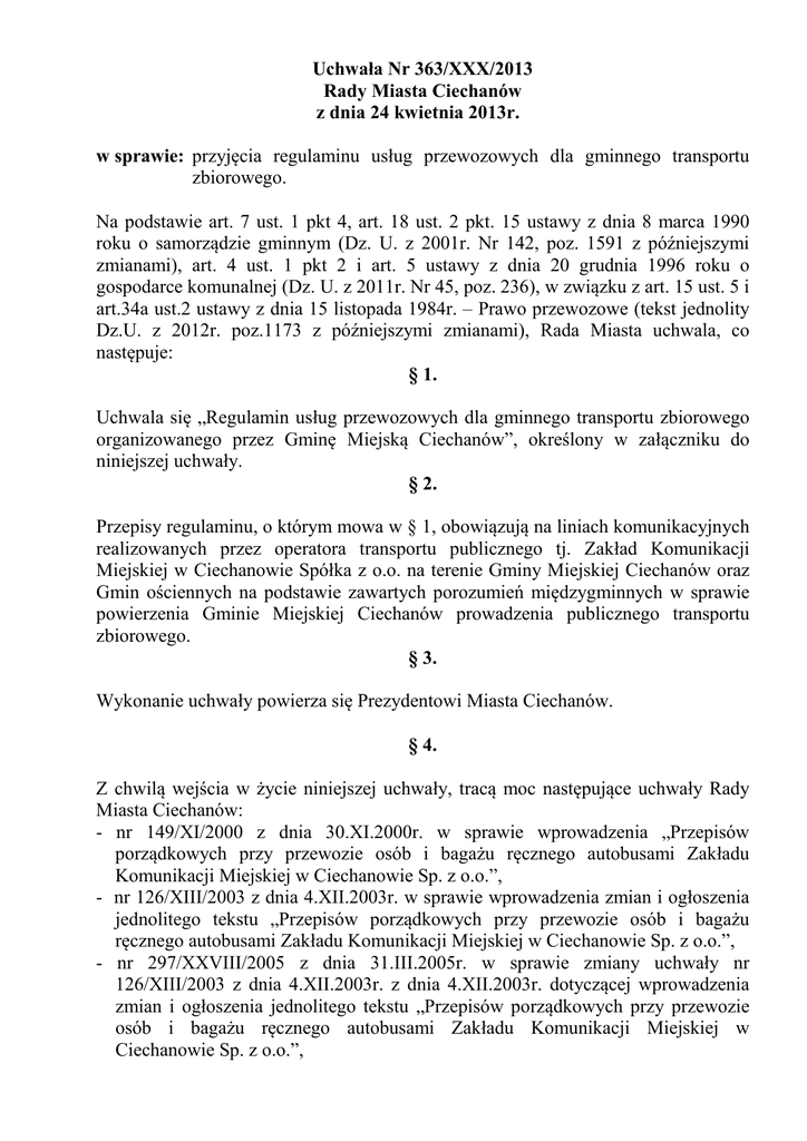 Uchwała Nr 363/XXX/2013 Rady Miasta Ciechanów z dnia 24 kwietnia 2013r. w sprawie: przyjęcia regulaminu usług przewozowych dla gminnego transportu zbiorowego. Na podstawie art. 7 ust. 1 pkt 4, art. 18 ust. 2 pkt. 15 ustawy z dnia 8 marca 1990 roku o samorządzie gminnym (Dz. U. z 2001r. Nr 142, poz. 1591 z późniejszymi zmianami), art. 4 ust. 1 pkt 2 i art. 5 ustawy z dnia 20 grudnia 1996 roku o gospodarce komunalnej (Dz. U. z 2011r. Nr 45, poz. 236), w związku z art. 15 ust. 5 i art.34a ust.2 ustawy z dnia 15 listopada 1984r. – Prawo przewozowe (tekst jednolity Dz.U. z 2012r. poz.1173 z późniejszymi zmianami), Rada Miasta uchwala, co następuje: § 1. Uchwala się „Regulamin usług przewozowych dla gminnego transportu zbiorowego organizowanego przez Gminę Miejską Ciechanów”, określony w załączniku do niniejszej uchwały. § 2. Przepisy regulaminu, o którym mowa w § 1, obowiązują na liniach komunikacyjnych realizowanych przez operatora transportu publicznego tj. Zakład Komunikacji Miejskiej w Ciechanowie Spółka z o.o. na terenie Gminy Miejskiej Ciechanów oraz Gmin ościennych na podstawie zawartych porozumień międzygminnych w sprawie powierzenia Gminie Miejskiej Ciechanów prowadzenia publicznego transportu zbiorowego. § 3. Wykonanie uchwały powierza się Prezydentowi Miasta Ciechanów. § 4. Z chwilą wejścia w życie niniejszej uchwały, tracą moc następujące uchwały Rady Miasta Ciechanów: - nr 149/XI/2000 z dnia 30.XI.2000r. w sprawie wprowadzenia „Przepisów porządkowych przy przewozie osób i bagażu ręcznego autobusami Zakładu Komunikacji Miejskiej w Ciechanowie Sp. z o.o.”, - nr 126/XIII/2003 z dnia 4.XII.2003r. w sprawie wprowadzenia zmian i ogłoszenia jednolitego tekstu „Przepisów porządkowych przy przewozie osób i bagażu ręcznego autobusami Zakładu Komunikacji Miejskiej w Ciechanowie Sp. z o.o.”, - nr 297/XXVIII/2005 z dnia 31.III.2005r. w sprawie zmiany uchwały nr 126/XIII/2003 z dnia 4.XII.2003r. z dnia 4.XII.2003r. dotyczącej wprowadzenia zmian i ogłoszenia jednolitego tekstu „Przepisów porządkowych przy przewozie osób i bagażu ręcznego autobusami Zakładu Komunikacji Miejskiej w Ciechanowie Sp. z o.o.”, - nr 22/III/2006 z dnia 28 grudnia 2006r. w sprawie zmian w uchwale nr 297/XXVIII/2005 z dnia 31.03.2005r. dotyczącej ogłoszenia jednolitego tekstu „Przepisów porządkowych przy przewozie osób, zabranych ze sobą do przewozu rzeczy i zwierząt autobusami Zakładu Komunikacji Miejskiej w Ciechanowie Spółka z o.o.”, - nr 333/XXXVI/2009 Rady Miasta Ciechanów z dnia 25 czerwca 2009r. w sprawie wprowadzenia zmian i ogłoszenia jednolitego tekstu „Przepisów porządkowych przy przewozie osób, zabranych ze sobą do przewozu rzeczy i zwierząt autobusami Zakładu Komunikacji Miejskiej w Ciechanowie Spółka z o.o.” § 5. Uchwała wchodzi w życie po upływie 14 dni od ogłoszenia w Dzienniku Urzędowym Województwa Mazowieckiego z mocą obowiązującą od 01 czerwca 2013r. Przewodniczący Rady Miasta Ciechanów Mariusz Stawicki Załącznik do uchwały Nr 363/XXX/2013 Rady Miasta Ciechanów z dnia 24 kwietnia 2013r. Regulamin usług przewozowych dla gminnego transportu zbiorowego organizowanego przez Gminę Miejską Ciechanów Rozdział I Przepisy ogólne § 1. 1.Regulamin usług przewozowych dla gminnego transportu zbiorowego organizowanego przez Gminę Miejską Ciechanów, zwany dalej regulaminem, określa przepisy porządkowe oraz warunki przewozu osób i bagażu środkami lokalnego transportu zbiorowego Zakładu Komunikacji Miejskiej w Ciechanowie Spółka z o.o. 2.Przepisy regulaminu obowiązują na liniach komunikacyjnych realizowanych przez operatora transportu publicznego tj. Zakład Komunikacji Miejskiej w Ciechanowie Spółka z o.o. na terenie Gminy Miejskiej Ciechanów oraz Gmin ościennych na podstawie zawartych porozumień międzygminnych w sprawie powierzenia Gminie Miejskiej Ciechanów prowadzenia publicznego transportu zbiorowego. 3. Użyte w regulaminie określenia oznaczają: 1) ZKM – Zakład Komunikacji Miejskiej w Ciechanowie Spółka z o.o. 06-400 Ciechanów, ul. Gostkowska 83, 2) organizator transportu publicznego – Gmina Miejska Ciechanów w imieniu której zadania organizatora wykonuje Prezydent Miasta Ciechanów (w myśl ustawy z dnia 16 grudnia 2010r. o publicznym transporcie zbiorowym – Dz. U. z 2011r. Nr 5, poz. 13 z późn. zm.), 3) operator transportu publicznego – Zakład Komunikacji Miejskiej w Ciechanowie Spółka z o.o. , zwany dalej Operatorem (w rozumieniu art.4 ust.1 pkt 8 ustawy z dnia 16 grudnia 2010r. o publicznym transporcie drogowym), 4) strefa taryfowa – obszar terytorialny na terenie którego można podróżować na podstawie określonego dla danej strefy taryfowej rodzaju biletu, 5) przystanek „na żądanie” ( skrót NŻ ) - przystanek , na którym autobus zatrzymuje się wyłącznie wtedy , gdy potrzeba wsiadania lub wysiadania jest zasygnalizowana przez podróżnych. Pasażer informuje kierującego pojazdem , że chce wsiąść podnosząc wysoko rękę, a żeby wysiąść naciska odpowiedni przycisk, 6) bilet – dokument uprawniający do przewozu, wg cennika określonego w odrębnej uchwale Rady Miasta Ciechanów, 7) rodzaj biletu – zbiór cech biletu określający jego wartość oraz okres ważności (w przypadku biletów krótko- i długookresowych), 8) bilet na okaziciela – bilet uprawniający do przejazdu każdą osobę będącą w jego posiadaniu, 9) bilet imienny – bilet uprawniający do przejazdu wskazaną na nim osobę, 10)skasowanie biletu – nadanie biletowi ważności przez umieszczenie biletu jednorazowego w kasowniku i uzyskanie na nim odpowiedniego zapisu, 11) pojazd - środek transportu ( autobus ) wykorzystywany przez operatora w lokalnym transporcie zbiorowym skierowany do obsługi pasażerów, 12) przewóz – transport osób oraz bagażu wykonywany przez operatora transportu publicznego , wg zasad określonych w ni
