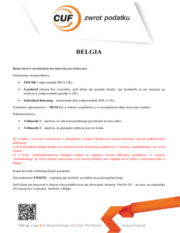 BELGIA DOKUMETY POTRZEBE DO ODZYSKAIA PODATKU: Dokumenty od pracodawcy : • FISCHE ( odpowiednik P60 w UK) • Loonbrief (muszą być wszystkie, jeśli klient nie posiada choćby 1go loonbrefia to nie możemy go rozliczyć), (odpowiednik payslip w UK) • Individual Rekening – zestawienie płac (odpowiednik SOE w UK) Formularz zgłoszeniowy – MUSI być w całości wypełniony a w szczególności dane dotyczące rodziny. Pełnomocnictwa • Vollmacht 1 – sprawia, że cała korespondencja przychodzi na nasz adres • Vollmacht 2 – sprawia, że pieniądze trafią na nasz nr konta. W związku z nowymi wytycznymi w Belgijskim Urzędzie Skarbowym został zmieniony sposób podpisywania deklaracji. a) Kawaler/panna składa podpis na ostatniej stronie deklaracji podatkowej w miejscu „handtekening” po lewej stronie. b) Z kolei współmałżonkowie składają podpis na ostatniej stronie deklaracji podatkowe w miejscu „handtekening” po lewej stronie mężczyzna, a po prawej kobieta, bez względu na to, które z nich pracowało w Belgii. Kopia dowodu osobistego/kopia paszportu Zaświadczenie EWR/EU – najlepiej jak dochody są rozbite na poszczególne kraje Jeśli klient nie pracował w danym roku podatkowym ma obowiązek złożenia Pitu36+ZG – na zero, na załączniku ZG muszą być wykazane dochody z Belgii Ksero PIT 36/37/40/40A/11 i innych PITów wraz z załącznikami za dany rok podatkowy klienta i współmałżonka oraz wszystkie karty podatkowe ze wszystkich krajów w których pracował klient i współmałżonek w danym roku podatkowym Zaświadczenie o zameldowaniu na dzień 01.01.2011 (dotyczy rozliczenia za 2010 rok) oraz na dzień 01.01.2012 r. ( dotyczy rozliczenia za 2011 rok) itd.. Zaświadczenie potwierdzające zameldowanie klienta ze współmałżonkiem i dziećmi będącymi na utrzymaniu (jeżeli dotyczy) Jeżeli dotyczy – dołączyć kopię PIT- 28 i /lub zaświadczenie z urzędu gminy, z którego wynika, czy klient płaci podatek należny w przypadku prowadzenia działalności rolniczej (wraz z informacją o zryczałtowanych dochodach z działalności rolniczej) za dany rok podatkowy Jeżeli dotyczy – dołączyć kopię ZAS-DF - zaświadczenie o wysokości dochodu podatnika w podatku dochodowym od osób fizycznych za dany rok podatkowy Jeśli klient miał dochody poza Belgią to oprócz Pitów musi przedstawić wszystkie karty podatkowe. Tak samo współmałżonek. W związku z rosnącą ilością klientów, którzy osiągnęli dochody poza Belgią oraz licznymi roszczeniami urzędników belgijskich w sprawie niejasności tych dochodów informujemy, że składając belgijską deklaracje podatkową występuje obowiązek wykazania wszystkich dochodów z wszystkich krajów. W tym przypadku wszystkimi dochodami zagranicznymi są wszystkie dochody uzyskane poza Belgią za dany rok rozliczeniowy, czyli np.: dochody z Polski, Niemiec, Wielkiej Brytanii, Holandii itd. Dotyczy to również współmałżonka. Próba zatajenia tych informacji o dochodach z innych krajów będzie skutkować utratą praw do jakichkolwiek ulg oraz karą finansową(belgijski Urząd Skarbowy weryfikuje dane zawarte w deklaracji z Urzędami Skarbowymi w innych państwach). W związku z tym należy przedstawić wszystkie dowody świadczące o uzyskanych dochodach poza Belgią. Można tego dokonać przedstawiając wszelkie karty podatkowe z wszystkich krajów, w którym się pracowało w danym roku rozliczeniowym. Dodatkowo należy przedstawić wszystkie polskie PIT-y i druk EU/EWR potwierdzony przez Polski Urząd Skarbowy. Dotyczy to zarówno klienta, jaki w współmałżonka. Jeśli klient ma małżonka to MUSI się z nim rozliczać. W Belgii jest obowiązek wspólnego rozliczenia ! Oprócz standardowych dokumentów dla wnioskodawcy, małżonek musi dostarczyć: • Pełnomocnictwa • Forma na dany rok podatkowy MUSI być podpisana wspólnie • Kopia dowodu osobistego/kopia paszportu • Zaświadczenie EWR/EU – najlepiej jak dochody są rozbite na poszczególne kraje • Kopia Pitów j/w I@FORMACJE OGÓL@E: • Rozliczenie w Belgii jest obowiązkowe – ok. 10% spraw to niedopłaty, reszta głownie kończy się zwrotem • Rozliczamy 3 lata wstecz ( do końca 2013 rozliczamy 2010) • W ciągu tych 3 lat US albo wysyła informację, żeby się rozliczyć , albo od razu sam rozlicza na podstawie danych, które posiada. Analogicznie jak w Norwegii może to być rozliczenie niekorzystne dla klienta. • Rok rozliczeniowy trwa od 01.01.do 31.12 • Kwota wolna od podatku to 6150 euro WARU@EK: aby ją otrzymać dochody belgijskie muszą wynieść 75% ogólnych dochodów klienta • Jeśli osoby żyją w konkubinacie i mają dziecko to muszą podać: o kto jest ojcem/matką dziecka, o czy żyją wspólnie, o kto wychowuje dziecko, o czy są zasądzone alimenty i w jakiej kwocie • Jeśli osoba samotnie wychowuje dziecko to oprócz danych powyżej potrzebna jest data od kiedy dziecko jest z tą osobą. • Jeżeli klient jest w separacji, po rozwodzie, wdowiec potrzebna informacja dokładnie od kiedy, bo to ma wpływ na rozliczenie, • @ależy podać zawód wykonywany w Belgii, niektóre zawody są objęte dodatkową ulgą • Dzieci: o należy podać wszystkie do 26 roku życia i daty urodzenia UWAGA! Podajemy dzieci które są na utrzymaniu rodziców, o na dzieci przysługuje ulga, o jeśli dziecko ma stopień niepełnosprawności to jest to dodatkowo uznawane, klient musi to zaznaczyć w ankiecie, o jeżeli klient jest w separacji, po rozwodzie - to u kogo są dzieci i czy mąż płaci na dzieci, alimenty, udokumentowane, • Ulga na dziecko, to sytuacja jest dość skomplikowana, bo to zależy od wielu zmiennych, przede wszystkim od sytuacji majątkowej rodziny i "składu" rodziny. • • • W typowym, bardzo uproszczonym przypadku ulga ta jest przyznawana dopiero po przekroczeniu 75% dochodów belgijskich w dochodach ogółem, na wszystkie dzieci do 18 lat. Za pracę sezonową zazwycza