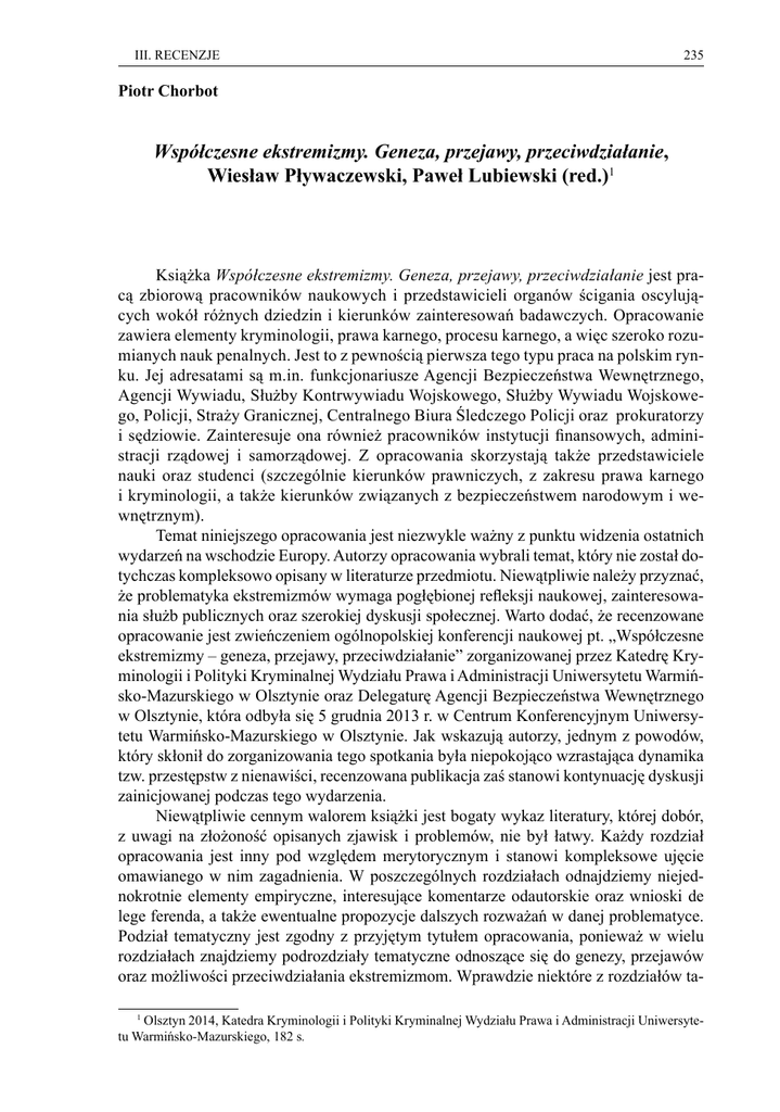III. RECENZJE 235 Piotr Chorbot Współczesne ekstremizmy. Geneza, przejawy, przeciwdziałanie, Wiesław Pływaczewski, Paweł Lubiewski (red.)1 Książka Współczesne ekstremizmy. Geneza, przejawy, przeciwdziałanie jest pracą zbiorową pracowników naukowych i przedstawicieli organów ścigania oscylujących wokół różnych dziedzin i kierunków zainteresowań badawczych. Opracowanie zawiera elementy kryminologii, prawa karnego, procesu karnego, a więc szeroko rozumianych nauk penalnych. Jest to z pewnością pierwsza tego typu praca na polskim rynku. Jej adresatami są m.in. funkcjonariusze Agencji Bezpieczeństwa Wewnętrznego, Agencji Wywiadu, Służby Kontrwywiadu Wojskowego, Służby Wywiadu Wojskowego, Policji, Straży Granicznej, Centralnego Biura Śledczego Policji oraz prokuratorzy i sędziowie. Zainteresuje ona również pracowników instytucji finansowych, administracji rządowej i samorządowej. Z opracowania skorzystają także przedstawiciele nauki oraz studenci (szczególnie kierunków prawniczych, z zakresu prawa karnego i kryminologii, a także kierunków związanych z bezpieczeństwem narodowym i wewnętrznym). Temat niniejszego opracowania jest niezwykle ważny z punktu widzenia ostatnich wydarzeń na wschodzie Europy. Autorzy opracowania wybrali temat, który nie został dotychczas kompleksowo opisany w literaturze przedmiotu. Niewątpliwie należy przyznać, że problematyka ekstremizmów wymaga pogłębionej refleksji naukowej, zainteresowania służb publicznych oraz szerokiej dyskusji społecznej. Warto dodać, że recenzowane opracowanie jest zwieńczeniem ogólnopolskiej konferencji naukowej pt. „Współczesne ekstremizmy – geneza, przejawy, przeciwdziałanie” zorganizowanej przez Katedrę Kryminologii i Polityki Kryminalnej Wydziału Prawa i Administracji Uniwersytetu Warmińsko-Mazurskiego w Olsztynie oraz Delegaturę Agencji Bezpieczeństwa Wewnętrznego w Olsztynie, która odbyła się 5 grudnia 2013 r. w Centrum Konferencyjnym Uniwersytetu Warmińsko-Mazurskiego w Olsztynie. Jak wskazują autorzy, jednym z powodów, który skłonił do zorganizowania tego spotkania była niepokojąco wzrastająca dynamika tzw. przestępstw z nienawiści, recenzowana publikacja zaś stanowi kontynuację dyskusji zainicjowanej podczas tego wydarzenia. Niewątpliwie cennym walorem książki jest bogaty wykaz literatury, której dobór, z uwagi na złożoność opisanych zjawisk i problemów, nie był łatwy. Każdy rozdział opracowania jest inny pod względem merytorycznym i stanowi kompleksowe ujęcie omawianego w nim zagadnienia. W poszczególnych rozdziałach odnajdziemy niejednokrotnie elementy empiryczne, interesujące komentarze odautorskie oraz wnioski de lege ferenda, a także ewentualne propozycje dalszych rozważań w danej problematyce. Podział tematyczny jest zgodny z przyjętym tytułem opracowania, ponieważ w wielu rozdziałach znajdziemy podrozdziały tematyczne odnoszące się do genezy, przejawów oraz możliwości przeciwdziałania ekstremizmom. Wprawdzie niektóre z rozdziałów ta1 Olsztyn 2014, Katedra Kryminologii i Polityki Kryminalnej Wydziału Prawa i Administracji Uniwersytetu Warmińsko-Mazurskiego, 182 s. 236 PRZEGLĄD BEZPIECZEŃSTWA WEWNĘTRZNEGO 12/15 kiego podziału nie mają, ale zauważono, że wynika to z przedmiotu opracowania, który np. w przypadku wykładni przepisów trudno byłoby ująć autorowi w zaproponowane przez redaktorów ramy. Książka zawiera 14 rozdziałów. W pierwszym z nich, przygotowanym przez W. Jarocha, zatytułowanym Współczesne ekstremizmy – etiologia i przeciwdziałanie, odnajdziemy wyjaśnienie podstawowych terminów związanych z problematyką ekstremizmów, które zostały szczegółowo opisane przez W. Jarocha. Rozdział ten zawiera również rozważania na temat motywacji poszczególnych grup ekstremistycznych, które zostały usystematyzowane i szczegółowo wyjaśnione. Wskazano podstawowe przepisy prawa karnego, które odnoszą się do kryminalizacji indywidualnych zachowań w aspekcie antysemityzmu, ksenofobii i homofonii, nawoływania do nienawiści lub agresji na tle rasowym, kulturowym, czy wyznaniowym. Następnie autor odniósł się do etiologii problematyki ekstremizmów, która w jego ocenie wyraża się jako zjawisko społeczne, dostatecznie zdiagnozowane na gruncie socjologicznym i psychologicznym. Następnie autor przechodzi do zagadnień kryminologicznych odwołując się do teorii socjologicznych R. Mertona, E. Sutherlanda, czy E. Durkheima. W jego ocenie najczęstszymi przyczynami konfliktów i nienawiści są różnice kulturowe, szczególnie religijne. Ponadto dokonano analizy struktury etnicznej i wyznaniowej emigrantów w związku z dynamicznie przebiegającymi procesami migracyjnymi, co niewątpliwie należy uznać za walor tej części opracowania. Drugi rozdział opracowania, Między demokratyzacją a radykalizacją. Europejski ekstremizm polityczny – wybrane zagadnienia, autorstwa S. Buczyńskiego i S. Bobińskiego, jest spojrzeniem na europejski ekstremizm polityczny przez pryzmat demokratyzacji i radykalizacji. Autorzy zaliczają radykalizację postaw politycznych do najistotniejszych zagrożeń dla europejskiej przestrzeni bezpieczeństwa, a swoją tezę uzasadniają poprzez prezentację procesu radykalizacji i demokratyzacji ugrupowań politycznych na przykładzie „Sinn Féin”, irlandzkiej partii politycznej stworzonej przez katolickich nacjonalistów (s. 33). Rozdział III Ekstremizm a przestępczość stadionowa – wzajemne oddziaływania, napisany przez P. Chlebowicza, to próba przedstawienia tych elementów przestępczości stadionowej, które cechuje ekstremistyczny charakter. Autor trafnie podaje, że widać rosnącą tendencję do polityzacji tego zjawiska. Coraz czynniejszy udział kibiców w rozmaitych wydarzeniach politycznych i posługiwanie się przez nich symboliką narodową wywołuje dążenia niektórych polityków do prób zarządzania em