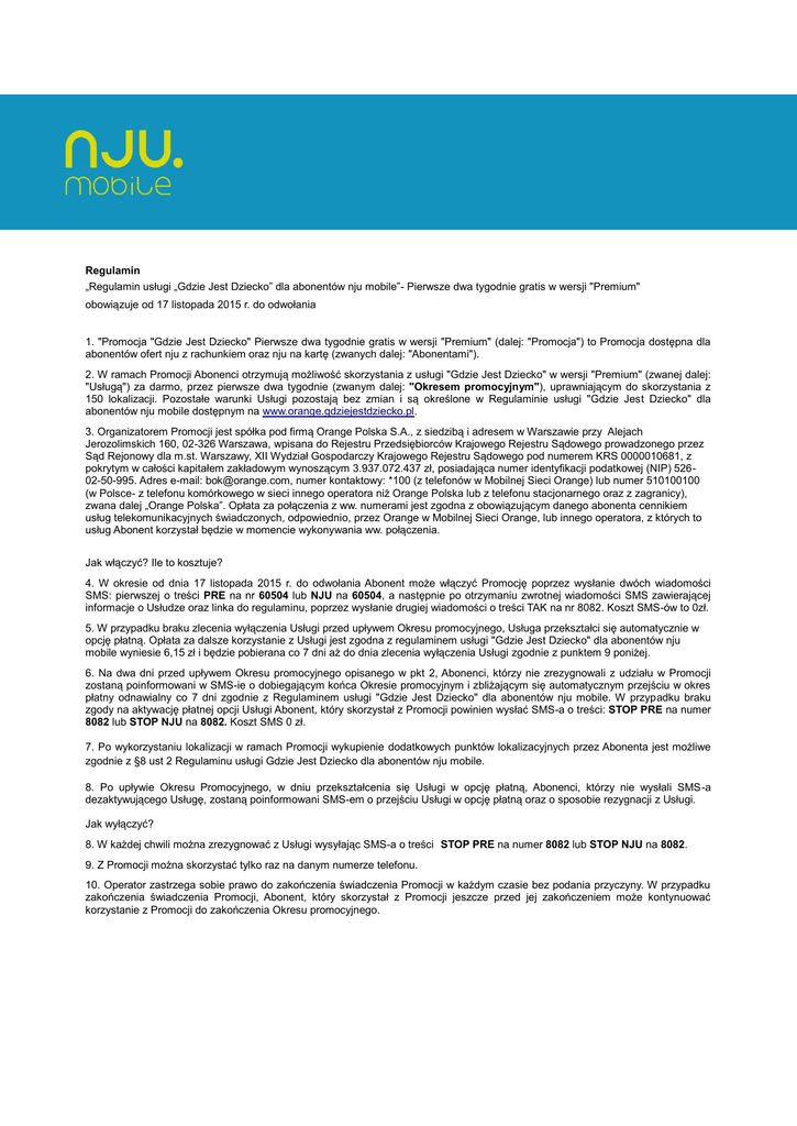 Regulamin „Regulamin usługi „Gdzie Jest Dziecko” dla abonentów nju mobile”- Pierwsze dwa tygodnie gratis w wersji "Premium" obowiązuje od 17 listopada 2015 r. do odwołania 1. "Promocja "Gdzie Jest Dziecko" Pierwsze dwa tygodnie gratis w wersji "Premium" (dalej: "Promocja") to Promocja dostępna dla abonentów ofert nju z rachunkiem oraz nju na kartę (zwanych dalej: "Abonentami"). 2. W ramach Promocji Abonenci otrzymują możliwość skorzystania z usługi "Gdzie Jest Dziecko" w wersji "Premium" (zwanej dalej: "Usługą") za darmo, przez pierwsze dwa tygodnie (zwanym dalej: "Okresem promocyjnym"), uprawniającym do skorzystania z 150 lokalizacji. Pozostałe warunki Usługi pozostają bez zmian i są określone w Regulaminie usługi "Gdzie Jest Dziecko" dla abonentów nju mobile dostępnym na www.orange.gdziejestdziecko.pl. 3. Organizatorem Promocji jest spółka pod firmą Orange Polska S.A., z siedzibą i adresem w Warszawie przy Alejach Jerozolimskich 160, 02-326 Warszawa, wpisana do Rejestru Przedsiębiorców Krajowego Rejestru Sądowego prowadzonego przez Sąd Rejonowy dla m.st. Warszawy, XII Wydział Gospodarczy Krajowego Rejestru Sądowego pod numerem KRS 0000010681, z pokrytym w całości kapitałem zakładowym wynoszącym 3.937.072.437 zł, posiadająca numer identyfikacji podatkowej (NIP) 52602-50-995. Adres e-mail: [email protected], numer kontaktowy: *100 (z telefonów w Mobilnej Sieci Orange) lub numer 510100100 (w Polsce- z telefonu komórkowego w sieci innego operatora niż Orange Polska lub z telefonu stacjonarnego oraz z zagranicy), zwana dalej „Orange Polska”. Opłata za połączenia z ww. numerami jest zgodna z obowiązującym danego abonenta cennikiem usług telekomunikacyjnych świadczonych, odpowiednio, przez Orange w Mobilnej Sieci Orange, lub innego operatora, z których to usług Abonent korzystał będzie w momencie wykonywania ww. połączenia. Jak włączyć? Ile to kosztuje? 4. W okresie od dnia 17 listopada 2015 r. do odwołania Abonent może włączyć Promocję poprzez wysłanie dwóch wiadomości SMS: pierwszej o treści PRE na nr 60504 lub NJU na 60504, a następnie po otrzymaniu zwrotnej wiadomości SMS zawierającej informacje o Usłudze oraz linka do regulaminu, poprzez wysłanie drugiej wiadomości o treści TAK na nr 8082. Koszt SMS-ów to 0zł. 5. W przypadku braku zlecenia wyłączenia Usługi przed upływem Okresu promocyjnego, Usługa przekształci się automatycznie w opcję płatną. Opłata za dalsze korzystanie z Usługi jest zgodna z regulaminem usługi "Gdzie Jest Dziecko" dla abonentów nju mobile wyniesie 6,15 zł i będzie pobierana co 7 dni aż do dnia zlecenia wyłączenia Usługi zgodnie z punktem 9 poniżej. 6. Na dwa dni przed upływem Okresu promocyjnego opisanego w pkt 2, Abonenci, którzy nie zrezygnowali z udziału w Promocji zostaną poinformowani w SMS-ie o dobiegającym końca Okresie promocyjnym i zbliżającym się automatycznym przejściu w okres płatny odnawialny co 7 dni zgodnie z Regulaminem usługi "Gdzie Jest Dziecko" dla abonentów nju mobile. W przypadku braku zgody na aktywację płatnej opcji Usługi Abonent, który skorzystał z Promocji powinien wysłać SMS-a o treści: STOP PRE na numer 8082 lub STOP NJU na 8082. Koszt SMS 0 zł. 7. Po wykorzystaniu lokalizacji w ramach Promocji wykupienie dodatkowych punktów lokalizacyjnych przez Abonenta jest możliwe zgodnie z §8 ust 2 Regulaminu usługi Gdzie Jest Dziecko dla abonentów nju mobile. 8. Po upływie Okresu Promocyjnego, w dniu przekształcenia się Usługi w opcję płatną, Abonenci, którzy nie wysłali SMS-a dezaktywującego Usługę, zostaną poinformowani SMS-em o przejściu Usługi w opcję płatną oraz o sposobie rezygnacji z Usługi. Jak wyłączyć? 8. W każdej chwili można zrezygnować z Usługi wysyłając SMS-a o treści STOP PRE na numer 8082 lub STOP NJU na 8082. 9. Z Promocji można skorzystać tylko raz na danym numerze telefonu. 10. Operator zastrzega sobie prawo do zakończenia świadczenia Promocji w każdym czasie bez podania przyczyny. W przypadku zakończenia świadczenia Promocji, Abonent, który skorzystał z Promocji jeszcze przed jej zakończeniem może kontynuować korzystanie z Promocji do zakończenia Okresu promocyjnego.