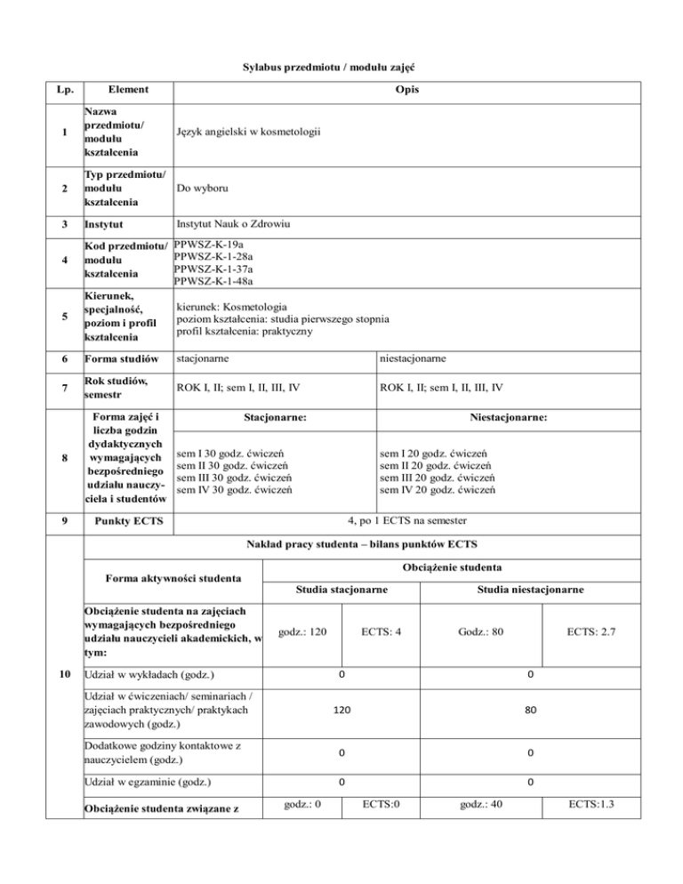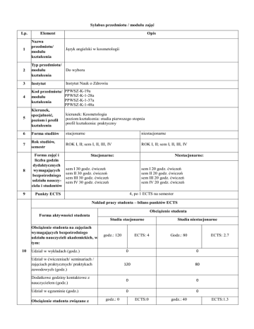 Sylabus przedmiotu / modułu zajęć Lp. Element Opis 1 Nazwa przedmiotu/ modułu kształcenia 2 Typ przedmiotu/ modułu Do wyboru kształcenia 3 Instytut 4 5 Język angielski w kosmetologii Instytut Nauk o Zdrowiu Kod przedmiotu/ PPWSZ-K-19a PPWSZ-K-1-28a modułu PPWSZ-K-1-37a kształcenia PPWSZ-K-1-48a Kierunek, kierunek: Kosmetologia specjalność, poziom kształcenia: studia pierwszego stopnia poziom i profil profil kształcenia: praktyczny kształcenia 6 Forma studiów stacjonarne niestacjonarne 7 Rok studiów, semestr ROK I, II; sem I, II, III, IV ROK I, II; sem I, II, III, IV 8 Forma zajęć i liczba godzin dydaktycznych wymagających bezpośredniego udziału nauczyciela i studentów 9 Punkty ECTS Stacjonarne: Niestacjonarne: sem I 30 godz. ćwiczeń sem II 30 godz. ćwiczeń sem III 30 godz. ćwiczeń sem IV 30 godz. ćwiczeń sem I 20 godz. ćwiczeń sem II 20 godz. ćwiczeń sem III 20 godz. ćwiczeń sem IV 20 godz. ćwiczeń 4, po 1 ECTS na semester Nakład pracy studenta – bilans punktów ECTS Obciążenie studenta Forma aktywności studenta Studia stacjonarne Obciążenie studenta na zajęciach wymagających bezpośredniego udziału nauczycieli akademickich, w tym: 10 godz.: 120 Udział w wykładach (godz.) ECTS: 4 Studia niestacjonarne Godz.: 80 ECTS: 2.7 0 0 120 80 Dodatkowe godziny kontaktowe z nauczycielem (godz.) 0 0 Udział w egzaminie (godz.) 0 0 Udział w ćwiczeniach/ seminariach / zajęciach praktycznych/ praktykach zawodowych (godz.) Obciążenie studenta związane z godz.: 0 ECTS:0 godz.: 40 ECTS:1.3 nauką samodzielną, w tym: Samodzielne studiowanie tematyki zajęć/ przygotowanie się do ćwiczeń (godz.) 0 20 Przygotowanie do zaliczenia/ egzaminu (godz.) 0 10 Wykonanie prac zaliczeniowych (referat, projekt, prezentacja itd.) (godz.) 0 10 Obciążenie studenta w ramach zajęć związanych z praktycznym przygotowaniem zawodowym Suma godz.:0 ECTS:0 godz.:0 ECTS:0 Godz.: 120 ECTS: 4 Godz.: 120 ECTS: 4 11 Nauczyciel akademicki odpowiedzialny mgr Jadwiga Laskowska, mgr Ewa Kołodziej za przedmiot/ moduł (egzaminujący) 12 Nauczyciele mgr Jadwiga Laskowska, mgr Ewa Kołodziej akademiccy prowadzący przedmiot/ moduł 13 Wymagania (kompetencje) wstępne Znajomość języka angielskiego na poziomie matury podstawowej, tj. B1 14 Założenia i cele przedmiotu Przygotowanie studenta do pracy w zawodzie kosmetologa w języku angielskim Opis efektów kształcenia w zakresie: Odniesienie do kierunkowych efektów kształcenia Odniesienie do efektów kształcenia dla obszaru WIEDZY W1 15 Efekty kształcenia W2 U1 Rozumie i identyfikuje struktury leksykalno-gram., pozwalające mu na opisywanie znanych mu wydarzeń z życia codziennego, zarówno w domu jak i w pracy. Posiada zasób słów i zwrotów niezbędnych do komunikacji w kraju angielskojęzycznym, w tym: K_W06 - rozumie przepisy, zasady i nakazy w j. angielskim dot. K_W11 m.in. higieny i bezpieczeństwa pracy K_W13 - rozumie teksty w j. angielskim dot. wskazań i przeciwwskazań, oraz potrafi je umiejętnie opisać - rozumie zalecenia lekarza czy współpracowników w j. angielskim UMIEJĘTNOŚCI Ma umiejętności językowe na poziomu B1 – B2 K_U19 Europejskiego Systemu Opisu Kształcenia Językowego. Potrafi korzystać z anglojęzycznego piśmiennictwa M1_W04 M1_W07 M1_W09 M1_U14 U2 zawodowego.Potrafi zrozumiale opisać w j.angielskim umiejętności i obowiązki kosmetologa. Nawiązuje samodzielnie kontakty społeczne oraz pracuje w zespole i porozumiewa się z nim: - potrafi współpracować z użytkownikami j. angielskiego wyrażając swoje potrzeby i opinie - potrafi posługiwać się aparaturą, korzystać z automatów itp. posiadających instrukcje obsługi w j. angielskim - potrafi obsługiwać narzędzia komputerowe i korzystać z anglojęzycznych stron internetowych. K_U04 Rozumie i potrafi zaprezentować ustnie/pisemnie K_U05 dane statystyczne w j. angielskim. Umie wy K_U16 powiedzieć się pisemnie i ustnie w języku angielskim, stosując zwroty formalne i nieformalne Umiejętnie konstruuje listy i wiadomości. M1_U01 M1_U02 M1_U04 M1_U05 M1_U11 KOMPETENCJI SPOŁECZNYCH Dostrzega potrzebę stałego doskonalenia się oraz samorealizacji, potrafi samodzielnie uzupełniać i doskonalić nabytą wiedzę i umiejętności Potrafi pracować w zespole, efektywnie wypełniając K2 powierzone zadania, wykazując zdolności komunikacyjne oraz organizacyjne Gramatyka: K1 16 Treści kształcenia 1. 2. 3. 4. 5. 6. 7. 8. 9. 10. 11. 12. 13. 14. 15. 16. 17. 18. 19. K_K01 M1_K01 K_K04 M1_K04 Czasy teraźniejsze Present Simple & Present Continuous Czasy przeszłe Past Simple & Past Continuous Czasy Perfect, present and past Użycie used to Wyrażanie przyszłości z will&going to Tworzenie pytań & Question tags Czasowniki modalne Tryby warunkowe I, II & III Użycie I wish & if only Strona bierna Użycie rodzajników a, the, ZERO Rzeczowniki policzalne & niepoliczalne Użycie both, either, neither Stopniowanie przymiotników Przyimki Reported speech - cytowanie wypowiedzi innych Łączniki zdaniowe Czasowniki nieregularne Treści w języku angielskim dot. następujących tematów: 1. Wykształcenie i zatrudnienie 2. Promocja zdrowia i dietetyka 3. Kultura bycia i języka 4. Starzenie się organizmu 5. Ekologiczne kosmetyki 6. Kości twarzy/głowy/ramienia/nóg/stóp 7. Podstawowe techniki masażu 8. Obsługa klienta (rozmowa osobiście i przez telefon) 9. Choroby/zaburzenia/leczenie skóry 10. Choroby/wady paznokci 11. Układ nerwowy i mięśniowy 12. Chemia kosmetyczna (kwasy i zasady) 13. Zabiegi na twarz. Makijaż 17 Stosowane metody dydaktyczne 14. Stylizacja fryzur, przedłużanie włosów, koloryzacja. 15. Praca w salonie kosmetycznym. Grafik. Składanie zamówień Wykład informacyjny, ćwiczenia indywidualne i w grupach, dyskusja, prezentacja, dialogi sytuacyjne, wypowiedź pisemna i ustna, praca z tekstem, ćwiczenia gramatyczne pisemne, tłumaczenia, praca ze słownikiem, praca z real-materials, dyskusja dydaktyc
