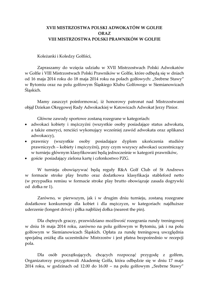 XVII MISTRZOSTWA POLSKI ADWOKATÓW W GOLFIE ORAZ VIII MISTRZOSTWA POLSKI PRAWNIKÓW W GOLFIE Koleżanki i Koledzy Golfiści, Zapraszamy do wzięcia udziału w XVII Mistrzostwach Polski Adwokatów w Golfie i VIII Mistrzostwach Polski Prawników w Golfie, które odbędą się w dniach od 16 maja 2014 roku do 18 maja 2014 roku na polach golfowych: „Srebrne Stawy” w Bytomiu oraz na polu golfowym Śląskiego Klubu Golfowego w Siemianowicach Śląskich. Mamy zaszczyt poinformować, iż honorowy patronat nad Mistrzostwami objął Dziekan Okręgowej Rady Adwokackiej w Katowicach Adwokat Jerzy Pinior. Główne zawody sportowe zostaną rozegrane w kategoriach: adwokaci kobiety i mężczyźni (wszystkie osoby posiadające status adwokata, a także emeryci, renciści wykonujący wcześniej zawód adwokata oraz aplikanci adwokaccy), prawnicy (wszystkie osoby posiadające dyplom ukończenia studiów prawniczych – kobiety i mężczyźni), przy czym wszyscy adwokaci uczestniczący w turnieju głównym klasyfikowani będą jednocześnie w kategorii prawników, goście posiadający zielona kartę i członkostwo PZG. W turnieju obowiązywać będą reguły R&A Golf Club of St Andrews w formacie stroke play brutto oraz dodatkowa klasyfikacja stableford netto (w przypadku remisu w formacie stroke play brutto obowiązuje zasada dogrywki od dołka nr 1). Zarówno, w pierwszym, jak i w drugim dniu turnieju, zostaną rozegrane dodatkowe konkurencje dla kobiet i dla mężczyzn, w kategoriach: najdłuższe uderzenie (longest drive) i piłka najbliżej dołka (nearest the pin). Dla chętnych graczy, przewidziano możliwość rozegrania rundy treningowej w dniu 16 maja 2014 roku, zarówno na polu golfowym w Bytomiu, jak i na polu golfowym w Siemianowicach Śląskich. Opłata za rundę treningową uwzględnia specjalną zniżkę dla uczestników Mistrzostw i jest płatna bezpośrednio w recepcji pola. Dla osób początkujących, chcących rozpocząć przygodę z golfem, Organizatorzy przygotowali Akademię Golfa, która odbędzie się w dniu 17 maja 2014 roku, w godzinach od 12.00 do 16.00 – na polu golfowym „Srebrne Stawy” w Bytomiu. Ostateczny termin zgłaszania udziału w Mistrzostwach upływa w dniu 15 maja 2014 roku, o godzinie 19.00. Losowanie flightów odbędzie się w dniu 16 maja 2014 roku, o godzinie 19.00. Rozpoczęcie dwudniowego turnieju odbędzie się w dniu 17 maja 2014 roku (sobota) na polu golfowym „Srebrne Stawy” w Bytomiu: 9.00 – 9.45 – rejestracja zawodników, 10.00 – start zawodników – Shotgun, format gry – stroke play brutto, 12.00 – 16.00 – akademia golfa dla osób towarzyszących/innych gości, od około godziny 14.00– 17.30 wspólne spotkanie przy grillu. W drugim dniu turnieju 18 maja 2014 roku (niedziela) spotykamy się na polu golfowym w Siemianowicach Śląskich: 9.00 – 9.45 – rejestracja zawodników, 10.00 – start zawodników – Shotgun, format gry – stroke play brutto, 15.00-16.30 – ogłoszenie wyników, obiad, zakończenie turnieju. Organizatorzy, chcąc uatrakcyjnić Państwa pobyt na Górnym Śląsku, proponują dodatkowe atrakcje w postaci: wyjazdu, w dniu 16 maja 2014 roku (piątek), o godzinie 19.00, do Kopalni Węgla Kamiennego „GUIDO” w Zabrzu, gdzie na poziomie ponad 300 m. pod ziemią będziemy mogli zwiedzić Kopalnię, a następnie skosztować śląskich potraw, popijając je kuflem śląskiego piwa, uroczystej kolacji w dniu 17 maja 2014 roku, o godzinie 20.00, którą odbędzie się w sali bankietowej w Hotelu Prime Bytom. W ramach zakwaterowania Organizatorzy proponują Hotel Prima Bytom*** w Bytomiu, położony przy ulicy Strzelców Bytomskich 87 (numer kontaktowy: 32 782 17 82). Organizatorzy uzyskali dla Państwa następujące ceny za pobyt: pokój jednoosobowy + śniadanie – 109 złotych/doba, pokój dwuosobowy + śniadanie – 149 złotych/doba. Ponadto, jest możliwość zamieszkania w Rezydencji Luxory**** w Piekarach Śląskich, położonej przy ulicy Starej 1 (numer kontaktowy: 32 450 25 88). Organizatorzy uzyskali dla Państwa następujące ceny za pobyt: pokój jednoosobowy + śniadanie – 390zł/doba, pokój dwuosobowy + śniadanie – 450zł/doba. Rezerwacji pokoju, w wybranym hotelu, prosimy dokonywać najpóźniej do dnia 30 kwietnia 2014 roku. Opłata za uczestnictwo w Mistrzostwach wynosi 300 złotych dla graczy i 200 złotych dla pozostałych osób. W kwocie tej mieści się: lekki bufet śniadaniowy na polach golfowych, pakiety startowe, zwiedzanie i poczęstunek w kopalni, spotkanie przy grillu i uroczysta kolacja po pierwszym dniu turnieju, obiad po drugim dniu turnieju. Powyższą opłatę należy uiścić w dniu 16 maja 2014 roku, w godzinach wieczornych, w recepcji turnieju, która będzie się mieścić w Hotelu Prime Bytom. Pozostałe koszty, a przede wszystkim opłaty startowe, Uczestnicy pokrywają we własnym zakresie, bezpośrednio w recepcji pola golfowego. Zgłoszenia uczestnictwa w zawodach, ze wskazaniem imienia i nazwiska uczestnika, adresu e – mail, telefonu, klubu macierzystego oraz kategorii (adwokaci, prawnicy, goście) prosimy kierować: pocztą elektroniczną pod adres e – mail: [email protected], telefonicznie pod numer: tel/fax 32 231 04 40, drogą pocztową: Kancelaria Adwokacka Adwokat Grzegorz Jaworski, ulica Kościuszki 22/9, 44-100 Gliwice. Ponadto, wszelkich, dodatkowych, informacji związanych z Mistrzostwami udzielają: Krystyna Wiśniewska – Drobny – numer kontaktowy 600 60 51 54 Grzegorz Jaworski – numer kontaktowy 602 25 70 51 Organizatorzy Mistrzostw zastrzegają możliwość zmian w organizacji turnieju. Do zobaczenia i pozdrawiam W imieniu Komitetu Organizacyjnego Adwokat Grzegorz Jaworski