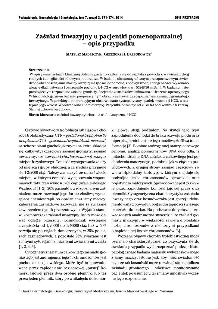 Perinatologia, Neonatologia i Ginekologia, tom 7, zeszyt 3, 171-174, 2014 OPIS PRZYPADKU Zaśniad inwazyjny u pacjentki pomenopauzalnej – opis przypadku MATEUSZ MADEJCZYK, GRZEGORZ H. BRĘBOROWICZ1 Streszczenie: W opisywanej sytuacji klinicznej 56-letnia pacjentka zgłosiła się do szpitala z powodu krwawienia z dróg rodnych i dolegliwości bólowych podbrzusza. W badaniu ultrasonograficznym przezpochwowym stwierdzono obecność w jamie macicy rozdętej masy o niejednorodnej i podwyższonej echogenności. Wykonano abrazję diagnostyczną i oznaczenie poziomu $-HCG w surowicy krwi: 55248,36 mlU/ml. W badaniu histopatologicznym rozpoznano zaśniad groniasty. Pacjentka została zakwalifikowana do leczenia operacyjnego W histopatologicznym badaniu pooperacyjnym obraz przemawiał za rozpoznaniem zaśniadu graniastego inwazyjnego. W przebiegu pooperacyjnym obserwowano systematyczny spadek stężenia $-HCG, a następnie jego wzrost. Wprowadzono chemioterapię. Pacjentka pozostaje od kilku lat pod kontrolą lekarską. Stan jej zdrowia jest dobry. Słowa kluczowe: zaśniad inwazyjny, choroba trofoblastyczna, β-HCG Ciążowe nowotwory trofoblastu lub ciążowa choroba trofoblastyczna (GTN – gestational trophoblastic neoplasms; GTD – gestational trophoblastic diseaase) są schorzeniami ginekologicznymi na które składają się: całkowity i częściowy zaśniad groniasty, zaśniad inwazyjny, kosmówczak (choriocarcinoma) oraz guz miejsca łożyskowego. Częstość występowania zależy od miejsca i grupy etnicznej, a za średnią przyjmuje się 1-2/2000 ciąż. Należy zaznaczyć, że są na świecie miejsca, w których częstość występowania wspomnianych zaburzeń wynosi 1/85 ciąż (kraje Dalekiego Wschodu) [1, 2]. 20% pacjentów z rozpoznanym zaśniadem może rozwinąć jego formę złośliwą wymagającą chemioterapii po opróżnieniu jamy macicy. Zaburzenia zaśniadowe zazwyczaj nie są związane z tworzeniem ognisk przerzutowych. Wyjątek stanowi kosmówczak i zaśniad inwazyjny, który może dawać odległe przerzuty. Kosmówczak występuje z częstością od 1/20000 do 1/40000 ciąż i aż w 50% rozwija się po ciążach donoszonych, w 25% po ciążach zaśniadowych, a pozostałe 25% związane jest z innymi sytuacjami klinicznymi związanymi z ciążą [1, 2, 4, 6]. Cytogenetyczna natura całkowitego zaśniadu groniastego jest androgenna, jego 46 chromosomów jest pochodzenia ojcowskiego. Może być to spowodowane przez zapłodnienie bezjądrowej „pustej” komórki jajowej przez dwa osobne plemniki lub też przez jeden plemnik, który po wniknięciu do komór1 ki jajowej ulega podziałom. Na skutek tego typu zapłodnienia dochodzi do braku rozwoju płodu oraz hiperplazji trofoblastu, z jego możliwą złośliwą transformacją [3]. Pomimo androgennej natury jądrowego genomu, analiza polimorfizmów DNA dowiodła, iż mitochondrialne DNA zaśniadu całkowitego jest pochodzenia matczynego, podobnie jak w ciążach prawidłowych. Z drugiej strony zaśniad częściowy zawiera triploidalny kariotyp, w którym znajduje się podwójna liczba chromosomów ojcowskich oraz pojedyncza matczynych. Spowodowane jest to zwykle przez zapłodnienie komórki jajowej przez dwa plemniki. Cytogenetyczna charakterystyka zaśniadu inwazyjnego oraz kosmówczaka jest gorzej udokumentowana z powodu ubogiej dostępności świeżego materiału do badań. Na podstawie dotychczas prowadzonych analiz można stwierdzić, że zaśniad groniasty inwazyjny w większości zawiera diploidalną liczbę chromosomów z nielicznymi przypadkami o haploidalnej liczbie chromosomów [3]. Wczesne objawy choroby trofoblastycznej mogą być mało charakterystyczne, co przyczynia się do stawiania przypadkowych rozpoznań podczas histopatologicznego badania materiału wyłyżeczkowanego z jamy macicy. Istotne jest, aby mieć świadomość tego, że rak kosmówki może rozwinąć się na podłożu zaśniadu groniastego i właściwe monitorowanie pacjentek po usunięciu tej zmiany umożliwia wczesne jego rozpoznanie. Klinika Perinatologii i Ginekologii, Uniwersytet Medyczny im. Karola Marcinkowskiego w Poznaniu 172 M. Madejczyk, G.H. Bręborowicz Pewną, a zarazem łatwo dostępną, metodą diagnostyczną u chorych z nowotworami trofoblastu jest ultrasonografia przezpochwowa. Do objawów zaśniadu groniastego w obrazie USG należą [1, 7, 12]: • obraz zamieci śnieżnej w powiększonej macicy, spowodowany obecnością obrzękniętych kosmków, • brak obecności płodu, • brak obecności prawidłowej kosmówki lub łożyska, • brak worka i płynu owodniowego, • występowanie torbieli tekaluteinowych. Charakterystyczną cechą rozrostów trofoblastu jest to, że jego komórki syntezują gonadotropinę kosmówkową. Jej stężenie jest wprost proporcjonalne do liczby żywych komórek trofoblastu i z tego powodu gonadotropina kosmówkowa jest uważana za najlepszy znany marker tych nowotworów [4]. Zaśniad groniasty Można wyróżnić zaśniad groniasty częściowy i całkowity. Są to dwie wyraźnie różniące się jednostki chorobowe, z charakterystycznym dla siebie profilem cytogenetycznym, histologicznym i objawami klinicznymi, lecz o podobnym sposobie leczenia. Objętość i ilość proliferującego trofoblastu jest zazwyczaj większa w przypadku zaśniadu całkowitego. Podobnie poziom $-HCG jest zazwyczaj wyższy w przypadku rozpoznania zaśniadu całkowitego [3, 4]. Rozpoznanie stawia się najczęściej na podstawie przezpochwowego badania ultrasonograficznego oraz objawów klinicznych takich jak: krwawienie z dróg rodnych oraz rozwijających się nieco później dodatkowych patologii takich jak nadciśnienie indukowane ciążą, nadczynność tarczycy, niedokrwistość czy niepowściągliwe wymioty ciężarnych. Około 15-25% pacjentek z zaśniadem całkowitym będzie miało torbiele tekaluteinowe jajników oraz będzie można zaobserwować powiększenie samych jajników zazwyczaj przekraczające 6 cm [4]. 