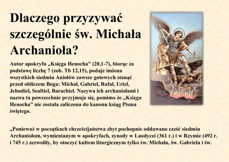 Dlaczego przyzywać szczególnie św. Michała Archanioła? Autor apokryfu „Księga Henocha” (20,1-7), biorąc za podstawę liczbę 7 (zob. Tb 12,15), podaje imiona wszystkich siedmiu Aniołów zawsze gotowych stanąć przed obliczem Boga: Michał, Gabriel, Rafał, Uriel, Jehudiel, Sealtiel, Barachiel. Nazywa ich archaniołami i nazwa ta powszechnie przyjmuje się, pomimo że „Księga Henocha” nie została zaliczona do kanonu ksiąg Pisma świętego. „Ponieważ w początkach chrześcijaństwa zbyt pochopnie oddawano cześć siedmiu Archaniołom, wymienianym w apokryfach, synody w Laodycei (361 r.) i w Rzymie (492 r. i 745 r.) zezwoliły, by otoczyć kultem liturgicznym tylko św. Michała, św. Gabriela i św. Rafała, gdyż tylko o tych Aniołach mamy wyraźne świadectwo w Piśmie św.” (ks. W. Zaleski SDB, Święci na każdy dzień, Warszawa 1980, s. 583). Słowo archanioł (greckie archangelos) znaczy dosłownie „książę Aniołów”, nieznane w St. Test., występuje dwukrotnie w N. Test.: w Liście Judy 0,9, jako określenie imienia Michał, oraz w 1 Tes 4,16 bez podania imienia. Zatem według Pisma św. możemy tego tytułu używać tylko w odniesieniu do Michała. Tytuł ten — „Książę Aniołów” — harmonizuje z tym, co mówi księga Apokalipsy: „I nastąpiła walka w niebie: Michał i jego Aniołowie mieli walczyć ze Smokiem. I wystąpił do walki Smok i jego Aniołowie, ale nie przemógł, i już się miejsce dla nich w niebie nie znalazło” (Ap 12,7-8). Michał występuje tu w roli wodza. Jak wódz w starożytnych czasach, krocząc na czele, prowadził swoich żołnierzy do walki, tak Michał, książę Aniołów, ich wódz, prowadził ich do największej w dziejach stworzenia bitwy, której skutkiem było rozdarcie Mistycznego Ciała Chrystusa, podział Aniołów na dobrych i złych, a następnie, po upadku pierwszych rodziców, popadnięcie całej ludzkości w niewolę szatana. W zrozumieniu wielkiej roli św. Michała Archanioła, o czym już była wzmianka, pomaga nam Księga Jozuego. Czytamy w niej, że po przejściu Jordanu lud izraelski natknął się na obwarowaną twierdzę, Jerycho. „Gdy Jozue przebywał blisko Jerycha, podniósł oczy i ujrzał przed sobą męża z mieczem dobytym w ręku. Jozue podszedł do niego i rzekł »Czy jesteś po naszej stronie, czy też po stronie naszych wrogów?« A on odpowiedział: »Nie, gdyż jestem wodzem zastępów PANA i właśnie przybyłem«. Wtedy Jozue upadł twarzą na ziemię, oddał mu pokłon i rzekł do niego: »Co rozkazuje mój Pan swemu słudze?« Na to rzekł wódz zastępów PANA do Jozuego: »Zdejm obuwie z nóg twoich, albowiem miejsce, na którym stoisz, jest święte«. I Jozue tak uczynił” (Joz 5,13-15). (Szczegółową analizę wielkości św. Michała Archanioła zob. „Święty Michał Archanioł — Obrońca Ludu Starego i Nowego Przymierza” oraz „Wielkość Świętego Michała Archanioła” — dzieła cyt.). Słowo „zastępy” oznacza w Biblii stworzenia różnego rodzaju, a więc Aniołów, ludzi, narody i świat materialny (zob. Rdz 2,1; 34,2; Wj 7,4; 14,1; 32,34; Pwt 4,19; 2 Krn 18,18; Ps 148,114). Jeśli Księga Apokalipsy przedstawia Michała jako wodza Aniołów, Aniołowie zaś są stworzeniami, to w ukazującym się Jozuemu mężu, który przedstawia się jako wódz zastępów PANA (Tego Który Jest), czyli wódz całego stworzenia, rozpoznajemy Michała. Utożsamiam Anioła PANA z Michałem, którego Bóg proklamował i wyznaczył na opiekuna narodu izraelskiego (zob. Wj 23,20-23), a którego prorok Daniel nazwie Michałem, opiekunem i obrońcą narodu wybranego (por. Dn 10,13.21; 12,1). Z analizy powołań innych osób biblijnych (Abraham, Jakub, Mojżesz, Jozue, sędziowie, królowie Izraela, prorocy, Jan Chrzciciel, Maryja) wynika, że Pan Bóg, wybierając ich do spełnienia oznaczonych zadań, obdarzył ich stosownymi darami swych łask. Wybierając zatem Michała na wodza Aniołów, ludzi i całego kosmosu, Bóg, w swojej mądrości i świętości, obdarzył go również odpowiednią władzą, mocą i darami uzdalniającymi go do wypełniania powierzonych mu zadań; obdarzył go świętością ponad wszystkich Aniołów i świętych. Bł. ks. Br. Markiewicz pisze: Św. Michał „nazwany jest Archaniołem nie dlatego, że należy do chóru Archaniołów, ale dlatego, iż jest księciem wszystkich zastępów anielskich. A ponieważ, według zdania św. Tomasza, doktora Kościoła, Serafini posiadają zalety i doskonałości wszystkich pozostałych ośmiu chórów anielskich, św. Michał Archanioł, ich wódz, ma zalety, doskonałości i świętość wszystkich Serafinów razem wziętych, stosownie do swojego wysokiego posłannictwa i stanowiska, jakie mu Pan Bóg wszechmocny wyznaczył. Świętość jego w chwili walki z pysznym Lucyferem była niezrównana i niezrównaną pozostała. Jedynie Królowa Aniołów, przebłogosławiona Bogarodzica Maryja, przewyższa go świętością” (ks. B. Markiewicz, Ćwiczenia duchowne, Michalineum 1995, s. 260). Bł. ks. Markiewicz twierdzi za św. Grzegorzem Wielkim, Bonawenturą, Tomaszem z Akwinu, że właśnie św. Michał Archanioł był Aniołem Stróżem Pana Jezusa (Ćwiczenia duchowne, dz. cyt. s. 263; zob. „Któż jak Bóg”, nr 2/99 s. 4). „W Bogu żyjemy, poruszamy się i jesteśmy” (Dz 17,28). Pan Bóg jest podstawowym „środowiskiem” każdego stworzenia, a jednocześnie jest wyższy, przewyższający wszystkie stworzenia, mówimy: transcendentny. Pytamy: Jakie jest odniesienie między Bogiem a Jego odwiecznym zamiarem powołania i działania Mistycznego Ciała Chrystusa? Jaka jest relacja odwiecznego planu Boga do zaistnienia Maryi, która dopiero w określonym przez Boga czasie zaistniała? Bóg, który jest nieskończonym Duchem, obejmuje naraz czas stworzeń w odwiecznym akcie swego istnienia, które utożsamia się z Jego istotą i wszystkimi Jego nieskończonymi przymiotami (zob.
