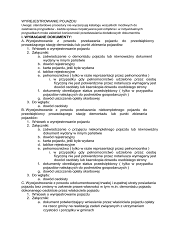 WYREJESTROWANIE POJAZDU Uwaga: standardowe procedury nie wyczerpują katalogu wszystkich możliwych do zaistnienia przypadków - każda sprawa rozpatrywana jest odrębnie i w indywidualnych przypadkach może zaistnieć konieczność przedstawienia dodatkowych dokumentów I. WYMAGANE DOKUMENTY: A. Wyrejestrowanie z powodu przekazania pojazdu do przedsiębiorcy prowadzącego stację demontażu lub punkt zbierania pojazdów: 1. Wniosek o wyrejestrowanie pojazdu 2. Załączniki: a. zaświadczenie o demontażu pojazdu lub równoważny dokument wydany w innym państwie b. dowód rejestracyjny c. karta pojazdu, jeśli była wydana d. tablice rejestracyjne e. pełnomocnictwo ( tylko w razie reprezentacji przez pełnomocnika ) i. w przypadku gdy pełnomocnictwo udzielone przez osobę fizyczną nie jest potwierdzone przez notariusza wymagany jest dowód osobisty lub kserokopia dowodu osobistego strony f. dokumenty określające status przedsiębiorcy ( tylko w przypadku pojazdów należących do podmiotów gospodarczych ) g. dowód uiszczenia opłaty skarbowej 3. Do wglądu: a. dowód osobisty B. Wyrejestrowanie z powodu przekazania niekompletnego pojazdu do przedsiębiorcy prowadzącego stację demontażu lub punkt zbierania pojazdów: 1. Wniosek o wyrejestrowanie pojazdu 2. Załączniki: a. zaświadczenie o przyjęciu niekompletnego pojazdu lub równoważny dokument wydany w innym państwie b. dowód rejestracyjny c. karta pojazdu, jeśli była wydana d. tablice rejestracyjne e. pełnomocnictwo ( tylko w razie reprezentacji przez pełnomocnika ) i. w przypadku gdy pełnomocnictwo udzielone przez osobę fizyczną nie jest potwierdzone przez notariusza wymagany jest dowód osobisty lub kserokopia dowodu osobistego strony f. dokumenty określające status przedsiębiorcy ( tylko w przypadku pojazdów należących do podmiotów gospodarczych ) g. dowód uiszczenia opłaty skarbowej 3. Do wglądu: a. dowód osobisty C. Wyrejestrowanie z powodu udokumentowanej trwałej i zupełnej utraty posiadania pojazdu bez zmiany w zakresie prawa własności w tym m.in. demontażu pojazdu dokonanego osobiście przez właściciela pojazdu 1. Wniosek o wyrejestrowanie pojazdu 2. Załączniki: a. dokument potwierdzający wniesienie przez właściciela pojazdu opłaty na rzecz gminy na realizację zadań związanych z utrzymaniem czystości i porządku w gminach b. oświadczenie o trwałej i zupełnej utracie posiadania pojazdu bez zmiany w zakresie prawa własności c. dowód rejestracyjny d. karta pojazdu, jeśli była wydana e. tablice rejestracyjne f. pełnomocnictwo ( tylko w razie reprezentacji przez pełnomocnika ) i. w przypadku gdy pełnomocnictwo udzielone przez osobę fizyczną nie jest potwierdzone przez notariusza wymagany jest dowód osobisty lub kserokopia dowodu osobistego strony g. dokumenty określające status przedsiębiorcy ( tylko w przypadku pojazdów należących do podmiotów gospodarczych ) h. dowód uiszczenia opłaty skarbowej 3. Do wglądu: a. dowód osobisty D. Wyrejestrowanie z powodu kradzieży pojazdu: 1. Wniosek o wyrejestrowanie pojazdu 2. Załączniki: a. zaświadczenie wydane przez właściwy organ Policji potwierdzające zgłoszenie kradzieży pojazdu albo postanowienie o umorzeniu dochodzenia w sprawie kradzieży pojazdu wystawione przez właściwy organ b. oświadczenie pod odpowiedzialnością karną za składanie fałszywych zeznań o kradzieży pojazdu c. dowód rejestracyjny d. kartę pojazdu, jeżeli była wydana e. pełnomocnictwo ( tylko w razie reprezentacji przez pełnomocnika ) i. w przypadku gdy pełnomocnictwo udzielone przez osobę fizyczną nie jest potwierdzone przez notariusza wymagany jest dowód osobisty lub kserokopia dowodu osobistego strony f. dokumenty określające status przedsiębiorcy ( tylko w przypadku pojazdów należących do podmiotów gospodarczych ) g. dowód uiszczenia opłaty skarbowej 3. Do wglądu: a. dowód osobisty E. Wyrejestrowanie z powodu zniszczenia ( kasacji ) pojazdu za granicą: 1. Wniosek o wyrejestrowanie pojazdu 2. Załączniki: a. zaświadczenie o demontażu pojazdu lub równoważny dokument wydany w innym państwie b. dowód rejestracyjny c. karta pojazdu, jeśli była wydana d. tablice rejestracyjne e. pełnomocnictwo ( tylko w razie reprezentacji przez pełnomocnika ) i. w przypadku gdy pełnomocnictwo udzielone przez osobę fizyczną nie jest potwierdzone przez notariusza wymagany jest dowód osobisty lub kserokopia dowodu osobistego strony f. dokumenty określające status przedsiębiorcy ( tylko w przypadku pojazdów należących do podmiotów gospodarczych ) g. dowód uiszczenia opłaty skarbowej 3. Do wglądu: a. dowód osobisty F. Wyrejestrowanie z powodu wywozu pojazdu z kraju, jeżeli pojazd został zarejestrowany za granicą lub zbyty za granicę: 1. Wniosek o wyrejestrowanie pojazdu 2. Załączniki: a. dokument potwierdzający zbycie pojazdu za granicę b. oświadczenie pod odpowiedzialnością karną o wywozie pojazdu z Polski lub kopia dokumentu potwierdzającego zarejestrowanie pojazdu za granicą c. pełnomocnictwo ( tylko w razie reprezentacji przez pełnomocnika ) i. w przypadku gdy pełnomocnictwo udzielone przez osobę fizyczną nie jest potwierdzone przez notariusza wymagany jest dowód osobisty lub kserokopia dowodu osobistego strony d. dokumenty określające status przedsiębiorcy ( tylko w przypadku pojazdów należących do podmiotów gospodarczych ) e. dowód uiszczenia opłaty skarbowej 3. Do wglądu: a. dowód osobisty II. OPŁATY: 1. skarbowa - od decyzji o wyrejestrowaniu pojazdu - 10,00 zł skarbowa - od jednego stosunku pełnomocnictwa - 17,00 [ z opłaty skarbowej zwolnieni są małżonkowie, dzieci, rodzeństwo i rodzice strony (warunkiem zwolnienia z opłaty skarbowej jest uwzględnienie stopnia pokrewieństwa w pełnomocnictwie)] Opłatę skarbową wnosi się na rachunek: Urząd Miasta i Gminy Gryfice, 72-300 Gryfice, pl. Zwycięstwa 37, NRB: 67937600010000054720010007. Bez prowizji wpłat d