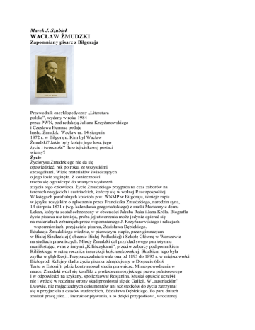 Marek J. Szubiak WACŁAW ŻMUDZKI Zapomniany pisarz z Biłgoraja Przewodnik encyklopedyczny „Literatura polska”, wydany w roku 1984 przez PWN, pod redakcją Juliana Krzyżanowskiego i Czesława Hernasa podaje hasło: Żmudzki Wacław ur. 14 sierpnia 1872 r. w Biłgoraju. Kim był Wacław Żmudzki? Jakie były koleje jego losu, jego życie i twórczość? Ile o tej ciekawej postaci wiemy? Życie Życiorysu Żmudzkiego nie da się opowiedzieć, rok po roku, ze wszystkimi szczegółami. Wiele materiałów świadczących o jego losie zaginęło. Z konieczności trzeba się ograniczyć do znanych wydarzeń z życia tego człowieka. Życie Żmudzkiego przypada na czas zaborów na terenach rosyjskich i austriackich, kończy się w wolnej Rzeczpospolitej. W księgach parafialnych kościoła p.w. WNMP w Biłgoraju, istnieje zapis w języku rosyjskim o zgłoszeniu przez Franciszka Żmudzkiego, narodzin syna, 14 sierpnia 1871 r (wg. kalendarza gregoriańskiego) z matki Marianny z domu Lekan, który tu został ochrzczony w obecności Jakuba Raka i Jana Króla. Biografia życia pisarza nie istnieje, próba jej utworzenia może jedynie opierać się na materiałach zebranych przez wspomnianego J. Krzyżanowskiego i relacjach – wspomnieniach, przyjaciela pisarza, Zdzisława Dębickiego. Edukacja Żmudzkiego wiedzie, w pierwszym etapie, przez gimnazjum w Białej Siedleckiej ( obecnie Białej Podlaskiej) i Szkołę Główną w Warszawie na studiach prawniczych. Młody Żmudzki dał przykład swego patriotyzmu manifestując, wraz z innymi „Kilińczykami”, przeciw zaborcy pod pomnikiem Kilińskiego w setną rocznicę insurekcji kościuszkowskiej. Skutkiem tego była zsyłka w głąb Rosji. Przypuszczalnie trwała ona od 1893 do 1895 r. w miejscowości Biełogrod. Kolejny ślad z życia pisarza odnajdujemy w Dorpacie (dziś Tartu w Estonii), gdzie kontynuował studia prawnicze. Mimo powodzenia w nauce, Żmudzki wdał się konflikt z profesorem rosyjskiego prawa państwowego i w odpowiedzi na szykany, spoliczkował Rosjanina. Musiał opuścić uczel41 nię i wrócić w rodzinne strony skąd przedostał się do Galicji. W „austriackim” Lwowie, nie mając żadnych dokumentów ani też środków do życia zatrzymał się u przyjaciela z czasów studenckich, Zdzisława Dębickiego. Po paru dniach znalazł pracę jako… instruktor pływania, a to dzięki przypadkowi, wrodzonej poradności i fizycznej postaci - młodzieńca rosłego i przystojnego, czym zaimponował właścicielce kąpieliska. Dzięki pomocy kolegów i wsparciu ówczesnego autorytetu – Bronisława Szwarce, został urzędnikiem w Banku Zaliczkowym przy Wałach Hetmańskich. We Lwowie ukończył studia prawnicze i na stałe już związał się z tym miastem. Związek małżeński zawarł z sympatią poznaną jeszcze na zsyłce, Marią Parniewską. Parniewska była jedną z pierwszych studentek lwowskiego uniwersytetu. Żmudzki zostaje ojcem dwóch synów, młodszemu również nadano imię Wacław. Wychowanie Wacława było dla pisarza szczególnie ważne. Daje temu wyraz w jednym z listów do syna: (…) Bo kto chce być prawdziwym człowiekiem, szczególniej, kto kocha ojczyznę i pragnie jej odrodzenia, ten powinien przygotować się do tego. A przygotowanie polega na tem, że trzeba krzepic i hartować ciało, ale bardziej jeszcze hartować duszę, uczyć się czynić, co dzień dobre ofiary, ażeby – gdy zajdzie potrzeba – łatwo było ofiarować całego siebie. (…), żeby cały człowiek był naprawdę człowiekiem, żeby miał spokojne i poważne myśli i serce tak czyste, ażeby je w każdej chwili nawet Panu Bogu na dłoni można było położyć. Takim bądź chłopcze. Całuję Cię serdecznie, Twój ojciec”. Takim był syn pisarza. Jako szesnastoletni młodzieniec, uczeń gimnazjum, poległ z bronią w ręku, w pierwszych dniach ukraińskiego ataku na Lwów w listopadzie 1918 r. Był jednym z „lwowskich orląt” – bohaterskiej młodzieży broniącej swego miasta. Śmierć ukochanego syna była osobistą tragedią pisarza, tak gorąco wpajającego swemu dziecku miłość do ojczyzny. Kolejna tragedia to śmierć starszego syna Władysława – zginał również w obronie Lwowa w 1920 r. Już w odrodzonej Rzeczpospolitej, Żmudzki był cenionym dyrektorem Banku Zaliczkowego we Lwowie, gdy dotknął pisarza kolejny dramat. Bezpodstawnie posądzono go o nieprawidłowość w działaniu banku. Doznał upokorzenia podejrzeniem, śledztwem, aresztem i mimo uwolnienia od zarzutów, załamał się psychicznie. Wybrał samotność. Spotkać go we Lwowie, można było tylko w drodze na cmentarz, kiedy codziennie odwiedzał groby synów. Jego życie kończyło się. Spoczął na cmentarzu łyczakowskim. Na starej, zardzewiałej tabliczce zawieszonej na krzyżu można było odczytać datę śmierci Żmudzkiego, był to rok 1925. Był dzielnym patriotą, humanistą czułym na krzywdę ludzi i zniewolenie ojczyzny, był człowiekiem wyjątkowym. Tak, w znacznym skrócie, kończy się opis życia zapomnianego pisarza, rodem z Biłgoraja. Dzięki staraniom biłgorajskiego regionalisty Andrzeja Czacharowskiego, postać Wacława Żmudzkiego nie została zupełnie 42 zapomniana, nie został zapomniany grób pisarza we Lwowie, znajdujący się tuż przy murze cmentarza Orląt Lwowskich. Grób został odnaleziony, zabezpieczony i wymaga odrestaurowania, a twórczość pisarza również odnaleziona, wraca do czytelników. Biłgorajskie Towarzystwo Literackie, uchwałą z dnia 26 września 2011 r., objęło patronatem grób Wacława Żmudzkiego we Lwowie, dla utrzymania go w należytym stanie. Ponadto podejmie wszelkie możliwe działania dla upowszechnienia twórczości pisarza. Twórczość Debiut pisarski Wacława Żmudzkiego przypada na rok 1897. We Lwowie ukazuje się opowiadanie pt. Losy Jacka Kozika. Autor ukazuje tu losy dwóch młodzieńców skomplikowane przez carskiego strażnika i rosyjskie sądownictwo. W następnym roku