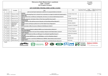 Mistrzostwa Polski Młodych Koni w ujeżdżeniu 28.09 - 2.10.2016 LKJ Stragona Strzegom 5 Letnie II PÓŁFINAŁ SOBOTA LISTY STARTOWE II PÓŁFINAŁ KONIE 5 LETNIE (1.10.2016) Lp. Godz. No. 1 09:00 038 O026654 Katarzyna Cieślak K019715 2 09:09 042 O003587 Mateusz Cichoń K021427 3 09:18 040 O003378 Aleksandra Szulc K020124 4 09:27 025 O003129 Karolina Mazurek K019983 5 09:36 024 O014082 6 09:45 011 O011107 Julia NaumovichShabovskaya Małgorzata Belicka Klub Koń płeć/rasa/maść\ojciec\matka/ojciec matki\rok ur\nr paszportu\hodowca\właściciel Zawodnik K019561 K021424 DIVERSO O/han./sk.gn./Dressage Royal old./La Grande E han.\Londonderry han.\Agata Fornalska\Lilla Krzyżanowska\11 SWEET BOY O/han./kara/San Amour old./Romana old.\Depardieu old.\Anneus und Johanne Barth\Andrzej Cichoń\11 ARI - EL W/sp/c.gn./Contendor old./Arkada śl.\Dolar śl.\Piotr Dworniczak\Piotr Dworniczak\11 PROWOKATOR O/sp/c.gn./Believe In Me sp/Pokusa sp\Lord Alexander old.\Paweł Mazurek\Paweł Mazurek\11 HADES W/sp/gn./Landor old./Hiacynta sp\Grand As han.\Piotr Siębor\Tomasz Głogowski\11 EFEKT O/śl./kara/Jordan śl./Elba śl.\Locarno śl.\Sławomir Królik\Sławomir Królik\11 KJ Golden Dream Łódź KARAT W/sp/c.gn./Lennik sp/Klebsilla sp\Mazzel KWPN\Lucyna Kaszkowiak\Anna Woźnica\11 GOLD QUATERBACK O/wlkp/kaszt./Quaterback niem.sport./Gracja wlkp\Agar wlkp/poch.trk.\SK Dębno\Adam Lachera\11 FURST OSCAR G O/han./c.gn./Fuerstenball old./Wey han.\Weltregent H han.\Elizabeth Kapp\Witold Kopeć\11 GIGI LADY K/KWPN/gn./United KWPN/Phantom Lady KWPN\Mytens xx\S.R De Wilde\Marta Madej\11 GIVENCHY K/KWPN/gn./Florencio I westf./Cherie KWPN\Johnson KWPN\D.J Menkveld\Anna Kierznowska\11 CHOCO LADY II K/DSP (brand-Anh)/kaszt./Chap old. (OS)/Cyrena zwurb.\Barsac hol.\SK Bielin\Karolina Mazurek\11 TS "Kuźnia" Rybnik Stęp Kłus Galop Przyd. Do ujeżdżenia Wraż. Pom. WYNIK Ogólne KJ Lider KJ Golden Dream Łódź SLKS Książ STAJNIA JARUŻYN Tuszyński KJ "Garbówek" 09:54 7 10:05 037 O001632 Anna Woźnica K020071 8 10:14 029 O017401 Anna Surowiec K020435 9 10:23 020 O003896 Kamil Puliński K020077 10 10:32 043 O003587 Mateusz Cichoń K011902 11 10:41 013 O006103 Anna Kierznowska K018523 12 10:50 035 O003129 Karolina Mazurek K021046 KJ "Korys" Przygorzele Lubelski Klub Jeździecki KJ Lider SKJ KIETLÓW SLKS Książ 10:59 kontakt 692 991 471 - Jacek Ryczywolski Obsługa zawodów HTE marketing Jacek Ryczywolski godz. wydruku 16:44 Mistrzostwa Polski Młodych Koni w ujeżdżeniu 28.09 - 2.10.2016 LKJ Stragona Strzegom 6 Letnie II PÓŁFINAŁ SOBOTA LISTY STARTOWE II PÓŁFINAŁ KONIE 6 LETNIE (1.10.2016) Lp. Godz. No. Koń płeć/rasa/maść\ojciec\matka/ojciec matki\rok ur\nr paszportu\hodowca\właściciel Zawodnik 1 11:30 010 O002106 Joanna Jawor K021968 2 11:39 028 O019084 Izabela Szlosarek K017346 3 11:48 027 O037867 Mateusz Pola K017344 4 11:57 018 O003829 Martyna Bańska K017837 5 12:06 005 O000184 Ilona Janas K017862 6 12:15 012 O002402 Katarzyna Łukasik K017986 TIM O/sp/c.gn./Candiavolo hol./Tuana-S sBs\Warkando Wonderboy\Rudiger Wassibauer\Rudiger Wassibauer\10 BUTTERFLY K/DSP (Sach-Thur)./gn./Belissimo M reń./Rainbow han.\Romancero H han.\Zbigniew Szumlakowski\Andrzej Sałacki\10 GALAPAGOS W/wlkp/gn./Quaterback niem.sport./Gracja wlkp\Agar wlkp/poch.trk.\SK Dębno\SK Dębno\10 TEQUILA-P K/sp/kara/Ron William old./Tajka-P sp\Corleone Z Z\Bogdan Parkitny\Martyna Bańska\10 LORD DJANGO O/han./gn./Stalypso han./Lona han.\Londonderry han. \Hermann Heeren\Ilona Janas\10 ROMANTICA K/sp/kara/Swarovski old./Rowa han.\Rotspon han.\Piotr Wiese\Ludmiła Strypikowska\10 Klub Stęp Kłus Galop Przyd. Do ujeżdżenia Wraż. Pom. WYNIK Ogólne KJ Trachy Gliwice LKJ Lewada LKJ Lewada Karkonoski KJ SKKJ Bobrowy Staw LKJ Lublin 12:24 kontakt 692 991 471 - Jacek Ryczywolski Obsługa zawodów HTE marketing Jacek Ryczywolski godz. wydruku 16:44 Puchar Polski Młodych Koni w ujeżdżeniu 28.09 - 2.10.2016 LKJ Stragona Strzegom 7-9 LAT II PÓŁFINAŁ LISTY STARTOWE I PÓŁFINAŁ KONIE 6 LETNIE (30.09.2016) No. Zawodnik Koń Procent Klub H % 1 12:40 044 2 12:48 041 3 12:56 002 4 13:04 045 5 13:12 006 6 13:20 033 7 13:28 014 CARDAMON O001177 Anna-Maria Gawłowska K016060 og\sp\gn\Pegasus HB\Chanel / Compliment\A. Gawłowska\A. Gawłowska\09 SALVATORE O003866 Marta Wiśniewska K014195 og\old\s.gn\Swarovski old\Fryda old/ Figaro old\Gerd dannemann\I. Wiśniewska\08 DAVIDOFF O003587 Mateusz Cichoń K019036 wal\old\kaszt\De Kooning hol\Franziska old / Dream of Glory old\GER\A. Cichoń\09 DON KENNEDY O003304 Agnieszka Domagała K014293 wal\sp\siwy\Stakkatol \Dolina / Caletto`s Son\D. Staniek\A. Domagała\09 GERMANY O001467 Gabriela Jaworska-Mazur K011915 og\hol\gn\Clearway hol\Grace X I I I hol/ Contender hol\V. Heinz\G. Jaworska-Mazur\07 KONSTANTIN O003129 Karolina Mazurek K017866 wal\DSP (Brand-Anh)\gn\Quaterman brand\Konstytucja sp / Czandor sp\GER\K. Mazurek09 DONNADOORN O006103 Anna Kierznowska K014152 kl\KWPN\kara\Painted Black KWPN\Sesdoorn KWPN/ Jazz\NED\A. Kierznowska\08 B C pl % pl % pl Total Sopocki Klub Jeździecki bpk POM KJ Lider Pomorska Liga Jeździecka SKJ Legia Kozielska SLKS Książ SKJ KIETLÓW 13:36 ______________________________ Sędzia Główny/ President of Ground Jury EHCMB- Wacław Pruchniewicz kontakt/contact 692 991 471 - J. Ryczywolski Obsługa Zawodów HTE marketing Jacek Ryczywolski godz. wydruku 16:44 wyniki live www.htezawody.pl Mistrzostwa Polski Młodych Koni w ujeżdżeniu 28.09 - 2.10.2016 LKJ Stragona Strzegom 4 Letnie FINAŁ A SOBOTA LISTY STARTOWE FINAŁ A 4 LETNIE (1.10.2016) Lp. Godz. No. Klub Koń płeć/rasa/maść\ojciec\matka/ojciec matki\rok ur\nr paszportu\hodowca\właściciel Zawodnik 1 14:30 003 O000797 Julia Kornaszewska K022072 2 14:39 001 O013530 Ewa Leibfarth K020963 3 14:48 017 O003829 Martyna Bańska K021967 4 14:57 032 O019084 Izabela Szlosarek K022210 5 15:06 034 O003129 Karolina Mazurek K022008 6 15:15 021 O003896 Kamil Puliński K021756 7 15:24 031 O017401 Anna Surowiec K019