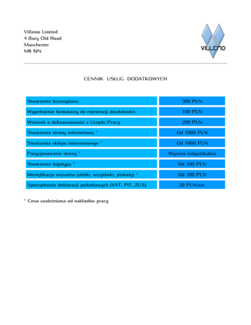 Villemo Limited 4 Bury Old Road Manchester M8 9JN CENNIK USŁUG DODATKOWYCH Stworzenie biznesplanu 300 PLN Wypełnienie formularzy do rejestracji działalności 100 PLN Wniosek o dofinansowanie z Urzędu Pracy 200 PLN Stworzenie strony internetowej * Od 1000 PLN Stworzenie sklepu internetowego * Od 1000 PLN Pozycjonowanie strony * Wycena indywidualna Stworzenie logotypu * Od 200 PLN Identyfikacja wizualna (ulotki, wizytówki, plakaty) * Od 300 PLN Sporządzenie deklaracji podatkowych (VAT, PIT, ZUS) 20 PLN/szt. * Cena uzależniona od nakładów pracy