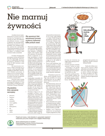 Informator Informator Związku Związku Gmin Gmin Zagłębia Zagłębia Miedziowego Miedziowego > 24>kwietnia 28 maja 2013 Nie marnuj żywności Aż jedna trzecia wyprodukowanej na świecie żywności marnuje się. Europejczycy wyrzucają do śmieci 89 milionów ton jedzenia rocznie, z czego 9 milionów ton marnują Polacy. Wyrzucona żywność to strata pieniędzy. Przy zakupach jedzenia, częściej niż w przypadku innych grup produktów, decyzje podejmowane są spontanicznie, bez planu i w rezultacie część żywności trafia na śmietnik. W domu Europejczyka przeciętnie wyrzuca się do kosza 20-30% kupionego jedzenia, choć 2/3 nadawałoby się jeszcze do spożycia, natomiast w USA nawet 25-40% żywności trafia na śmietnik. Do marnowania żywności w Polsce przyznaje się co czwarta osoba (wg badań MillwardBrown SMG/KRC, 09.2011). 30 % Polaków przyznaje, że zdarza im się wyrzucić pełnowartościową żywność. Średnio na osobę wrzucamy miesięcznie żywność o wartości 50 zł. Powyższe dane sytuują Polskę na piątej pozycji państw marnujących jedzenie w Unii Europejskiej, za Wielką Brytanią, Niemcami, Francją i Holandią. 10 produktów, które najczęściej marnujemy: • • • • • • • • • • pieczywo, warzywa, wędliny, ziemniaki, owoce ogółem, jogurty, dania gotowe, ser, mięso, mleko. Aby ograniczyć ilość marnowanej żywności wystarczy zastosować kilka prostych zasad: • • • • Planowanie zakupów to podstawa racjonalnego zarządzania jedzeniem. Przygotujmy listę zakupów i posiłków, dzięki czemu kupimy tylko tyle jedzenia, ile potrzeba. Zanim wyjdziemy na zakupy sprawdźmy, co mamy w lodówce. Należy być świadomym zapasów. Codzienne zakupy powinna planować lub robić osoba, która przygotowuje domowe posiłki. Najlepiej przygotowywać plan jadłospisu na nadchodzący tydzień i na tej podstawie sporządzać listę zakupów. Idąc na zakupy nie powinniśmy być głodni. Kiedy jesteśmy głodni kupujemy więcej żywności. Podchodźmy racjonalnie do wszelkich promocji i przecen. Artykuły w promocyjnej cenie nie zawsze są nam przydatne. A kupowanie zbędnych produktów tylko dlatego, że są tanie, nie ma sensu, tym bardziej, że potem mogą się one po prostu zepsuć. Zwróćmy uwagę na to, czy produkty są świeże i nieuszkodzone. Sprawdzajmy skład i termin ważności - nie kupujmy, jeśli mamy do nich zastrzeżenia lub jeżeli wiemy, że nie będziemy ich w stanie zjeść przed upływem terminu przydatności do spożycia. W domu również obserwujmy trwałość i terminy przydatności kupionych produktów. Kwestie miejsca na produkty – wielkość lodówki, zagospodarowanie półek mogą uła- • twić przechowywanie żywności czy ocenę, czego brakuje i co kupić. Każda kategoria produktów powinna mieć wyznaczone właściwe miejsce w lodówce. Dolną półkę zarezerwujmy dla mięsa i ryb, środkowe dla twarogów, wędlin i przyrządzonych już produktów (np. sałatek, surówek, zup czy kotletów), a górną – dla przetworów i nabiału. Boczne półki na drzwiach chłodziarki świetnie nadają się na przechowywanie oleju, sosów, przetworów, jaj itp. Powinniśmy również zwracać uwagę na to, jak szybko te potrawy się psują. Nawet jeśli kupiliśmy lub przygotowaliśmy za dużo jedzenia możemy je przechować na później. Sposobów jest wiele: np. mrożenie, pasteryzowanie, marynowanie, suszenie, kiszenie, wekowanie. Niezjedzone porcje kotletów, mocno dojrzałe owoce? Tego typu produkty nie muszą automatycznie stać się odpadkami! Można je ponownie wykorzystać. • Niewykorzystane porcje już przygotowanych przysmaków (np. porcje mięs, bulion, rosół) można zamrozić i skonsumować przy innej okazji lub przygotować na ich podstawie całkiem nowe danie. Niedojedzone warzywa, owoce czy części mięsa mogą posłużyć za składniki duszonych potraw, sosów i zapiekanek. • Mocno dojrzałe owoce, zanim się zepsują możemy zmiksować w pyszne koktajle i soki. Bardzo proste do zrobienia są dżemy, konfitury, powidła. • Wędliny i sery z foliowych opakowań przepakujmy w papier pergaminowy. Dzię- Projekt pod nazwą: „Cykl artykułów nt. gospodarki odpadami” realizowany jest przez Związek Gmin Zagłębia Miedziowego Strona dofinansowana ze środków Wojewódzkiego Funduszu Ochrony Środowiska i Gospodarki Wodnej we Wrocławiu 6 • • ki temu nie wytworzy się wilgoć, która sprzyja powstawaniu pleśni. Czerstwe pieczywo możemy wysuszyć i zetrzeć na tarce – otrzymamy w ten sposób domową bułkę tartą. Możemy z takiego pieczywa przygotować grzanki, np. zupy. Wino, które zostało po otworzeniu butelki, rozlejmy do woreczków na lód i zamroźmy. Kiedy będziemy potrzebować odrobiny trunku do przygotowania potrawy, nie będziemy musieli otwierać kolejnej butelki. Nadwyżki dobrej żywności można również oddać najbardziej potrzebującym osobom lub organizacjom, które takim osobom pomagają. W Polsce problem ten dotycz y dwóch m i l ionów osób, a kolejne 10 mln jest zagrożonych ubóstwem. Żywność, która nie została wykorzystana, czyli mówiąc wprost została zmarnowana, wywiera wielowymiarowe, negatywne skutki społeczne, ekonomiczne i ekologiczne. Produkt spożywczy to nie tylko to, co konsumujemy, ale także produkcja, opakowanie, transport, emisja odpadów przemysłowych. Wyrzucone produkty spożywcze to także marnotrawstwo energii oraz wody potrzebnej do wytworzenia, transportu i dystrybucji żywności. Jednocześnie marnujemy koszty poniesione na zakup oraz przygotowanie posiłków i produkujemy więcej odpadów.