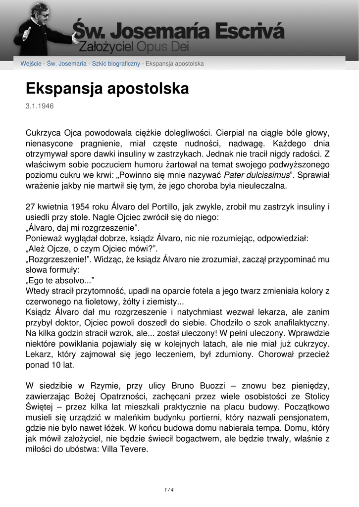 Wejście - Św. Josemaría - Szkic biograficzny - Ekspansja apostolska Ekspansja apostolska 3.1.1946 Cukrzyca Ojca powodowała ciężkie dolegliwości. Cierpiał na ciągłe bóle głowy, nienasycone pragnienie, miał częste nudności, nadwagę. Każdego dnia otrzymywał spore dawki insuliny w zastrzykach. Jednak nie tracił nigdy radości. Z właściwym sobie poczuciem humoru żartował na temat swojego podwyższonego poziomu cukru we krwi: „Powinno się mnie nazywać Pater dulcissimus”. Sprawiał wrażenie jakby nie martwił się tym, że jego choroba była nieuleczalna. 27 kwietnia 1954 roku Álvaro del Portillo, jak zwykle, zrobił mu zastrzyk insuliny i usiedli przy stole. Nagle Ojciec zwrócił się do niego: „Álvaro, daj mi rozgrzeszenie”. Ponieważ wyglądał dobrze, ksiądz Álvaro, nic nie rozumiejąc, odpowiedział: „Ależ Ojcze, o czym Ojciec mówi?”. „Rozgrzeszenie!”. Widząc, że ksiądz Álvaro nie zrozumiał, zaczął przypominać mu słowa formuły: „Ego te absolvo...” Wtedy stracił przytomność, upadł na oparcie fotela a jego twarz zmieniała kolory z czerwonego na fioletowy, żółty i ziemisty... Ksiądz Álvaro dał mu rozgrzeszenie i natychmiast wezwał lekarza, ale zanim przybył doktor, Ojciec powoli doszedł do siebie. Chodziło o szok anafilaktyczny. Na kilka godzin stracił wzrok, ale... został uleczony! W pełni uleczony. Wprawdzie niektóre powikłania pojawiały się w kolejnych latach, ale nie miał już cukrzycy. Lekarz, który zajmował się jego leczeniem, był zdumiony. Chorował przecież ponad 10 lat. W siedzibie w Rzymie, przy ulicy Bruno Buozzi – znowu bez pieniędzy, zawierzając Bożej Opatrzności, zachęcani przez wiele osobistości ze Stolicy Świętej – przez kilka lat mieszkali praktycznie na placu budowy. Początkowo musieli się urządzić w maleńkim budynku portierni, który nazwali pensjonatem, gdzie nie było nawet łóżek. W końcu budowa domu nabierała tempa. Domu, który jak mówił założyciel, nie będzie świecił bogactwem, ale będzie trwały, właśnie z miłości do ubóstwa: Villa Tevere. 1/4 Były to lata ekspansji Dzieła w Europie i do obu Ameryk. W roku 1946 niektórzy członkowie Opus Dei rozpoczęli pracę apostolską w Portugalii, we Włoszech i w Wielkiej Brytanii. W 1947 roku przyszła pora na Francję i Irlandię, a w 1949 na Meksyk i Stany Zjednoczone. W roku 1950 pojechano do Chile i Argentyny, w 1951 do Kolumbii i Wenezueli, a w roku 1952 do Niemiec. A ekspansja trwała nadal. Już w roku 1948 osoby z różnych krajów mogły spotkać się na wakacyjnych kursach formacyjnych. Dzieło pasowało dobrze do wszystkich, tak różniących się od siebie miejsc na świecie, jako znak, że było rzeczą Bożą. Ludzie przybywali zewsząd, z najróżniejszych kulturowo i społecznie środowisk. Rodziła się potrzeba zapewnienia im odpowiedniej formacji. I tak w roku 1948, pomimo ciasnoty w Villa Tevere, święty Josemaría utworzył Rzymskie Kolegium Świętego Krzyża. Do niego mieli przybywać członkowie Dzieła z całego świata, na okres szczególnej formacji w samym sercu Kościoła i Opus Dei. 12 grudnia 1953 roku utworzył Rzymskie Kolegium Świętej Marii, które miało spełniać te same cele, tyle że dla kobiet z Opus Dei. Od tamtej pory w ośrodkach tych kształciło się już tysiące osób, a wielu mężczyzn zostało wyświęconych na kapłanów. Kolejnym ważnym krokiem było to, że Dzieło otworzyło się również na współpracowników, którzy nie byli katolikami. „Opus Dei, od kiedy zostało założone, nie czyniło nigdy dyskryminacji: pracuje ze wszystkimi i żyje ze wszystkimi, gdyż w każdym człowieku widzi, duszę, której należy się miłość i szacunek. I nie są to puste słowa: nasze Dzieło [...], za zgodą Stolicy Apostolskiej, przyjmuje jako współpracowników również niekatolików i niechrześcijan”. Dlatego święty Josemaría mógł sobie pozwolić na żart, choć uczyniony z ogromnym szacunkiem, mówiąc do papieża Jana XXIII: „Ja nie uczyłem się ekumenizmu od Waszej Świątobliwości”, ponieważ niekatolicy, a nawet niechrześcijanie, byli współpracownikami Opus Dei jeszcze przed jego pontyfikatem. Ojciec wysyłał swoich synów i córki do nowych krajów z tą samą ufnością w Boską Opatrzność, z którą realizował dotychczas każdy nowy projekt. Posyłał ich bez niczego, podobnie jak i sam Jezus wysyłał swoich uczniów. Ale jego ojcowska troska towarzyszyła im zawsze. Ojciec udawał się w długie i uciążliwe podróże, aby ich odwiedzić lub by przygotować teren (poprzez modlitwy, jak również rozmowy z władzami kościelnymi) przed ich przyjazdem. Już w 1945 roku siostra Łucja, wizjonerka z Fatimy poprosiła go o rozpoczęcie działalności Dzieła w Portugalii. W 1949 roku Kardynał Faulhaber przyjął Josemaríę Escrivę w Monachium i poprosił go, aby Opus Dei rozpoczęło działalność również w 2/4 Niemczech. Następne w kolejności były Zurych, Bazylea, Bonn, Kolonia, Paryż, Amsterdam, Louvain i wiele innych miast. Przybył też do Wiednia w czasach, gdy sowieccy żołnierze na ulicach stanowili powszedni widok. Tam, w austriackiej stolicy, zaczął zwracać się do Maryi aktem strzelistym Sancta Maria, Stella Orientis, filios tuos adiuva! („Święta Maryjo, Gwiazdo Wschodu, pomóż swoim dzieciom!”), myśląc o krajach pozostających pod władzą komunistów po II wojnie światowej. Podróżował niezbyt wygodnym samochodem, drogami umęczonymi wojną, umilając podróż swoim kompanom, nucąc piosenki i żartując. Często modlił się na głos w samochodzie, komentując słowa Pana: „Ja was wybrałem, abyście szli i owoc przynosili i aby owoc wasz trwał”. Trasę podróży wykorzystywali też, aby odwiedzić sanktuaria Maryjne. Na przełomie lat 50–tych i 60–tych założyciel podróżował wielokrotnie na kilka tygodni do Anglii. Pokładał w tym kraju swoje nadzieje ze względu na 