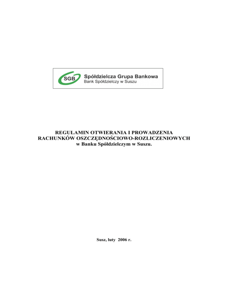 REGULAMIN OTWIERANIA I PROWADZENIA RACHUNKÓW OSZCZĘDNOŚCIOWO-ROZLICZENIOWYCH w Banku Spółdzielczym w Suszu. Susz, luty 2006 r. Spis treści ............................................................................................................................................ 1 ...............................................................................................................................................................1 Spis treści....................................................................................................................................2 ROZDZIAŁ I. Postanowienia ogólne...................................................................................... 3 ROZDZIAŁ II. Postanowienia szczegółowe............................................................................. 4 Dysponowanie saldem ...............................................................................................................4 Czeki........................................................................................................................................... 5 Polecenie przelewu.....................................................................................................................6 Zlecenia stałe..............................................................................................................................7 Polecenie zapłaty........................................................................................................................7 Terminowa lokata oszczędnościowa w ROR.............................................................................7 Karty płatnicze............................................................................................................................7 Saldo debetowe...........................................................................................................................7 Kredyty........................................................................................................................................8 Rozwiązanie umowy...................................................................................................................8 ROZDZIAŁ III. Postanowienia końcowe................................................................................ 9 2 ROZDZIAŁ I. Postanowienia ogólne §1 1. Z zastrzeżeniem ust. 2 dla rachunków oszczędnościowo-rozliczeniowych w Banku obowiązują postanowienia „Ogólne warunki otwierania i prowadzenia rachunków bankowych osób fizycznych w złotych w Banku Spółdzielczym w Suszu”. 2. Niniejszy Regulamin określa szczegółowe warunki otwierania i prowadzenia w Banku rachunków oszczędnościowo-rozliczeniowych, zwanych również ROR. §2 Przez określenia użyte w niniejszym Regulaminie należy rozumieć: 1) Bank - Bank Spółdzielczy w Suszu. 2) Dokument stwierdzający tożsamość - dowód osobisty. 3) Dopuszczalne saldo debetowe - saldo ujemne wykazane na koniec dnia operacyjnego nie przewyższające kwoty ustalonej decyzją Zarządu Banku. 4) Karta płatnicza - karta płatnicza identyfikująca jej Wydawcę i upoważnionego Posiadacza lub Użytkownika karty, uprawniająca do wypłaty gotówki w bankomatach i oddziałach banków oraz dokonywania zapłaty za towary i usługi w formie bezgotówkowej. Karta płatnicza jest elektronicznym instrumentem płatniczym, 5) Lokata - terminowa lokata oszczędnościowa w ramach ROR, 6) Nierezydent- osoba fizyczna nie mająca miejsca zamieszkania w kraju, 7) Oddział - jednostka organizacyjna Banku prowadzącą działalność operacyjną, 8) Posiadacz karty płatniczej - osoba fizyczna, posiadająca w Banku rachunek, która na podstawie umowy o kartę płatniczą dokonuje w swoim imieniu i na swoją rzecz operacji określonych w stosownej Umowie, 9) Posiadacz ROR lub Posiadacz rachunku - osoba, z którą Oddział zawarł stosowną Umowę; w przypadku rachunku wspólnego – każdy ze współposiadaczy, 10) Regulamin - Regulamin otwierania i prowadzenia rachunków oszczędnościoworozliczeniowych w Banku Spółdzielczym w Suszu, 11) Rezydent - osoba fizyczna mająca miejsce zamieszkania w kraju, 12) ROR - rachunek oszczędnościowo-rozliczeniowy, 13) Saldo debetowe - niedopuszczalne ujemne saldo wykazane na koniec dnia operacyjnego, spowodowane wypłatą kwot przewyższających stan środków pieniężnych płatnych na żądanie i kwotę dopuszczalnego salda debetowego lub kwotę przyznanego kredytu odnawialnego, 14) Saldo ROR - stan środków pieniężnych zgromadzonych na ROR, płatnych na każde żądanie, 15) Taryfa - Taryfa prowizji i opłat za czynności i usługi bankowe obowiązująca w Banku, 16) Umowa - umowa rachunku oszczędnościowo-rozliczeniowego, 17) Użytkownik karty - osoba fizyczna upoważniona przez Posiadacza rachunku do dokonywania w imieniu i na rzecz Posiadacza rachunku operacji określonych w Umowie, której dane identyfikacyjne są umieszczone na karcie płatniczej, 18) Warunki - Ogólne warunki otwierania i prowadzenia rachunków bankowych osób fizycznych w złotych w Banku Spółdzielczym w Suszu. 19) Wpłata - każda dyspozycja powodująca wpływ środków pieniężnych na ROR, 20) Wypłata - każda dyspozycja powodująca obciążenie ROR. 3 ROZDZIAŁ II. Postanowienia szczegółowe §3 ROR umożliwia jego Posiadaczowi m.in: 1) gromadzenie środków, 2) przeprowadzanie rozliczeń pieniężnych, 3) złożenie środków na terminowej lokacie oszczędnościowej, 4) otrzymanie międzynarodowych kart płatniczych, 5) uzyskanie zgody na składanie dyspozycji powodujących powstanie dopuszczalnego salda debetowego, 6) uzyskanie kredytu odnawialnego w ROR, 7) korzystanie z innych usług bankowych oferowanych przez Bank w ramach ROR, zgodnie z warunkami określonymi w odrębnie zawartych umowach oraz odrębnych regulaminach. §4 Klient może posiadać w Banku tylko jeden ROR. §5 Oddział po przedłożeniu przez Klienta historii korzysta