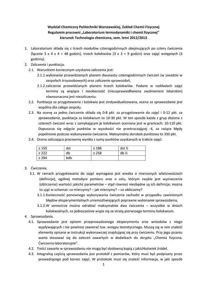 Wydział Chemiczny Politechniki Warszawskiej, Zakład Chemii Fizycznej Regulamin pracowni „Laboratorium termodynamiki i chemii fizycznej” kierunek Technologia chemiczna, sem. letni 2012/2013 1. Laboratorium składa się z trzech modułów czterogodzinnych obejmujących po cztery ćwiczenia (łącznie 3 x 4 x 4 = 48 godzin), trzech kolokwiów (3 x 3 = 9 godzin) oraz zajęć wstępnych (3 godziny). 2. Zaliczenia i punktacja. 2.1. Warunkiem koniecznym uzyskania zaliczenia jest: 2.1.1.wykonanie przewidzianych planem dwunastu czterogodzinnych ćwiczeń (w zasadzie w zespołach trzyosobowych) oraz zaliczenie sprawozdań, 2.1.2.zaliczenie przewidzianych planem trzech kolokwiów. Podane w rozkładach zajęć terminy są wiążące i nieobecność (nieusprawiedliwiona zwolnieniem lekarskim) równoznaczna jest niezaliczeniu. 2.2. Punktacja za przygotowanie i kolokwia jest zindywidualizowana, ocena za sprawozdanie jest wspólna dla całego zespołu. 2.3. Na ocenę za jedno ćwiczenie składa się 0-8 pkt. za przygotowanie do zajęć i 0-12 pkt. za sprawozdanie, punktacja za kolokwium to 10-30 pkt. W ten sposób każda z grup złożona z czterech ćwiczeń wraz z zamykającym je kolokwium oceniana jest w granicach: 10-110 pkt. Dopuszcza się odjęcie punktów w wysokości nie przekraczającej -4, za rażące błędy popełnione podczas wykonywania ćwiczenia. Maksymalny dorobek punktowy to 330 pkt. 2.4. Ocena zaliczająca pracownię wynika z sumy punktów uzyskanych w trakcie zajęć: ≥ 150 ≥ 222 ≥ 294 dst db bdb ≥ 186 ≥ 258 dst ½ db ½ 3. Ćwiczenia. 3.1. W ramach przygotowania do zajęć wymagana jest wiedza o mierzonych właściwościach (definicje), ogólnej metodyce pomiaru oraz o celu, którym zwykle jest wyznaczenie (obliczenie) wartości jakichś parametrów – stąd również niezbędne są ich definicje; można to ująć w schemat: co mierzymy? – jak mierzymy? – co obliczamy? 3.1.1.Konieczność ponownego wykonywania ćwiczenia zachodzi w przypadku zawinionych błędów eksperymentalnych uniemożliwiających poprawne wykonanie sprawozdania, 3.1.2.W semestrze można odrabiać maksymalnie dwa ćwiczenia – wszystkie w dniach kolokwialnych, co jednocześnie wiąże się ze stratą pierwszego terminu kolokwium. 4. Sprawozdania. 4.1. Sprawozdanie jest opisem przeprowadzonego eksperymentu oraz wniosków z niego wypływających i nie powinno zawierać tzw. wstępu teoretycznego. Muszą się w nim znaleźć elementy opisane w instrukcji wykonawczej znajdującej się przy ćwiczeniu. Przy jego pisaniu warto stosować się do zaleceń zawartych w dodatkach do skryptu „Chemia fizyczna. Ćwiczenia laboratoryjne”. 4.2. Treści zawarte w sprawozdaniu nie mogą być dosłowną kopią z jakichkolwiek źródeł. 4.3. Integralną częścią sprawozdania jest protokół z pomiarów, który musi być podpisany przez prowadzącego pod koniec zajęć. W protokole musi się znaleźć informacja, w jaki sposób 1 praca została rozdzielona pomiędzy członków zespołu. Konieczne jest, aby czynności były miarę możliwości równomiernie rozłożone pomiędzy członków zespołu. 4.4. Sprawozdanie powinno być oddane najpóźniej na następnych zajęciach. 4.5. Każda poprawa merytorycznych błędów sprawozdania powoduje zmniejszenie punktacji (od oceny maksymalnej 12 pkt.). 5. Kolokwia. 5.1. Tematyka kolokwiów obejmuje metodykę badawczą, wiedzę dotyczącą obserwowanych zjawisk, definicje mierzonych i obliczanych parametrów, wyjaśnienie przeprowadzonych obliczeń oraz ich uzasadnienie. Obowiązuje materiał znajdujący się w skrypcie Chemia fizyczna. Ćwiczenia laboratoryjne, opis w instrukcjach wykonawczych oraz literatura tam polecana. 5.2. Warunkiem przystąpienia do kolokwium jest wcześniejsze oddanie wszystkich czterech sprawozdań z ćwiczeń objętych kolokwium i zaliczenie minimum trzech. 5.3. Niezaliczone kolokwium można poprawiać w terminie poprawkowym. Warunkiem dopuszczającym jest zaliczenie wszystkich czterech sprawozdań. 5.4. Na zakończenie pracowni zostanie zorganizowane dodatkowe kolokwium pisemne, na którym będzie można poprawiać jedno niezaliczone kolokwium. 6. Bezpieczeństwo. 6.1. W laboratorium należy zwracać szczególną uwagę na bezpieczeństwo pracy, stosując się tak do ogólnych zasad, jak i podanych w opisach poszczególnych ćwiczeń. Pracować należy w fartuchach i wykorzystywać okulary ochronne. Umiejętność korzystania z bazy iChem jest warunkiem koniecznym dopuszczenia do pracy w laboratorium. 2