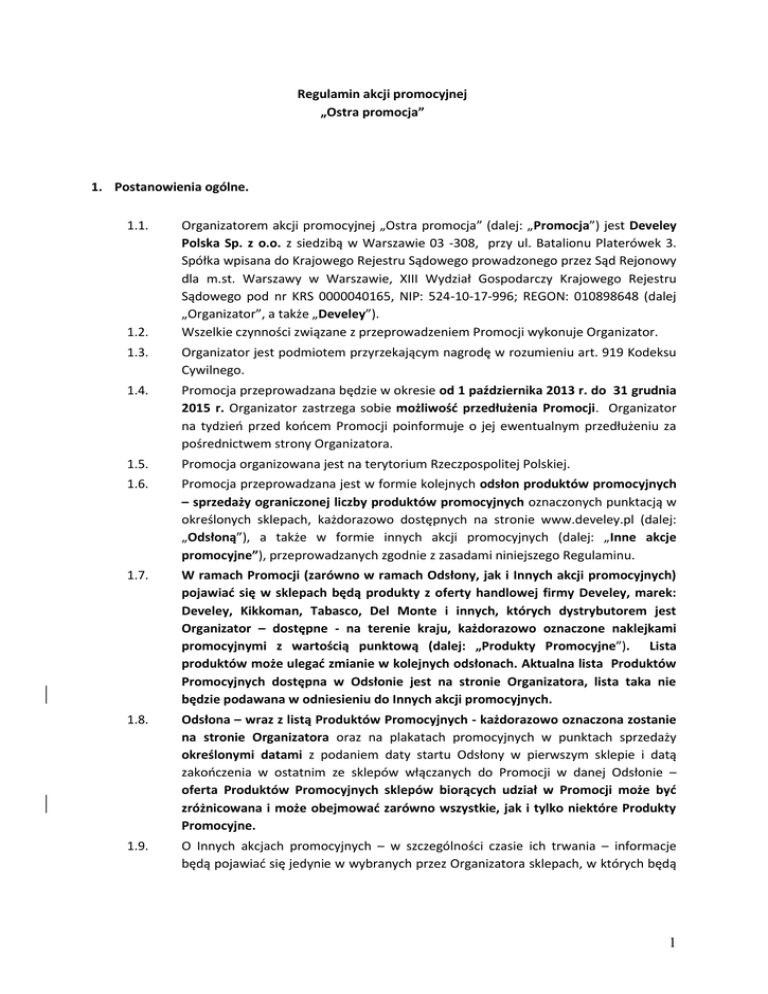 Regulamin akcji promocyjnej „Ostra promocja” 1. Postanowienia ogólne. 1.1. 1.2. Organizatorem akcji promocyjnej „Ostra promocja” (dalej: „Promocja”) jest Develey Polska Sp. z o.o. z siedzibą w Warszawie 03 -308, przy ul. Batalionu Platerówek 3. Spółka wpisana do Krajowego Rejestru Sądowego prowadzonego przez Sąd Rejonowy dla m.st. Warszawy w Warszawie, XIII Wydział Gospodarczy Krajowego Rejestru Sądowego pod nr KRS 0000040165, NIP: 524-10-17-996; REGON: 010898648 (dalej „Organizator”, a także „Develey”). Wszelkie czynności związane z przeprowadzeniem Promocji wykonuje Organizator. 1.3. Organizator jest podmiotem przyrzekającym nagrodę w rozumieniu art. 919 Kodeksu Cywilnego. 1.4. Promocja przeprowadzana będzie w okresie od 1 października 2013 r. do 31 grudnia 2015 r. Organizator zastrzega sobie możliwość przedłużenia Promocji. Organizator na tydzień przed końcem Promocji poinformuje o jej ewentualnym przedłużeniu za pośrednictwem strony Organizatora. 1.5. Promocja organizowana jest na terytorium Rzeczpospolitej Polskiej. 1.6. Promocja przeprowadzana jest w formie kolejnych odsłon produktów promocyjnych – sprzedaży ograniczonej liczby produktów promocyjnych oznaczonych punktacją w określonych sklepach, każdorazowo dostępnych na stronie www.develey.pl (dalej: „Odsłoną”), a także w formie innych akcji promocyjnych (dalej: „Inne akcje promocyjne”), przeprowadzanych zgodnie z zasadami niniejszego Regulaminu. 1.7. W ramach Promocji (zarówno w ramach Odsłony, jak i Innych akcji promocyjnych) pojawiać się w sklepach będą produkty z oferty handlowej firmy Develey, marek: Develey, Kikkoman, Tabasco, Del Monte i innych, których dystrybutorem jest Organizator – dostępne - na terenie kraju, każdorazowo oznaczone naklejkami promocyjnymi z wartością punktową (dalej: „Produkty Promocyjne”). Lista produktów może ulegać zmianie w kolejnych odsłonach. Aktualna lista Produktów Promocyjnych dostępna w Odsłonie jest na stronie Organizatora, lista taka nie będzie podawana w odniesieniu do Innych akcji promocyjnych. 1.8. Odsłona – wraz z listą Produktów Promocyjnych - każdorazowo oznaczona zostanie na stronie Organizatora oraz na plakatach promocyjnych w punktach sprzedaży określonymi datami z podaniem daty startu Odsłony w pierwszym sklepie i datą zakończenia w ostatnim ze sklepów włączanych do Promocji w danej Odsłonie – oferta Produktów Promocyjnych sklepów biorących udział w Promocji może być zróżnicowana i może obejmować zarówno wszystkie, jak i tylko niektóre Produkty Promocyjne. 1.9. O Innych akcjach promocyjnych – w szczególności czasie ich trwania – informacje będą pojawiać się jedynie w wybranych przez Organizatora sklepach, w których będą 1 one przeprowadzane, informacje dotyczące Innych akcji promocyjnych nie będą pojawiać na stronie Organizatora. 1.10. Każdorazowa Odsłona zakłada sprzedaż ograniczonej liczby Produktów Promocyjnych w wybranych sklepach oraz ograniczoną liczbę sklepów. Data włączenia danego sklepu w Odsłonę oraz wyłączenia z Odsłony będzie publikowana na stronie Organizatora. Sprzedaż Produktów Promocyjnych w ramach Innych akcji promocyjnych będzie nieograniczona. 1.11. Czas trwania Odsłony dla każdego sklepu jest każdorazowo wyraźnie oznaczony na stronie Organizatora oraz w punkcie sprzedaży na plakacie promocyjnym informującym o Odsłonie Promocji, a jego start wyznacza czas pojawienia się standu zaopatrzonego w Produkty Promocyjne oznaczone naklejkami. 1.12. W trakcie Promocji – każdej z Odsłon, jak i Innych akcji promocyjnych - każdy Produkt Promocyjny ma określoną wartość punktową od 5 do 15 pkt. Wartość punktowa danego Produktu Promocyjnego znajduje się na naklejce promocyjnej lub informacji znajdującej się na Produkcie Promocyjnym objętym Promocją lub na voucherze. Punkty z Odsłon, Innych akcji promocyjnych oraz voucherów sumują się na zasadach określonych w Regulaminie. 1.13. Uczestnik w ramach jednej Odsłony uprawniony jest do zarejestrowania nie więcej niż 3 Produktów Promocyjnych jednego rodzaju (np. 3 ketchupy, 3 musztardy, 3 sosy czosnkowe) w dowolnej liczbie sklepów objętych Promocją w danej Odsłonie. Określenie „każdorazowo” należy rozumieć zakup Produktów Promocyjnych w ramach jednej Odsłony Promocyjnej, z zastrzeżeniem, że sklep, w którym dokonał zakupu, znajduje się na liście sklepów wskazanej w pkt. 4.6. Niezależnie od udziału w Odsłonie, przystępując do Innych akcji promocyjnych – niezależnie od ich liczby – Uczestnik uprawniony jest do zarejestrowania miesięcznie nie więcej niż 3 Produktów Promocyjnych jednego rodzaju (np. 3 ketchupy, 3 musztardy, 3 sosy czosnkowe). 1.14. Odsłony Promocyjne mogą nakładać się na siebie czasowo, jednakże Odsłony mogą nakładać czasowo z innymi akcjami promocyjnymi. 1.15. W nakładających się czasowo odsłonach nigdy nie pojawią się takie same Produkty Promocyjne. Takie same Produkty Promocyjne mogą znaleźć się w Odsłonie i Innych akcjach promocyjnych. 2. Uczestnictwo w Promocji 2.1. Z zastrzeżeniem pkt. 2.2 (poniżej) Uczestnikami Promocji (dalej: „Uczestnik lub Nabywca") mogą być wyłącznie: pełnoletnie osoby fizyczne posiadające pełną zdolność do czynności prawnych, zamieszkałe na terytorium Rzeczpospolitej Polskiej i będące konsumentami w rozumieniu art. 221 Kodeksu Cywilnego, które zarejestrują się i założą konto na stronie internetowej Organizatora pod adresem: www.develey.pl, wypełnią wszystkie dane wymagane w odpowiedniej zakładce (dalej: „Serwis”). Uczestnictwo w Promocji jest dobrowolne. Uczestnictwo w Promocji uzależnione jest od zakupu przynajmniej trzech z produktów wymienionych w pkt 1.7 2 Regulaminu (wymóg ten nie dotyczy voucher’a o wartości 15 punktów, o którym mowa w pkt 3.1.3 b) Regulaminu). 2.2. W Promocji nie mogą brać udziału: 2.2.1