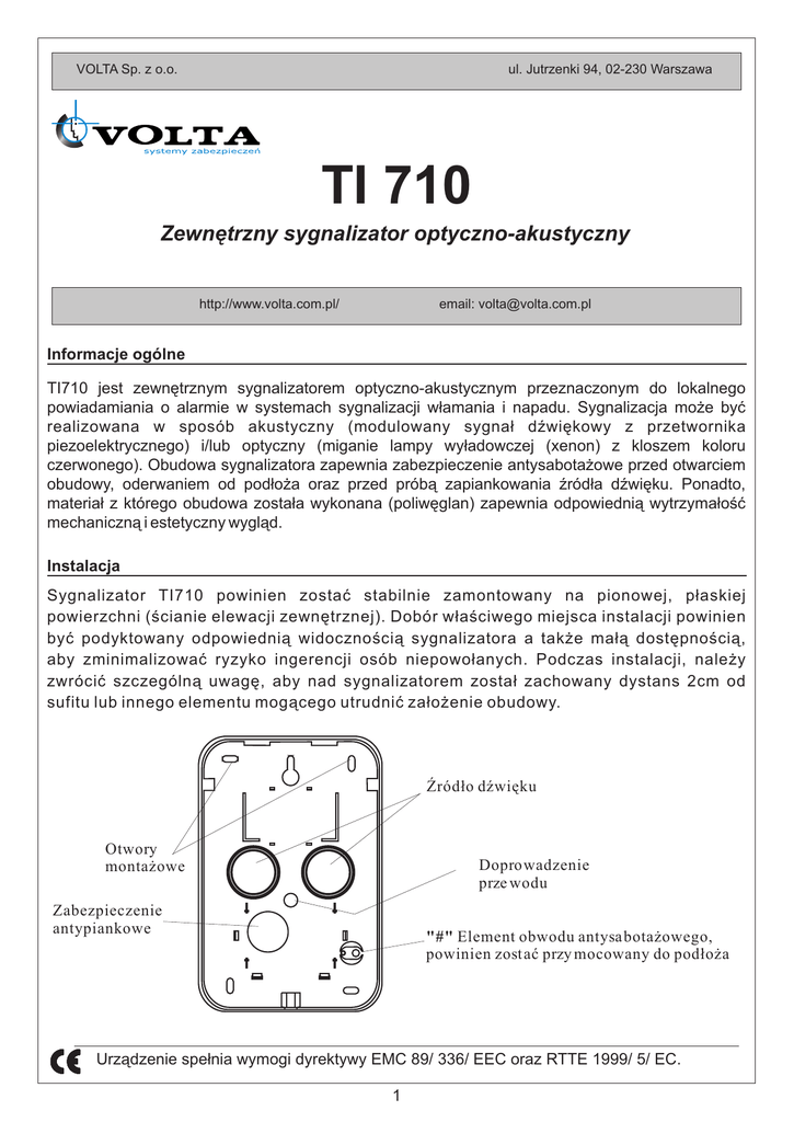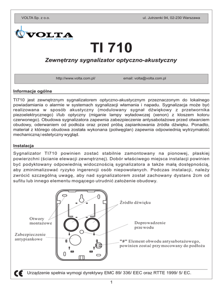 VOLTA Sp. z o.o. ul. Jutrzenki 94, 02-230 Warszawa TI 710 Zewnætrzny sygnalizator optyczno-akustyczny http://www.volta.com.pl/ email: [email protected] Informacje ogólne TI710 jest zewnêtrznym sygnalizatorem optyczno-akustycznym przeznaczonym do lokalnego powiadamiania o alarmie w systemach sygnalizacji w³amania i napadu. Sygnalizacja mo¿e byæ realizowana w sposób akustyczny (modulowany sygna³ dŸwiêkowy z przetwornika piezoelektrycznego) i/lub optyczny (miganie lampy wy³adowczej (xenon) z kloszem koloru czerwonego). Obudowa sygnalizatora zapewnia zabezpieczenie antysabota¿owe przed otwarciem obudowy, oderwaniem od pod³o¿a oraz przed prób¹ zapiankowania Ÿród³a dŸwiêku. Ponadto, materia³ z którego obudowa zosta³a wykonana (poliwêglan) zapewnia odpowiedni¹ wytrzyma³oœæ mechaniczn¹ i estetyczny wygl¹d. Instalacja Sygnalizator TI710 powinien zostaæ stabilnie zamontowany na pionowej, p³askiej powierzchni (œcianie elewacji zewnêtrznej). Dobór w³aœciwego miejsca instalacji powinien byæ podyktowany odpowiedni¹ widocznoœci¹ sygnalizatora a tak¿e ma³¹ dostêpnoœci¹, aby zminimalizowaæ ryzyko ingerencji osób niepowo³anych. Podczas instalacji, nale¿y zwróciæ szczególn¹ uwagê, aby nad sygnalizatorem zosta³ zachowany dystans 2cm od sufitu lub innego elementu mog¹cego utrudniæ za³o¿enie obudowy. ród³o dŸwiêku Otwory monta¿owe Dopro wadzenie prze wodu Zabezpieczenie antypiankowe "#" Element obwodu antysa bota¿owego, powinien zost aæ przy mocowany do pod³o¿a Urz¹dzenie spe³nia wymogi dyrektywy EMC 89/ 336/ EEC oraz RTTE 1999/ 5/ EC. 1 Obwód sabota¿owy sygnalizatora (zaciski TMP) zosta³ wykonany w konfiguracji NC (normalnie zamkniêty) i stanowi zabezpieczenie przed: - zdjêciem pokrywy - oderwaniem od œciany – dla prawid³owego dzia³ania tego obwodu wymagane jest przykrêcenie do pod³o¿a elementu "#". - zapiankowaniem przetwornika akustycznego w celu jego wyciszenia. Zalecane jest uszczelnienie otworów sygnalizatora po jego zainstalowaniu. Sposób dziaùania sygnalizatora Sygnalizator TI710 posiada niezale¿ne wejœcia steruj¹ce wyzwoleniem sygnalizacji akustycznej AKU oraz optycznej OPT. Mo¿e byæ wyzwalany z centrali alarmowej o dowolnym sposobie sterowania. Wyzwolenie sygnalizacji mo¿e nast¹piæ po zmianie polaryzacji napiêcia doprowadzonego do wejœæ steruj¹cych z 0V na 12V lub z 12V na 0V. Wyboru sposobu wyzwalania dokonuje siê przy pomocy prze³¹czników DIP: STA i STO. Sygnalizator mo¿e zostaæ uruchomiony w trybie testowym lub w trybie pracy normalnej. Tryb normalnej pracy charakteryzuje siê brakiem mo¿liwoœci wyzwolenia sygnalizacji alarmu w czasie 20 sekund od pod³¹czenia zasilania i ustabilizowania stanu wejœæ steruj¹cych. Pozwala to unikn¹æ przypadkowego wyzwolenia sygnalizatora w czasie instalacji. Po up³ywie 20 sekund, podczas których stan wejœæ jest stabilny, sygnalizator jest gotowy do pracy i odpowiednia zmiana polaryzacji na wejœciach AKU i OPT spowoduje rozpoczêcie sygnalizacji. Czas 20 sekund jest odliczany ka¿dorazowo po wy³¹czeniu i za³¹czeniu zasilania sygnalizatora. Tryb testowy jest uruchamiany za pomoc¹ prze³¹cznika DIP: A+O. Prze³¹czenie w poz. OFF, w³¹czenie zasilania i prze³¹czenie w poz. ON przed up³ywem czasu 5 sekund, pozwoli natychmiast wyzwalaæ sygnalizacje alarmu w urz¹dzeniu. Terminale obwodu antysabota¿owego TMP powinny zostaæ w³¹czone w obwód sabota¿owy centrali alarmowej. Prawid³owo zainstalowany i zamkniêty sygnalizator powinien na stykach TMP wykazywaæ stan NC – zwarcie. Sygnalizator jest przystosowany do pracy autonomicznej. W tym celu nale¿y zamocowaæ wewn¹trz i pod³¹czyæ akumulator 6V/1,2Ah (typu AGM). Zasilanie sygnalizatora nale¿y doprowadziæ z centrali do zacisków +12V i GND. Prawid³owo pod³¹czone zasilanie sygnalizowane jest miganiem diody LED. Mo¿na j¹ wy³¹czyæ prze³¹cznikiem z oznaczeniem LED (pozycja OFF). Utrata zasilania zewnêtrznego w przypadku sygnalizatora wyposa¿onego w akumulator spowoduje wygenerowanie alarmu o czasie trwania zale¿nym od ustawienia prze³¹czników DIP: CZ1 i CZ2. Alarm mo¿e byæ sygnalizowany w sposób akustyczny lub optyczno-akustyczny zale¿nie od pozycji prze³¹cznika A+O. Ponowne pod³¹czenie zasilania skasuje alarmowanie urz¹dzenia i powrót do stanu spoczynkowego. Czas ustawiony na prze³¹cznikach CZ1 i CZ2 ogranicza trwanie alarmu, niezale¿nie od wartoœci ustawionej w centrali. Ponowne wyzwolenie alarmu wymaga wczeœniejszego powrotu wejœcia steruj¹cego do stanu spoczynkowego (zale¿nego od pozycji prze³¹cznika STA). Sposób podùàczenia Pod³¹czenie wejœæ steruj¹cych do centrali zale¿ne jest od typu wyjœæ centrali. W przypadku wyjœæ z których zabierana jest masa w momencie zdarzenia alarmowego nale¿y ustawiæ prze³¹cznik DIP odpowiedniego wejœcia (STA lub STO) w pozycji OFF. W przypadku przeciwnym (zanik napiêcia 12V w momencie zdarzenia) odpowiedni prze³¹cznik DIP nale¿y ustawiæ w pozycji ON. VOLTA Sp. z o.o., ul. Jutrzenki 94, 02-230 Warszawa http://www.volta.com.pl/, email: [email protected] 2 W przypadku wyjœcia centrali nie posiadaj¹cego rezystora polaryzuj¹cego nale¿y pod³¹czyæ rezystor 2,2kÙ pomiêdzy wyjœcie a odpowiedni biegun zasilania: - do 12V, gdy wyjœcie steruje mas¹ - do masy, gdy wyjœcie steruje napiêciem 12V Ustawienia trybu pracy Wybór sygna³u akustycznego ON SY1 SY2 UWAGA! Uk³ad zasilania lampy wy³adowczej wytwarza wysokie napiêcie, które mo¿e spowodowaæ pora¿enie pr¹dem elektrycznym. Wszystkie po³¹czenia zaleca siê wykonywaæ przy od³¹czonym akumulatorze, a przewód zasilaj¹cy pod³¹czaæ jako ostatni. Mo dulacja skokowa , dwu tonowa ON OFF Mo dulacja p³ynna narastaj¹co-opadaj¹ca ON ON Mo dulacja p³ynna narastaj¹ca OFF OFF Mo dulacja p³ynna opadaj¹ca OFF Cz as trwa nia alarmy ON 1 minuta ON OFF CZ1 CZ2 Dane techniczne 5 minut ON ON Napiêcie zasilania 12VDC Pobór pr¹du (œrednio