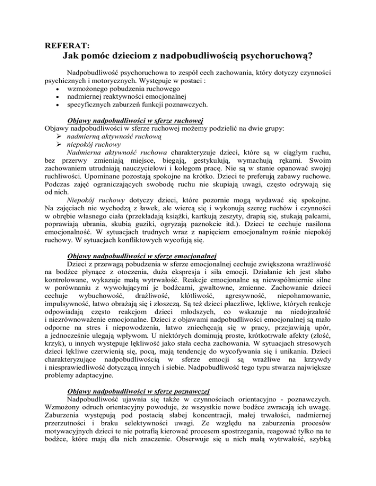 REFERAT: Jak pomóc dzieciom z nadpobudliwością psychoruchową? Nadpobudliwość psychoruchowa to zespół cech zachowania, który dotyczy czynności psychicznych i motorycznych. Występuje w postaci : · wzmożonego pobudzenia ruchowego · nadmiernej reaktywności emocjonalnej · specyficznych zaburzeń funkcji poznawczych. Objawy nadpobudliwości w sferze ruchowej Objawy nadpobudliwości w sferze ruchowej możemy podzielić na dwie grupy: Ø nadmierną aktywność ruchową Ø niepokój ruchowy Nadmierna aktywność ruchowa charakteryzuje dzieci, które są w ciągłym ruchu, bez przerwy zmieniają miejsce, biegają, gestykulują, wymachują rękami. Swoim zachowaniem utrudniają nauczycielowi i kolegom pracę. Nie są w stanie opanować swojej ruchliwości. Upominane pozostają spokojne na krótko. Dzieci te preferują zabawy ruchowe. Podczas zajęć ograniczających swobodę ruchu nie skupiają uwagi, często odrywają się od nich. Niepokój ruchowy dotyczy dzieci, które pozornie mogą wydawać się spokojne. Na zajęciach nie wychodzą z ławek, ale wiercą się i wykonują szereg ruchów i czynności w obrębie własnego ciała (przekładają książki, kartkują zeszyty, drapią się, stukają palcami, poprawiają ubrania, skubią guziki, ogryzają paznokcie itd.). Dzieci te cechuje nasilona emocjonalność. W sytuacjach trudnych wraz z napięciem emocjonalnym rośnie niepokój ruchowy. W sytuacjach konfliktowych wycofują się. Objawy nadpobudliwości w sferze emocjonalnej Dzieci z przewagą pobudzenia w sferze emocjonalnej cechuje zwiększona wrażliwość na bodźce płynące z otoczenia, duża ekspresja i siła emocji. Działanie ich jest słabo kontrolowane, wykazuje małą wytrwałość. Reakcje emocjonalne są niewspółmiernie silne w porównaniu z wywołującymi je bodźcami, gwałtowne, zmienne. Zachowanie dzieci cechuje wybuchowość, drażliwość, kłótliwość, agresywność, niepohamowanie, impulsywność, łatwo obrażają się i złoszczą. Są też dzieci płaczliwe, lękliwe, których reakcje odpowiadają często reakcjom dzieci młodszych, co wskazuje na niedojrzałość i niezrównoważenie emocjonalne. Dzieci z objawami nadpobudliwości emocjonalnej są mało odporne na stres i niepowodzenia, łatwo zniechęcają się w pracy, przejawiają upór, a jednocześnie ulegają wpływom. U niektórych dominują proste, krótkotrwałe afekty (złość, krzyk), u innych występuje lękliwość jako stała cecha zachowania. W sytuacjach stresowych dzieci lękliwe czerwienią się, pocą, mają tendencję do wycofywania się i unikania. Dzieci charakteryzujące nadpobudliwością w sferze emocji są wrażliwe na krzywdy i niesprawiedliwość dotyczącą innych i siebie. Nadpobudliwość tego typu stwarza największe problemy adaptacyjne. Objawy nadpobudliwości w sferze poznawczej Nadpobudliwość ujawnia się także w czynnościach orientacyjno - poznawczych. Wzmożony odruch orientacyjny powoduje, że wszystkie nowe bodźce zwracają ich uwagę. Zaburzenia występują pod postacią słabej koncentracji, małej trwałości, nadmiernej przerzutności i braku selektywności uwagi. Ze względu na zaburzenia procesów motywacyjnych dzieci te nie potrafią kierować procesem spostrzegania, reagować tylko na te bodźce, które mają dla nich znaczenie. Obserwuje się u nich małą wytrwałość, szybką męczliwość, wahania mobilizacji psychicznej. Konsekwencją tych zaburzeń jest „roztrzepanie”, zapominanie, chaotyczność, słaba organizacja działania, pochopność w wyciąganiu wniosków. Dzieci takie często zmieniają zadania i mają problemy z doprowadzeniem ich do końca. Są rozkojarzone i roztargnione. Dlatego mimo dobrej sprawności intelektualnej mają słabe wyniki w nauce. Nadpobudliwość może objawiać się we wszystkich omawianych zakresach. Dzieci takie sprawiają szczególnie wiele trudności wychowawczych. Dorośli nie rozumiejąc przyczyn zmienności ich zachowania i rezultatów pracy sądzą, że dziecko, jak chce to „potrafi”, dopatrując się „złej woli”. Dlatego w wielu przypadkach dochodzi, wskutek błędów wychowawczych, do wtórnego wzmożenia pobudzenia i pogłębienia dezorganizacji zachowania oraz funkcjonowania społecznego. U niektórych dzieci nadpobudliwych psychoruchowo występują dodatkowe zaburzenia tworzące skomplikowane powiązania przyczynowo – skutkowe: ¨ zaburzenia snu, lęki dzienne i nocne, moczenie się, tiki, jąkanie, samogwałt itp. Objawy te mogą być wyrazem zaburzonej równowagi procesów nerwowych (przewaga pobudzenia). Jeżeli jednak nadpobudliwość ta nie jest leczona, brak jest korektywnego postępowania pedagogicznego a otoczenie reaguje niewłaściwie, objawy te ulegają utrwaleniu i następuje proces znerwicowania się dziecka; ¨ wybiórcze opóźnienia rozwoju funkcji percepcyjno - motorycznych. ¨ tiki - ruchy mimowolne - są to niezależne od woli, niecelowe i wielokrotnie powtarzające się skurcze pojedynczych mięśni w obrębie twarzy, szyi, tułowia i kończyn. ¨ moczenie mimowolne - bezwiedne, powtarzające się oddawanie moczu w dzień i w nocy u dzieci do 5. r. ż., u których nawyk kontrolowanego oddawania moczu powinien być już wykształcony. ¨ mimowolne popuszczanie kału jest przejawem zaburzeń emocjonalnych dziecka, związanych z niezaspakajaniem jego potrzeb psychicznych (bezpieczeństwa, akceptacji, uznania). Dziecko z nadpobudliwością psychoruchową w szkole W okresie wczesnoszkolnym (7-10 lat) wymagania w postaci szkolnych obowiązków i zadań stawianych dzieciom tworzą trudną dla nich sytuację. Toteż okres ich przystosowania do nowych warunków jest na ogół dłuższy, a adaptacja burzliwsza, niż u rówieśników nieprzejawiających wcześniej nadaktywności psychoruchowej. W tym też okresie najłatwiej jest postawić właściwą diagnozę po to, by jak najszybciej przeciwdziałać negatywnym skutkom, jakie ze sobą niesie wzmożona aktywność psycho