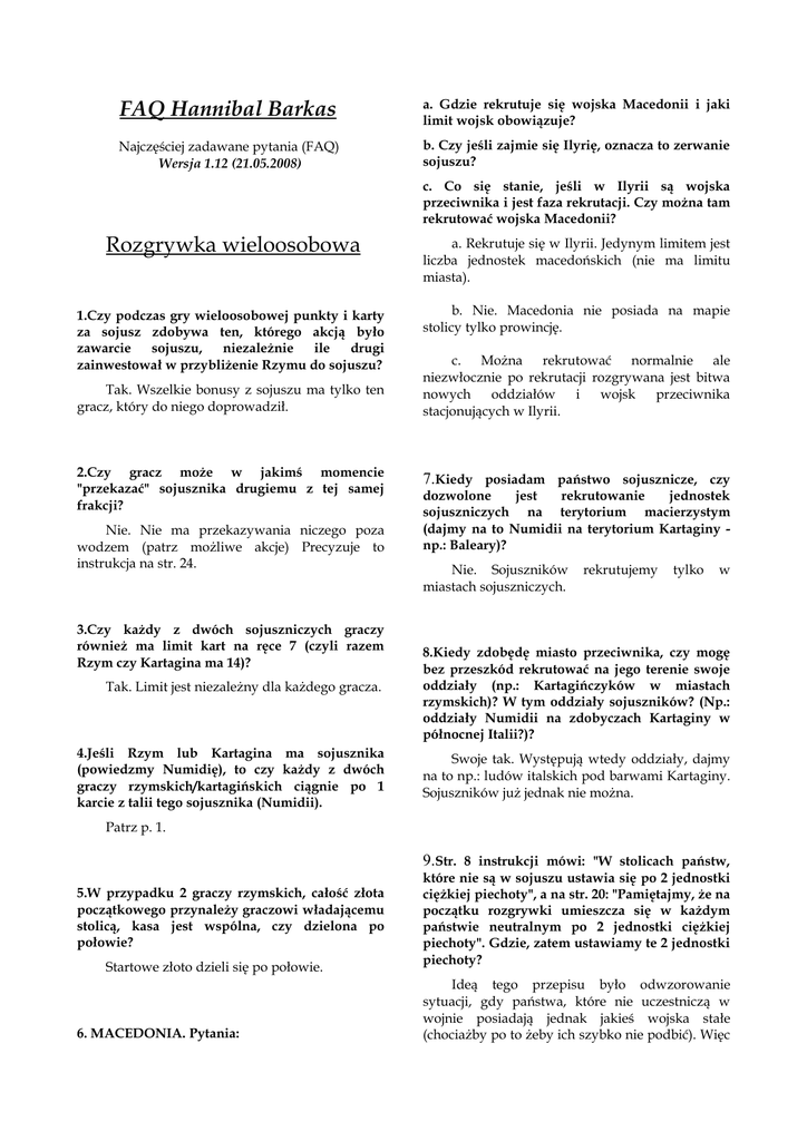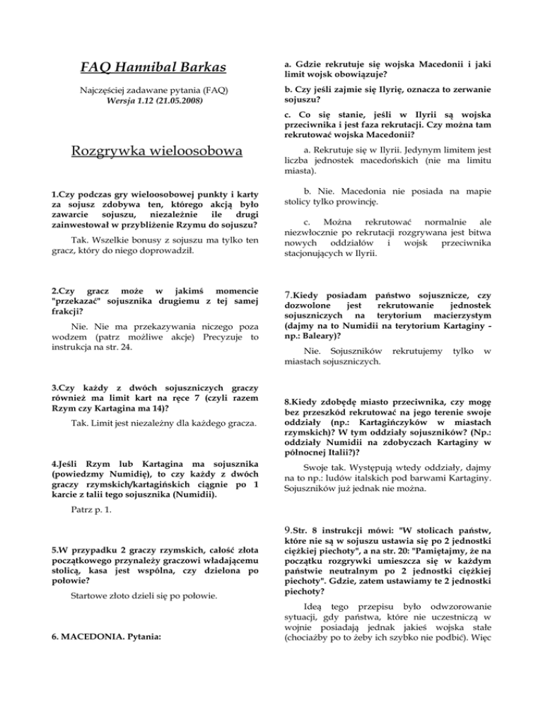 FAQ Hannibal Barkas a. Gdzie rekrutuje się wojska Macedonii i jaki limit wojsk obowiązuje? Najczęściej zadawane pytania (FAQ) Wersja 1.12 (21.05.2008) b. Czy jeśli zajmie się Ilyrię, oznacza to zerwanie sojuszu? c. Co się stanie, jeśli w Ilyrii są wojska przeciwnika i jest faza rekrutacji. Czy można tam rekrutować wojska Macedonii? Rozgrywka wieloosobowa a. Rekrutuje się w Ilyrii. Jedynym limitem jest liczba jednostek macedońskich (nie ma limitu miasta). 1.Czy podczas gry wieloosobowej punkty i karty za sojusz zdobywa ten, którego akcją było zawarcie sojuszu, niezależnie ile drugi zainwestował w przybliżenie Rzymu do sojuszu? b. Nie. Macedonia nie posiada na mapie stolicy tylko prowincję. Tak. Wszelkie bonusy z sojuszu ma tylko ten gracz, który do niego doprowadził. 2.Czy gracz może w jakimś momencie "przekazać" sojusznika drugiemu z tej samej frakcji? Nie. Nie ma przekazywania niczego poza wodzem (patrz możliwe akcje) Precyzuje to instrukcja na str. 24. 3.Czy każdy z dwóch sojuszniczych graczy również ma limit kart na ręce 7 (czyli razem Rzym czy Kartagina ma 14)? c. Można rekrutować normalnie ale niezwłocznie po rekrutacji rozgrywana jest bitwa nowych oddziałów i wojsk przeciwnika stacjonujących w Ilyrii. 7.Kiedy posiadam państwo sojusznicze, czy dozwolone jest rekrutowanie jednostek sojuszniczych na terytorium macierzystym (dajmy na to Numidii na terytorium Kartaginy np.: Baleary)? Nie. Sojuszników miastach sojuszniczych. rekrutujemy tylko w Tak. Limit jest niezależny dla każdego gracza. 8.Kiedy zdobędę miasto przeciwnika, czy mogę bez przeszkód rekrutować na jego terenie swoje oddziały (np.: Kartagińczyków w miastach rzymskich)? W tym oddziały sojuszników? (Np.: oddziały Numidii na zdobyczach Kartaginy w północnej Italii?)? 4.Jeśli Rzym lub Kartagina ma sojusznika (powiedzmy Numidię), to czy każdy z dwóch graczy rzymskich/kartagińskich ciągnie po 1 karcie z talii tego sojusznika (Numidii). Swoje tak. Występują wtedy oddziały, dajmy na to np.: ludów italskich pod barwami Kartaginy. Sojuszników już jednak nie można. Patrz p. 1. 9.Str. 8 instrukcji mówi: "W stolicach państw, 5.W przypadku 2 graczy rzymskich, całość złota początkowego przynależy graczowi władającemu stolicą, kasa jest wspólna, czy dzielona po połowie? Startowe złoto dzieli się po połowie. 6. MACEDONIA. Pytania: które nie są w sojuszu ustawia się po 2 jednostki ciężkiej piechoty", a na str. 20: "Pamiętajmy, że na początku rozgrywki umieszcza się w każdym państwie neutralnym po 2 jednostki ciężkiej piechoty". Gdzie, zatem ustawiamy te 2 jednostki piechoty? Ideą tego przepisu było odwzorowanie sytuacji, gdy państwa, które nie uczestniczą w wojnie posiadają jednak jakieś wojska stałe (chociażby po to żeby ich szybko nie podbić). Więc na str. 20 powinno być: "Pamiętajmy, że na początku rozgrywki umieszcza się w stolicy każdego państwa, które nie jest w żadnym sojuszu po 2 jednostki ciężkiej piechoty w barwach tego państwa." 10.Czy Syrakuzy mogą atakować niezależne nacje, np. Numidię? Syrakuzy nie mogą prowadzić niezależnej polityki reprezentowanej na torze politycznym. Nie mogą, zatem atakować państw neutralnych. 14.Aby armia przystąpiła do szturmu trzeba ją aktywować ( armia rozpoczyna ruch na obszarze z miastem). Tak, ponieważ szturm wymaga aktywowania wojsk. 15.Po szturmie armia od razu przechodzi do oblężenia a karta miasta pozostaje na torze oblężenia. Następnie w fazie oblężenia jest przeprowadzana jest procedura oblężenia. A co w przypadku, jeżeli armia jest za mała, aby prowadzić oblężenie? Czy karta miasta wraca do gracza od razu po szturmie, czy w fazie oblężenia? 11.Czy Można przekazywać zdobyte miasta między sojusznikami? Jak to wygląda w kwestii zdobywania/tracenia za nie punktów zwycięstwa? W przypadku, gdy armia po szturmie jest za mała do prowadzenia oblężenia to oblężenia nie ma, a karta miasta wraca do właściciela. Kartę miasta otrzymuje ten gracz, który je zdobył i jest rozszerzeniem jego bazowej strefy wpływów. On jest właścicielem miasta i nie może go przekazywać innym graczom. 16.Czy karty takie jak choroby oddziałują również na załogi stałe (poziom umocnień) oblężonych miast? 12.Czy się wspierać wzajemnie kartami w bitwie, czy kart można używać tylko w swojej? I czy można rzucać karty, które dają efekty po wygranej, gdy bitwę wygrał sojusznik (np. efekt "zwycięstwo" po wygranej)? Efekty można zagrywać dowolnie. Tylko efekty własnego zwycięstwa wyzyskuje się kartą ‘Zwycięstwo’, która mówi: ‘Zagraj, jeśli odniosłeś zwycięstwo …” ------------------------------------------------- Szturmy i oblężenia 13.Kiedy dokładnie rozstrzygane są szturmy? W fazie akcji czy w fazie oblężenia? Aby rozpocząć szturm należy aktywować armię. A więc w fazie akcji. Nie. Tylko na armie w polu. Obrona miasta to generalizacja: murów obronnych miasta oraz jego załogi stałej. 17.Czy można wykonywać szturmy, wcześniejszego przygotowania oblężenia? bez Oczywiście. To zupełnie niezależne operacje. 18.Czy szturm jest bitwą (czy można zagrywać na niego karty efektów, które dotyczą bitwy, np. „Zasadzka”, wykorzystywać dowodzenie przywódców itd.)? Szturm rozgrywa się analogicznie do bitwy, ale nie jest traktowany jak bitwa. Można używać dowodzenia dowódców ale atakujący nie może zagrywać żadnych efektów ani wykorzystywać zdolności wodzów. ------------------------------------------------- polu, z użyciem transportu floty (flota by kończyła w porcie na tym polu)? Ruchy wojsk Tak. Po prostu mówisz, że wskazane armie kończą ruch na tym samym polu. 19.W instrukcji są podane 3 warunki możliwego ruchu. Jednak nie wynika z tego bezpośrednio czy dopuszczalny jest ruch z jednego regionu do dokładnie jednego innego regionu. Tak. Oczywiście dopuszczalny. 20.Czy armia, która w