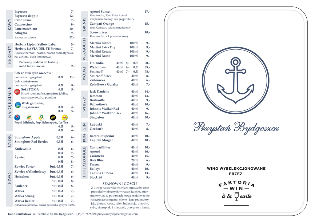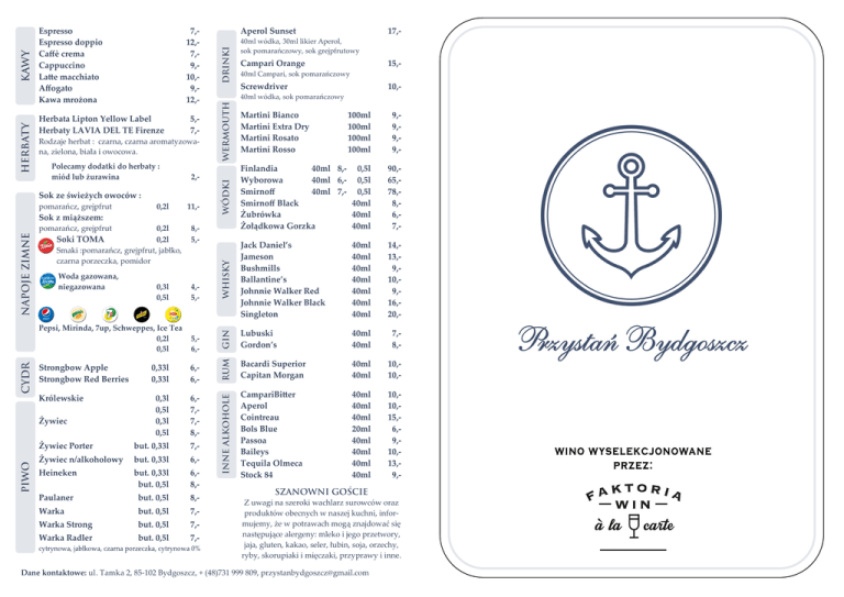 Espresso Espresso doppio Caffè crema Cappuccino Latte macchiato Affogato Kawa mrożona 7,12,7,9,10,9,12,- Herbata Lipton Yellow Label Herbaty LAVIA DEL TE Firenze 5,7,- Rodzaje herbat : czarna, czarna aromatyzowana, zielona, biała i owocowa. Polecamy dodatki do herbaty : miód lub żurawina 2,- Sok ze świeżych owoców : pomarańcz, grejpfrut 0,2l 11,- Sok z miąższem: pomarańcz, grejpfrut 0,2l Soki TOMA 0,2l Smaki :pomarańcz, grejpfrut, jabłko, czarna porzeczka, pomidor Woda gazowana, niegazowana 0,3l 0,5l 8,5,- 4,5,- Aperol Sunset 17,- 40ml wódka, 30ml likier Aperol, sok pomarańczowy, sok grejpfrutowy Campari Orange 15,- 40ml Campari, sok pomarańczowy Screwdriver 10,- 40ml wódka, sok pomarańczowy Martini Bianco Martini Extra Dry Martini Rosato Martini Rosso 100ml 100ml 100ml 100ml 9,9,9,9,- Finlandia 40ml 8,- 0,5l Wyborowa 40ml 6,- 0,5l Smirnoff 40ml 7,- 0,5l Smirnoff Black 40ml Żubrówka 40ml Żołądkowa Gorzka 40ml 90,65,78,8,6,7,- Jack Daniel’s Jameson Bushmills Ballantine’s Johnnie Walker Red Johnnie Walker Black Singleton 40ml 40ml 40ml 40ml 40ml 40ml 40ml 14,13,9,10,9,16,20,- Pepsi, Mirinda, 7up, Schweppes, Ice Tea 0,2l 0,5l 5,6,- Lubuski Gordon’s 40ml 40ml 7,8,- Strongbow Apple Strongbow Red Berries 0,33l 0,33l 6,6,- Bacardi Superior Capitan Morgan 40ml 40ml 10,10,- 0,3l 0,5l 0,3l 0,5l 6,7,7,8,- Żywiec Porter but. 0,33l 7,- Żywiec n/alkoholowy but. 0,33l 6,- Heineken but. 0,33l but. 0,5l 6,8,- CampariBitter Aperol Cointreau Bols Blue Passoa Baileys Tequila Olmeca Stock 84 40ml 40ml 40ml 20ml 40ml 40ml 40ml 40ml 10,10,15,6,9,10,13,9,- Paulaner but. 0,5l 8,- Warka but. 0,5l 7,- Warka Strong but. 0,5l 7,- Warka Radler but. 0,5l 7,- Królewskie Żywiec Z uwagi na szeroki wachlarz surowców oraz produktów obecnych w naszej kuchni, informujemy, że w potrawach mogą znajdować się następujące alergeny: mleko i jego przetwory, jaja, gluten, kakao, seler, łubin, soja, orzechy, ryby, skorupiaki i mięczaki, przyprawy i inne. Dane kontaktowe: ul. Tamka 2, 85-102 Bydgoszcz, + (48)731 999 809, [email protected] Pikantna grillowana karkówka z ćwiartkami ziemniaków i bukietem surówek Tapas z pastą z pieczonej flądry 7,- Gran Lomo Malbec czerwone/wytrawne Gran Lomo - Argentina Tatar ze śledzia holenderskiego 11,białe/wytrawne b 75 cl Prosecco a 10 cl DOC, Villa Delle Camelie, Botter - Italy 59,10,- Jasny, słomkowy kolor z eleganckimi bąbelkami. Bukiet pełen aromatów miodu, kwiatów oraz jabłek. W smaku delikatne, odpowiednio zbalansowane. 27,- b 75 cl a 10 cl 69,11,- Przyjemny fioletowy kolor. Delikatne aromaty jagód i śliwek. Okrągłe i aksamitne taniny tworzą wspaniałe wino. Pierś z kurczaka ułożona na sosie z sera gorgonzola, brokułami i gotowanymi ziemniakami Soave Classico Duca Del Frassino 26,białe/wytrawne DOC, Cantina di Soave – Italy b 75 cl a 10 cl 69,10,- Posiada piękny słomkowy kolor i delikatny aromat białych owoców a zwłaszcza jabłek. Gładkie i harmonijne na podniebieniu. Żeberka w sosie BQQ z frytkami i bukietem sałat z sosem vinegrette Rosół z kawałkami dorsza i makaronem 11,- Primitivo Marchesi Del Salento czerwone/wytrawne IGT Puglia, Castellani - Italy Zupa gulaszowa 13,- Ceviche z łososia na sałacie z pestkami granatu Vinho Verde białe/półwytrawne b 75 cl a 10 cl Alianca - Portugal 31,- b 75 cl a 10 cl 52,9,- Bardzo ciemny, granatowy kolor. Nutami przypraw i żurawiny. Wspaniały owocowy finisz i przyjemne taniny. Makaron tagiatelle z sosem serowym i brokułami 16,- 17,- Dziki ryż z warzywnym ratatui 16,- 52,9,- Palazzo Mio Rosso czerwone/wytrawne IGT Puglia, Mare Magnum - Italy b 75 cl a 10 cl 69 ,11,- Ciemne i pikantne, bogate o owocowym aromacie z nutami ciemnych jagód, śliwek, świeżych ziół i czekolady. Vinho Verde (zielone wino) to jedno z bardziej znanych win portugalskich, którego nazwa nie odnosi się do koloru, a do świeżości i młodości – jego największych zalet, które zapewniły mu światową sławę. Słomkowo-cytrynowy kolor. Zapach tropikalnych owoców. W ustach orzeźwiająca, cytrusowa kwasowość z delikatnym słodkim zakończeniem. Sałatka z grillowanym camembertem, ananasem i żurawiną 16,- Sałatka z grillowanym kurczakiem 15,- Smażony filet z flądry z frytkami i surówką colesław 23,- Grillowany pstrąg z dzikim ryżem i bukietem sałat 25,- Dorsz z puree ziemniaczanym o aromacie wędzonego boczku podany na duszonej białej kapuście z koperkiem 29,- Kressmann Selection Chardonnay Cépage de France, Kressmann – France białe/wytrawne b 75 cl a 10 cl 52 ,9,- Błyszczący, żółty kolor. Wyczuwalne aromaty kwiatów oraz świeżych cytrusów. Na podniebieniu dobrze wyważone, mocne z miłym długim finiszem. W smaku jest bardzo harmonijne. Smakołyk Kubusia Puchatka 15,- Grillowany filet z kurczaka z frytkami i surówką z marchewki Mus z mango 12,- Szarlotka z bitą śmietaną i gałką lodów 14,- Pucharek lodów z sosem, owocami i bitą śmietaną 14,- Vitorino Bianco Medium Dry białe/półwytrawne Vino d’Italia, Botter - Italy b 75 cl a 10 cl 40,7,- b 75 cl a 10 cl 40,7,- Świeże, delikatne, dobrze zbalansowane z wyraźnymi nutami owoców tropikalnych. Vitorino Rosso Medium Dry czerwone/półwytrawne Vino d’Italia, Botter - Italy Świeże, delikatne, dobrze zbalansowane z wyraźnymi nutami owoców leśnych.