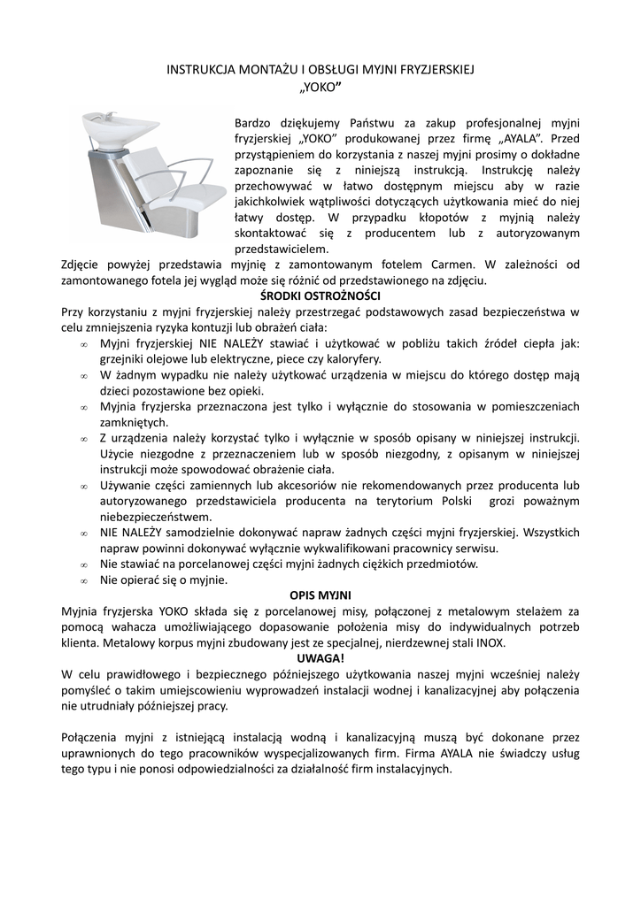 INSTRUKCJA MONTAŻU I OBSŁUGI MYJNI FRYZJERSKIEJ „YOKO”