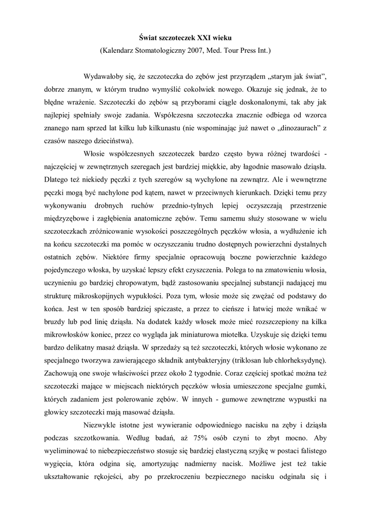 Świat szczoteczek XXI wieku (Kalendarz Stomatologiczny 2007, Med. Tour Press Int.) Wydawałoby się, że szczoteczka do zębów jest przyrządem „starym jak świat”, dobrze znanym, w którym trudno wymyślić cokolwiek nowego. Okazuje się jednak, że to błędne wrażenie. Szczoteczki do zębów są przyborami ciągle doskonalonymi, tak aby jak najlepiej spełniały swoje zadania. Współczesna szczoteczka znacznie odbiega od wzorca znanego nam sprzed lat kilku lub kilkunastu (nie wspominając już nawet o „dinozaurach” z czasów naszego dzieciństwa). Włosie współczesnych szczoteczek bardzo często bywa różnej twardości najczęściej w zewnętrznych szeregach jest bardziej miękkie, aby łagodnie masowało dziąsła. Dlatego też niekiedy pęczki z tych szeregów są wychylone na zewnątrz. Ale i wewnętrzne pęczki mogą być nachylone pod kątem, nawet w przeciwnych kierunkach. Dzięki temu przy wykonywaniu drobnych ruchów przednio-tylnych lepiej oczyszczają przestrzenie międzyzębowe i zagłębienia anatomiczne zębów. Temu samemu służy stosowane w wielu szczoteczkach zróżnicowanie wysokości poszczególnych pęczków włosia, a wydłużenie ich na końcu szczoteczki ma pomóc w oczyszczaniu trudno dostępnych powierzchni dystalnych ostatnich zębów. Niektóre firmy specjalnie opracowują boczne powierzchnie każdego pojedynczego włoska, by uzyskać lepszy efekt czyszczenia. Polega to na zmatowieniu włosia, uczynieniu go bardziej chropowatym, bądź zastosowaniu specjalnej substancji nadającej mu strukturę mikroskopijnych wypukłości. Poza tym, włosie może się zwężać od podstawy do końca. Jest w ten sposób bardziej spiczaste, a przez to cieńsze i łatwiej może wnikać w bruzdy lub pod linię dziąsła. Na dodatek każdy włosek może mieć rozszczepiony na kilka mikrowłosków koniec, przez co wygląda jak miniaturowa miotełka. Uzyskuje się dzięki temu bardzo delikatny masaż dziąsła. W sprzedaży są też szczoteczki, których włosie wykonano ze specjalnego tworzywa zawierającego składnik antybakteryjny (triklosan lub chlorheksydynę). Zachowują one swoje właściwości przez około 2 tygodnie. Coraz częściej spotkać można też szczoteczki mające w miejscach niektórych pęczków włosia umieszczone specjalne gumki, których zadaniem jest polerowanie zębów. W innych - gumowe zewnętrzne wypustki na głowicy szczoteczki mają masować dziąsła. Niezwykle istotne jest wywieranie odpowiedniego nacisku na zęby i dziąsła podczas szczotkowania. Według badań, aż 75% osób czyni to zbyt mocno. Aby wyeliminować to niebezpieczeństwo stosuje się bardziej elastyczną szyjkę w postaci falistego wygięcia, która odgina się, amortyzując nadmierny nacisk. Możliwe jest też takie ukształtowanie rękojeści, aby po przekroczeniu bezpiecznego nacisku odginała się i utrudniała szczotkowanie, powodując tym samym odruchowe zmniejszenie nacisku. Innym rozwiązaniem jest takie zaprojektowanie rączki, aby wyginała się z wyraźnie wyczuwalnym kliknięciem w chwili przekroczenia dopuszczalnej siły nacisku, informując o potrzebie jej zmniejszenia. Są też szczoteczki, które w tym krytycznym momencie wydają ostrzegawczy sygnał dźwiękowy. Również spotkać można szczotki mające głowice podzielone na kilka ruchomych części połączonych gumą. Ma to formę elastycznych „stawów” pozwalających na ruchomość poszczególnych części. Zapobiega to również zbytniemu naciskowi, a także sprawia, że głowica szczoteczki dostosowuje swój kształt do budowy łuków zębowych. Rękojeści współczesnych szczoteczek wykazują mniejsze zmiany. Często kształtowane są bardziej ergonomicznie, odpowiadają anatomicznemu kształtowi dłoni, pokryte są dodatkowo warstwą gumy, aby polepszyć pewność uchwytu i uniemożliwić ślizganie się szczoteczki w mokrej często dłoni. Poważnej ewolucji ulegają też szczoteczki elektryczne. Wykonują one dość skomplikowane, o dużej częstotliwości ruchy w wielu kierunkach, mają kilka wymiennych końcówek, w tym do przestrzeni międzyzębowych, masażu dziąseł, do wybielania zębów, oczyszczania języka. Dają one także np. możliwość obrotów każdego pęczka w inną stronę lub wykorzystują dodatkowo fale akustyczne. Jest to już jednak zupełnie inne zagadnienie. Czołowi światowi producenci prześcigają się w pomysłach jak jeszcze udoskonalić prosty wydawałoby się przyrząd, jakim jest szczoteczka do zębów. Futurystycznym przykładem może być szczoteczka opracowana przez japońskich naukowców. Ma ona zamontowaną miniaturową kamerę wideo, którą wystarczy podłączyć do monitora, aby dokładnie obejrzeć przebieg szczotkowania. Jak widać, świat szczoteczek XXI wieku jawi się bardzo ciekawie, a specjalistom zajmującym się ich projektowaniem i produkcją nowych pomysłów na pewno nie zabraknie.