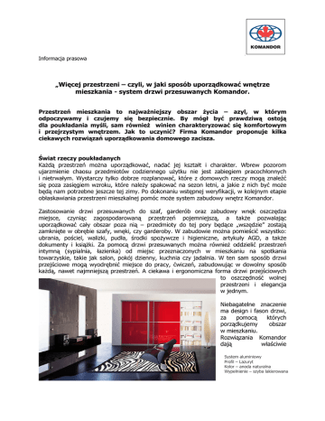 Informacja prasowa „Więcej przestrzeni – czyli, w jaki sposób uporządkować wnętrze mieszkania - system drzwi przesuwanych Komandor. Przestrzeń mieszkania to najważniejszy obszar życia – azyl, w którym odpoczywamy i czujemy się bezpiecznie. By mógł być prawdziwą ostoją dla poukładania myśli, sam również winien charakteryzować się komfortowym i przejrzystym wnętrzem. Jak to uczynić? Firma Komandor proponuje kilka ciekawych rozwiązań uporządkowania domowego zacisza. Świat rzeczy poukładanych Każdą przestrzeń można uporządkować, nadać jej kształt i charakter. Wbrew pozorom ujarzmienie chaosu przedmiotów codziennego użytku nie jest zabiegiem pracochłonnych i nietrwałym. Wystarczy tylko dobrze rozplanować, które z domowych rzeczy mogą znaleźć się poza zasięgiem wzroku, które należy spakować na sezon letni, a jakie z nich być może będą nam potrzebne jeszcze tej zimy. Po dokonaniu wstępnej weryfikacji, w kolejnym etapie obłaskawiania przestrzeni mieszkalnej pomóc może system zabudowy wnętrz Komandor. Zastosowanie drzwi przesuwanych do szaf, garderób oraz zabudowy wnęk oszczędza miejsce, czyniąc zagospodarowaną przestrzeń pojemniejszą, a także pozwalając uporządkować cały obszar poza nią – przedmioty do tej pory będące „wszędzie” zostają zamknięte w obrębie szafy, wnęki, czy garderoby. W zabudowie można pomieścić wszystko: ubrania, pościel, walizki, pudła, środki spożywcze i higieniczne, artykuły AGD, a także dokumenty i książki. Za pomocą drzwi przesuwanych można również oddzielić przestrzeń intymną (sypialnia, łazienka) od miejsc przeznaczonych w mieszkaniu na spotkania towarzyskie, takie jak salon, pokój dzienny, kuchnia czy jadalnia. W ten sam sposób drzwi przejściowe mogą wyodrębnić miejsce do pracy, ćwiczeń, zabudowując w dowolny sposób każdą, nawet najmniejszą przestrzeń. A ciekawa i ergonomiczna forma drzwi przejściowych to oszczędność wolnej przestrzeni i elegancja w jednym. Niebagatelne znaczenie ma design i fason drzwi, za pomocą których porządkujemy obszar w mieszkaniu. Rozwiązania Komandor dają właściwie System aluminiowy Profil – Lazuryt Kolor – anoda naturalna Wypełnienie – szyba lakierowana nieograniczone możliwości projektowe z zastosowaniem szerokiej gamy materiałów wykorzystywanych w produkcji, począwszy od płyty meblowej, poprzez maty rattanowe, bambusowe, loom, szkło malowane lacobel, lacomat – wszystkie w bogatej palecie barw – a skończywszy na szybach mlecznych i lustrach (podklejanych folią zabezpieczającą przed odpryskiwaniem i zwiększającą odporność na stłuczenia). Sposób łączenia surowców i aranżacji kolorystycznych zależy od indywidualnego gustu odbiorcy i od efektu, jaki chcemy osiągnąć przy tego typu zabudowie. Drzwi mogą nadać wnętrzu nowoczesne oblicze, stanowić jego atrakcyjny akcent jak również mogą być tylko dyskretnym tłem wkomponowanym w charakter pomieszczenia. Od ogółu do szczegółu Zabudowy Komandor wykonywane są z wysokiej jakości materiałów, a o ich niezawodności świadczy dobrze zaprojektowana konstrukcja. Najważniejszymi elementami we wszystkich systemach drzwi przesuwanych są profile (ramy do drzwi zwane ramiakami) oraz elementy jezdne (prowadniki górne i wózki dolne), pozwalające swobodnie przesuwać drzwi po torze górnym i dolnym. Ramiaki i tory wykonane są z dwóch rodzajów materiału. W systemach stalowych jest to stal malowana lub foliowana, w systemach aluminiowych – aluminium anodowane, lakierowane lub pokryte okleiną drewnopodobną. Dostępne w wielu kolorach. Tory montowane są do podłogi, sufitu lub cokołu i wieńca szafy. Prowadnik górny jest elementem konstrukcyjnym zapewniającym komfort użytkowania, składa się z korpusu oraz dwóch lub trzech niezależnie obracających się rolek. Wózek dolny natomiast jest elementem przenoszącym cały ciężar drzwi oraz pozwalającym regulować je, w ten sposób dopasowując do krzywizn ścian i sufitów (nawet do 2 cm). Materiały wykorzystane do produkcji elementów jezdnych to tworzywa sztuczne (wzmacniane włóknem szklanym), stal oraz stopy metali nieżelaznych. Rolka w wózku dolnym jest łożyskowana, a w prowadniku górnym przygotowana z tworzywa sztucznego. Zabudowy wykonane są z płyt laminowanych o grubościach 18 i 28 mm, a obrzeża płyt wykończone okleiną meblową PCV. Przy projektowaniu kształtu profili korzystano z nowoczesnych trendów światowego wzornictwa, nadając im atrakcyjny i oryginalny wygląd. System aluminiowy umożliwia wykonanie drzwi przejściowych, np. między pomieszczeniami, ponieważ elementy są jednakowe z obydwu stron, a wózki jezdne zamontowane wewnątrz ram drzwiowych W tym systemie możliwe jest wykonanie drzwi skośnych, np. przy zabudowie poddaszy, także drzwi niestandardowych (wyższe pomieszczenia), oraz drzwi otwieranych na zawiasach lub przesuwno-składanych. System aluminiowy Profil – Art Deco Kolor – anoda naturalna Wypełnienie – jabłoń locarno i szyba mleczna Dostępne w pięciu wersjach: Art Decor, Lazuryt, Agat, Onyx i Topaz, produkowane w sumie w 10 kolorach. Systemy stalowe wykonane są z taśmy stalowej najwyższej jakości. Obecnie w ofercie znajduje się 14 kolorów profili. Systemy stalowe produkowane są w trzech wersjach: Standard, Lux i Magnetyt. Dobrze sprawdzają się w sypialni, pokoju, przedpokoju, korytarzu, garderobie, kuchni i łazience. Sztuka zamknięta w aluminium Lazuryt jest profilem aluminiowym o subtelnym, nowoczesnym kształcie, sprawiający wrażenie niezwykle delikatnego. Konstruktorzy tego profilu zadbali o to, by szafy wykończone Lazurytem nabierały szlachetnych kształtów sprawiając wrażenie dzieł sztuki o wyrafinowanym smaku. Gładka powierzchnia, delikatnie zaokrąglona oraz smukła linia nadają mu wzniosłego charakteru. Szafy wykończone tym profilem dobrze komponują się z wnętrzami klasyczn