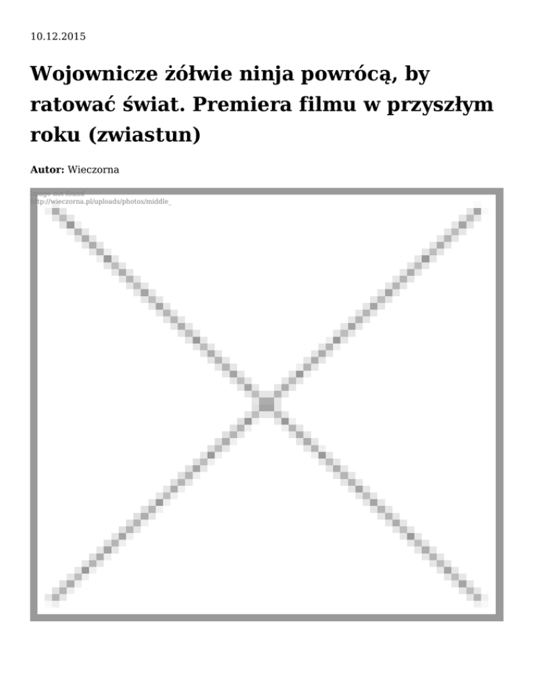 10.12.2015 Wojownicze żółwie ninja powrócą, by ratować świat. Premiera filmu w przyszłym roku (zwiastun) Autor: Wieczorna Image not found http://wieczorna.pl/uploads/photos/middle_ (Źródło: http://www.wiadomosci24.pl/artykul/wojownicze_zolwie_ninja_powroca_by_ratowac_swiat_premiera_fi "Teenage Mutant Ninja Turtles: Out of the Shadows" - taki oficjalny tytuł nosić będzie kontynuacja flmu "Wojownicze żółwie ninja". Na ekranie zobaczymy m.in. Megan Fox.