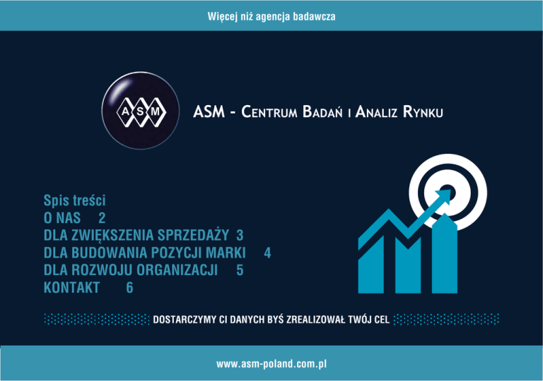 Więcej niż agencja badawcza ASM - Centrum Badań i Analiz Rynku Spis treści O NAS 2 DLA ZWIĘKSZENIA SPRZEDAŻY 3 DLA BUDOWANIA POZYCJI MARKI 4 DLA ROZWOJU ORGANIZACJI 5 KONTAKT 6 DOSTARCZYMY CI DANYCH BYŚ ZREALIZOWAŁ TWÓJ CEL www.asm-poland.com.pl Więcej niż agencja badawcza O NAS ASM - Centrum Badań i Analiz Rynku ASM – Centrum Badań i Analiz Rynku to polska firma działająca od 1996 r. w kraju i w Europie. Posiadamy status centrum badawczo-rozwojowego. Pracujemy w następujących obszarach: • marketingowe badania i analizy rynku dla przedsiębiorstw, • gotowe raporty rynkowe, • badania i projekty na zlecenie instytucji publicznych, • nowatorskie projekty międzynarodowe, • Branżowe Programy Promocji Ministerstwa Gospodarki, • klastry i stowarzyszenia sektorowe. Wieloletnie doświadczenie ASM zaowocowało osiągnięciem 1-go miejsca na rynku usług badawczych zlecanych przez firmy z sektora budowlanego oraz 3-go miejsca na rynku usług badawczych zlecanych przez instytucje z sektora publicznego . (wg raportu Polskiego Towarzystwa Badaczy Rynku i Opinii opublikowanego w 2014 r.) Jako jedyna agencja badawcza w Polsce, ASM jest laureatem wielu nagród w dziedzinie innowacyjności oraz zwycięzcą rankingów innowacyjności przeprowadzanych przez instytucje naukowe. Nasze osiągnięcia to między innymi: • Innowator Wprost 2013, • EUROSYMBOL Synergii Nauki i Biznesu 2013, • Laury Buildera 2014 i 2012, • Innowacja Roku 2011 i 2008, • Nagroda Kryształowej Brukselki 2010, • 19 miejsce w organizowanym przez INE PAN rankingu 500 najbardziej innowacyjnych przedsiębiorstw w Polsce w 2009 roku, • Pierwsza nagroda w kategorii małe i średnie przedsiębiorstwo oraz w ogólnopolskim rankingu jako najbardziej innowacyjne przedsiębiorstwo w Polsce w Rankingu 500 najbardziej innowacyjnych przedsiębiorstw w 2007 roku. Powrót www.asm-poland.com.pl Więcej niż agencja badawcza DLA ZWIĘKSZENIA SPRZEDAŻY JEŚLI ASM - Centrum Badań i Analiz Rynku WDROŻYMY REKOMENDACJE SPRAWDŹ KANAŁY DYSTRYBUCJI TWOJA SPRZEDAŻ JEST NIEZADOWALAJĄCA ZAPLANUJEMY STRATEGIĘ WYKONAMY ANALIZĘ POZIOMU SPRZEDAŻY JEŚLI WYNIKI SPRZEDAŻY SPADŁY JEŚLI SPRAWDŹ POZIOM OBSUGI KLIENTA WYKONAMY BADANIE MYSTERY SHOPPING SPRAWDŹ POZIOM KONKURENCYJNOŚCI WYKONAMY BADANIE UDZIAŁÓW RYNKOWYCH ZMIENIŁ SIĘ UKŁAD SIŁ JEŚLI STRUKTURA RYNKU SIĘ NIE ZMIENIłA SPRAWDŹ EFEKTYWNOŚĆ PROMOCJI WDROŻYMY PROMOCJĘ WYKONAMY BADANIE EFEKTYWNOŚCI DZIAŁAŃ I KANAŁÓW DOTARCIA WDROŻYMY SZKOLENIA SPRAWDŹ POTRZEBY KLIENTÓW WYKONAMY BADANIE SEGMENTACJI KLIENTÓW I WIZERUNKU MARKI EFEKT DZIAŁAŃ TWOJA SPRZEDAŻ ROŚNIE Powrót www.asm-poland.com.pl Więcej niż agencja badawcza DLA BUDOWANIA POZYCJI MARKI ASM - Centrum Badań i Analiz Rynku DLA WIEDZY WSZYSTKIE ELEMENTY PROGRAMU - KLUCZ DO STRATEGII RAPORT O POZYCJI TWOJEJ MARKI NA TLE KONKURENCJI SZEROKI ZAKRES BADANIA 37 kategorii MIARODAJNA Klasyfikacja DLA PROMOCJI DLA BUDOWANIA ZAUFANIA KLIENTÓW SZEROKI ZAKRES PUBLIKACJI AKTUALNE Wyniki www.rankingmarekbudowlanych.pl Aby wziąć udział w programie należy wypełnić Deklarację Uczestnictwa, która jest dostępna na stronie www.rankingmarekbudowlanych.pl. Informacji o Rankingu Budowlana Marka Roku udzielają: Joanna Florczak - Czujwid Senior Project Manager tel. +48 (24) 355 77 80, kom. 697 134 770 e-mail: [email protected] Elzbieta Czerniec PR Manager tel. +48 (24) 355 77 95, kom. 605 218 999 e-mail: [email protected] www.asm-poland.com.pl rkę ie a n m z tec swoją u k s uj m o pr Powrót Więcej niż agencja badawcza DLA ROZWOJU ORGANIZACJI ASM - Centrum Badań i Analiz Rynku JEŚLI WDROŻYMY REKOMENDACJE SPRAWDŹ MOŻLIWOŚCI SWOJEJ FIRMY CHCESZ ROZWIJAĆ TWOJĄ FIRMĘ ZAPLANUJEMY STRATEGIĘ WYKONAMY ANALIZĘ POTENCJAŁU FIRMY I PRODUKTÓW JEŚLI DYSTRYBUCJA KRAJOWA JEST ZA MAŁO WYKORZYSTANA SPRAWDŹ OPTYMALNE KANAŁY SPRZEDAŻY WYKONAMY BADANIE ZWYCZAJÓW ZAKUPOWYCH KLIENTÓW WDROŻYMY SZKOLENIA JEŚLI JEST POTRZEBA EKSPLORACJI NOWYCH RYNKÓW SPRAWDŹ OPTYMALNE RYNKI ZAGRANICZNE WYKONAMY ANALIZĘ POTENCJAŁU MARKI NA DANYM RYNKU WYSZUKAMY ŹRÓDŁA FINANSOWANIA STWORZYMY PROJEKT INWESTYCYJNY EFEKT DZIAŁAŃ - ROZWÓJ TWOJEJ ORGANIZACJI Powrót www.asm-poland.com.pl Więcej niż agencja badawcza KONTAKT ASM - Centrum Badań i Analiz Rynku ul. Grunwaldzka 5, 99-301 Kutno tel. +48 (24) 355 77 00, faks +48 (24) 355 77 01 e-mail: [email protected] Zapewniamy współpracę z wykwalifikowanym zespołem adekwatnym do podejmowanego przedsięwzięcia oraz możliwość połączenia działań komercyjnych i współfinansowanych ze środków publicznych. Obsługa przedsiębiorstw na rynku polskim, gotowe opracowania branżowe Joanna Florczak-Czujwid Dział Analiz Sektorowych i Foresightu tel. +48 (24) 355 77 80, kom. 697 134 770, e-mail: [email protected] Obsługa przedsiębiorstw i instytucji na rynkach międzynarodowych Projekty R&D firm prywatnych i instytucji publicznych współfinansowane przez Komisję Europejską Agnieszka Kowalska Dział Współpracy Mędzynarodowej tel. +48 (24) 355 77 54, kom. 605 208 999, e-mail: [email protected] Obsługa przedsiębiorstw i instytucji w zakresie pozyskiwania i rozliczania zewnętrznych źródeł finansowania w przedsięwzięciach krajowych Marek Skrzyński Dział Funduszy Strukturalnych tel. +48 (24) 355 77 55, kom. 697 145 730, e-mail: [email protected] Powrót www.asm-poland.com.pl