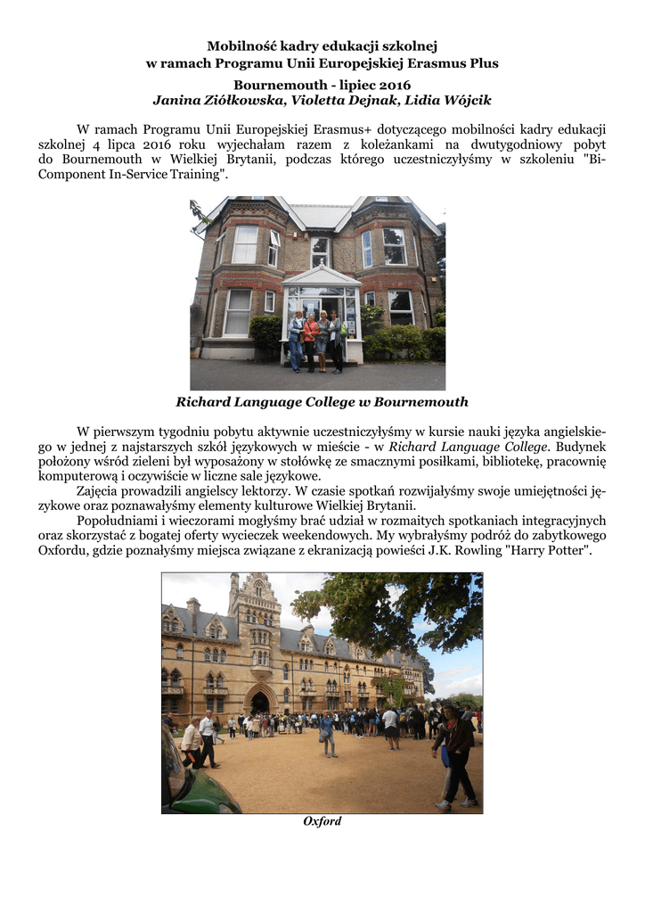 Mobilność kadry edukacji szkolnej w ramach Programu Unii Europejskiej Erasmus Plus Bournemouth - lipiec 2016 Janina Ziółkowska, Violetta Dejnak, Lidia Wójcik W ramach Programu Unii Europejskiej Erasmus+ dotyczącego mobilności kadry edukacji szkolnej 4 lipca 2016 roku wyjechałam razem z koleżankami na dwutygodniowy pobyt do Bournemouth w Wielkiej Brytanii, podczas którego uczestniczyłyśmy w szkoleniu "BiComponent In-Service Training". Richard Language College w Bournemouth W pierwszym tygodniu pobytu aktywnie uczestniczyłyśmy w kursie nauki języka angielskiego w jednej z najstarszych szkół językowych w mieście - w Richard Language College. Budynek położony wśród zieleni był wyposażony w stołówkę ze smacznymi posiłkami, bibliotekę, pracownię komputerową i oczywiście w liczne sale językowe. Zajęcia prowadzili angielscy lektorzy. W czasie spotkań rozwijałyśmy swoje umiejętności językowe oraz poznawałyśmy elementy kulturowe Wielkiej Brytanii. Popołudniami i wieczorami mogłyśmy brać udział w rozmaitych spotkaniach integracyjnych oraz skorzystać z bogatej oferty wycieczek weekendowych. My wybrałyśmy podróż do zabytkowego Oxfordu, gdzie poznałyśmy miejsca związane z ekranizacją powieści J.K. Rowling "Harry Potter". Oxford Atutem wyjazdu było zakwaterowanie u angielskich rodzin, ponieważ wspólnie spędzony czas pozwolił nam pokonać stres, przełamać znane stereotypy na temat Anglików i jeszcze lepiej poznać tamtejszą kulturę oraz codzienne zwyczaje. Nasi gospodarze byli bardzo uprzejmi i taktowni, zawsze można było z nimi porozmawiać i pożartować. w ich domach obok nas mieszkali także studenci z różnych kontynentów. My miałyśmy okazję poznać Hiszpanów, Arabów, Czechów i Koreańczyków. Wspólne spotkania z obcokrajowcami, podczas których konwersowaliśmy ze sobą dostarczyły nam niezapomnianych wrażeń na temat ich krajów, pobytu w Anglii, a przede wszystkim nas samych. Były to kapitalne doświadczenia kulturowe i lingwistyczne. Kolejny tydzień spędziłyśmy na obserwacji zajęć szkolnych w Pokesdown Primary School. Rozłożysty, jednopiętrowy budynek szkolny bardzo się różnił od naszej macierzystej szkoły, ponieważ był przystosowany dla dzieci niepełnosprawnych jeżdżących na wózkach inwalidzkich. Posiadał ciekawe rozwiązania architektoniczne do których należały m.in. sale lekcyjne wyposażone w bezpośrednie wyjścia na zewnątrz oraz biblioteka z multimediami i czytelnią znajdująca się w centrum budynku. Podobały nam się przestronne sale klasowe, w których były ośmioosobowe stoliki, szafki z szufladami na pomoce, biblioteczka, tablica interaktywna, przesuwane tablice suchościeralne. Ściany ozdobione były pracami uczniów, projektami, zasadami zachowania. Zeszyty, książki i przybory miały swoje miejsce na wyznaczonych półkach lub w pojemnikach. Zajęcia prowadzone były przez nauczyciela, którego wspomagał asystent. Uczniowie zachowywali się spokojne i grzecznie. Chętnie wykonywali polecenia i byli zainteresowani wykonywaną pracą. Zwróciłyśmy uwagę na to, że rodzice tylko w uzasadnionych przypadkach mogli wchodzić na teren szkoły, ponieważ wszystkie sprawy klasowe i indywidualne uczniów omawiane są na ustalonych zebraniach. Pokesdown Primary School w Bournemouth Uczestniczenie w zajęciach w angielskiej szkole podstawowej i obserwowanie organizacji pracy nauczycieli i uczniów było dla nas bardzo ciekawym i pouczającym doświadczeniem. Pobyt w Bournemouth: • podniósł poziom naszych umiejętności językowych oraz pogłębił naszą wiedzę na temat zagadnień kulturowych i społecznych w Wielkiej Brytanii, • umożliwił nam zdobycie praktycznych umiejętności istotnych w pracy nauczyciela, • wzbogacił nasz rozwój zawodowy, • przyczynił się do poszerzenia nowych kontaktów zawodowych, • stworzył możliwości eksperymentowania i rozwijania innych metod nauczania, • pozwolił na porównanie sposobów funkcjonowania szkoły angielskiej i polskiej. W naszej szkole chciałybyśmy zaproponować następujące działania: • wprowadzić poznane metody i formy nauczania, • wdrażać uczniów do korzystania z biblioteczek klasowych podczas lekcji np. po wykonaniu zadania, • udoskonalić sposób dyscyplinowania uczniów - np. wprowadzić pewne schematy działań (określone miejsce klasy na apelu, itp.) • wprowadzić w klasach młodszych listy ścienne obecności uczniów na zajęciach w formie symboli w klasie I, a potem w klasach II i III kartki z imionami i nazwiskami, • częściej prezentować różnorodne talenty dzieci na forum szkoły. Po przyjeździe do Polski podzieliłyśmy się wiedzą i zdobytym doświadczeniem z koleżankami i kolegami na spotkaniach formalnych i nieformalnych. Zapoznałyśmy uczniów ze zdjęciami przedstawiającymi szkołę angielską, pokazałyśmy piękne i zielone zakątki poznanych miast oraz opowiadałyśmy o różnicach w funkcjonowaniu szkół. Na kole komputerowym uczniowie będą zapoznawać się z elementami języka angielskiego w zakresie czynności związanych z pracą w określonych programach. Zostaną przygotowane gazetki ścienne pokazujące różne aspekty naszego wyjazdu np. Oxford i miejsca związane z ekranizacją filmu Harry Potter, angielska szkoła, zabytki znane i nieznane, itp. Pobyt w Bournemouth pozostanie w naszej pamięci na całe życie, ponieważ był to czas niecodziennych doświadczeń, ciekawych znajomości i przede wszystkim intensywnej nauki języka angielskiego u źródła. Bardzo istotny i interesujący okazał się również czas spędzony na poznawaniu miasta i pięknych okolic, który zauroczył nas swoim krajobrazem, klimatem i atmosferą. Ruiny zamku w Christchurch Nasze doświadczenia zdobyte w Anglii w ramach projektu Erasmus Plus, mogły zaistnieć dzięki naszej koleżance - Ewie Maniewskiej, która była inspiratorką i koordynatorką wyżej opisanych działa