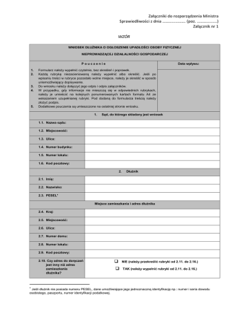 Załączniki do rozporządzenia Ministra Sprawiedliwości z dnia …………………. (poz. ……………….) Załącznik nr 1 WZÓR WNIOSEK DŁUŻNIKA O OGŁOSZENIE UPADŁOŚCI OSOBY FIZYCZNEJ NIEPROWADZĄCEJ DZIAŁALNOŚCI GOSPODARCZEJ Pouczenie 1. 2. 3. 4. 5. Data wpływu: Formularz należy wypełnić czytelnie, bez skreśleń i poprawek. Każdą rubrykę niezacieniowaną należy wypełnić albo skreślić. Jeśli po wpisaniu treści w rubryce pozostało wolne miejsce, należy je skreślić w sposób uniemożliwiający dopisywanie. Do wniosku należy dołączyć jego odpis i odpis załączników. W przypadku, gdy informacje nie mieszczą się w odpowiednich rubrykach, należy je umieścić na kolejnych ponumerowanych kartach formatu A4 ze wskazaniem uzupełnianej rubryki. Pod dodaną do formularza treścią należy złożyć podpis. Dodatkowe pouczenia są umieszczone na ostatniej stronie wniosku. 1. Sąd, do którego składany jest wniosek 1.1. Nazwa sądu: 1.2. Miejscowość: 1.3. Ulica: 1.4. Numer budynku: 1.5. Numer lokalu: 1.6. Kod pocztowy: 2. Dłużnik 2.1. Imię: 2.2. Nazwisko: 2.3. PESEL∗ Miejsce zamieszkania i adres dłużnika 2.4. Kraj: 2.5. Miejscowość: 2.6. Ulica: 2.7. Numer domu: 2.8. Numer lokalu: 2.9. Kod pocztowy: 2.10. Czy adres do doręczeń jest inny niż adres zamieszkania dłużnika? ∗ NIE (należy przekreślić rubryki od 2.11. do 2.16.) TAK (należy wypełnić rubryki od 2.11. do 2.16.) Jeśli dłużnik nie posiada numeru PESEL, dane umożliwiające jego jednoznaczną identyfikację np.: numer i seria dowodu osobistego, paszportu, numer identyfikacji podatkowej. Adres do doręczeń dłużnika 2.11. Kraj: 2.12. Miejscowość: 2.13. Ulica: 2.14. Numer domu: 2.15. Numer lokalu: 2.16. Kod pocztowy: Przedstawiciel ustawowy dłużnika 2.17. Czy dłużnik działa przez przedstawiciela ustawowego? NIE (należy przekreślić rubryki od 2.18. do 2.32.) TAK (należy wypełnić rubryki od 2.18. do 2.32.) 2.18. Imię przedstawiciela ustawowego: 2.19. Nazwisko przedstawiciela ustawowego: Miejsce zamieszkania i adres przedstawiciela ustawowego dłużnika 2.20. Kraj: 2.21. Miejscowość: 2.22. Ulica: 2.23. Numer domu: 2.24. Numer lokalu: 2.25. Kod pocztowy: 2.26. Czy adres do doręczeń jest inny niż adres zamieszkania przedstawiciela ustawowego? NIE (należy przekreślić rubryki od 2.27. do 2.32.) TAK (należy wypełnić rubryki od 2.27. do 2.32.) Adres do doręczeń przedstawiciela ustawowego dłużnika 2.27. Kraj: 2.28. Miejscowość: 2.29. Ulica: 2.30. Numer domu: 2.31. Numer lokalu: 2.32. Kod pocztowy: Pełnomocnik dłużnika 3 2.33. Czy dłużnik ma pełnomocnika? NIE (należy przekreślić rubryki od 2.34. do 2.48.) TAK (należy wypełnić rubryki od 2.34. do 2.48.) 2.34. Imię pełnomocnika: 2.35. Nazwisko pełnomocnika: Miejsce zamieszkania i adres pełnomocnika dłużnika 2.36. Kraj: 2.37. Miejscowość: 2.38. Ulica: 2.39. Numer domu: 2.40. Numer lokalu: 2.41. Kod pocztowy: 2.42. Czy adres do doręczeń jest inny niż adres zamieszkania pełnomocnika dłużnika? NIE (należy przekreślić rubryki od 2.43. do 2.48.) TAK (należy wypełnić rubryki od 2.43. do 2.48.) Adres do doręczeń pełnomocnika dłużnika 2.43. Kraj: 2.44. Miejscowość: 2.45. Ulica: 2.46. Numer domu: 2.47. Numer lokalu: 2.48. Kod pocztowy: 3. Żądanie wniosku: 3.1. Dłużnik wnosi o ogłoszenie swojej upadłości∗ 4. TAK Aktualny i zupełny wykaz majątku z szacunkową wyceną 4.1. Składniki majątku Lp. Opis składnika majątku Informacja czy na danym składniku majątku ustanowiono zabezpieczenie Data ustanowienia zabezpieczenia Szacunkowa wycena składnika majątku Miejsce, w którym znajduje się składnik majątku dłużnika 1. 2. ∗ Należy zakreślić kwadrat. 4 3. 4. 5. Środki pieniężne w gotówce Waluta Kwota Miejsce, w którym znajdują się środki pieniężne 4.2. Należności (wierzytelności dłużnika) względem banków i spółdzielczych kas oszczędnościowo kredytowych (środki na rachunkach) Lp. Nazwa banku/kasy Adres siedziby banku/kasy Waluta wierzytelności Wysokość wierzytelności Termin zapłaty 1. 2. 4.3. Należności (wierzytelności dłużnika) względem innych podmiotów Lp. Imię i nazwisko/ Nazwa podmiotu Adres zamieszkania/siedziby podmiotu Waluta wierzytelności Wysokość wierzytelności Termin zapłaty 1. 2. 5. Lp. Imię i nazwisko/nazwa wierzyciela Spis wierzycieli Adres wierzyciela Wysokość wierzytelności Termin zapłaty 1. 2. 3. 4. 5. 6. Lp. Imię i nazwisko/nazwa wierzyciela Spis wierzytelności spornych Adres wierzyciela Wysokość wierzytelności Termin zapłaty Zaznaczenie zakresu, w jakim dłużnik kwestionuje istnienie wierzytelności 1. 2. 3. 5 4. 7. 8. Lp. Opis dowodu Uzasadnienie wniosku Dowody potwierdzające okoliczności wskazane w uzasadnieniu wniosku Fakt podlegający stwierdzeniu 1. 6 2. 9. Lp. Załączniki (należy wymienić wszystkie dołączone do wniosku dokumenty) Nazwa dokumentu (załącznika) 1. 2. 10. Oświadczenie dłużnika Oświadczam, że jako dłużnik zapoznałem się z treścią art. 4914 ust. 2 i 3 ustawy z dnia 28 lutego 2003 r. - Prawo upadłościowe: „Art. 4914. 1. Sąd oddala wniosek o ogłoszenie upadłości, jeżeli dłużnik doprowadził do swojej niewypłacalności lub istotnie zwiększył jej stopień umyślnie lub wskutek rażącego niedbalstwa. 2. Sąd oddala wniosek o ogłoszenie upadłości, jeżeli w okresie dziesięciu lat przed dniem zgłoszenia wniosku: 1) w stosunku do dłużnika prowadzono postępowanie upadłościowe według przepisów tytułu niniejszego, jeżeli postępowanie to zostało umorzone z innych przyczyn niż na wniosek dłużnika, 2) ustalony dla dłużnika plan spłaty wierzycieli uchylono na podstawie przepisu art. 49120, 3) dłużnik, mając taki obowiązek, wbrew przepisom ustawy nie zgłosił w terminie wniosku o ogłoszenie upadłości, 4) czynność prawna dłużnika została prawomocnie uznana za dokonaną z pokrzywdzeniem wierzycieli - chyba że przeprowadzeni