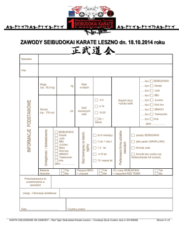 DEv:*^DEv:*Ev:* DEv:*Ev:*^DEv:* ZAWODY SEIBUDOKAI KARATE LESZNO dn. 18.10.2014 roku Nazwisko imię …..kyu / SEIBUDOKAI Waga (np.: 55,5 kg) kg Wiek w latach …..kyu / Karate …..kyu / Judo 0-3 Wzrost (np.: 178 cm) cm 4-10 Ilość stoczonych walk Stopień (kyu) +sztuka walki …..kyu / Kick box …..kyu / Taekwondo Staż treningowy (w latach) ogólny Tak Nie Paszport BIKO + znaczek do 6 miesięcy ½ do 1 roku1 1-3 lat 4-10 lat 10 i więcej lat Tak Nie …..kyu / inne jakie……………… Preferowana forma udziałów zawodach SEIBUDOKAI Karate Judo BBJ JuJutsu Boks Kick box MMA/K1 Taekwondo inne jakie……………… Badania lekarskie …..kyu / JuJutsu …..kyu / MMA/K1 10-20 20- i więcej Umiejętności / doświadczenia INFORMACJE PODSTAWOWE …..kyu / BBJ zasady SEIBUDAKAI tylko parter (GRAPLLING) formuła Judo formuła bez rzutów (via kickbox/karate full contact) GI z kanji SEIBUDOKAI + naszywka RED TIGER Tak Nie Przeciwskazania do uczestniczenia w zawodach Uwagi – informacje dodatkowe Data ………………………………… Czytelny podpis: …………………………………………………………………………………………. KARTA ZGŁOSZENIE NA ZAWODY – Red Tiger Seibudokai Karate Leszno – Fundacja Życie Cudem Jest (v.20140908) Strona 1 z 3 DEv:*^DEv:*Ev:* DEv:*Ev:*^DEv:* ZGŁOSZENIE CZYNNEGO UCZESTNICTWA W ZAWODACH SPORTOWYCH W LESZNIE W DNIU 18.10.2014 ROKU Niniejszym zgłaszam dnia ……………………………………………………………..…… swój udział w: zawodach sportowych SEIBUDOKAI w Lesznie1 w dniu 18.10.2014 od godz. 1200, i zobowiązuje się do przestrzegania etykiety DOJO, regulaminów i zarządzeń, a także pozostałych przepisów prawa, a w szczególności, zasad bezpieczeństwa, prawości, uczciwości, poszanowania drugiego człowieka, nie używania wulgaryzmów, punktualności. Nazwisko Imię Data urodzenia Adres e-mail PESEL Adres zamieszkania (ulica, kod pocztowy, miasto) Telefon Dodatkowa osoba do kontaktu (imię i nazwisko, telefon, adres e-mail) „OŚWIADCZENIE” Ja, niżej podpisany/a, niniejszym dobrowolnie składam to "Zgłoszenie czynnego udziału w zawodach sportowych i oświadczam, co następuje: Niniejszym oświadczam, że jestem świadomy/a ryzyka wynikającego z wzięcia udziału w zawodach sportowych w formach z ograniczonym i/lub pełnym kontaktem. Znam i rozumiem zasady walki, rywalizacji sportowej, prowadzenie zajęć psychoruchowych (dodatkowe informacje na stronie www.NOLIMIT.fzcj.pl/regulamin.html.), pozostałe obowiązujące regulaminy i przepisy z tym związane. W pełni i bez jakichkolwiek zastrzeżeń zwalniam organizatorów zajęć, zawodów, Fundacja „Życie Cudem Jest” z siedzibą w Piaskach [KRS 000362313], Stowarzyszenie Kultury Fizycznej „HiperAktywni.pl” [wpis do ewidencji UM Leszna nr 28], Miasto Leszno, Seibudokai Polska oraz BIKO; ich zarządy, pełnomocników, prokurentów, sędziów, instruktorów, trenerów, pracowników, przedstawicieli, członków, zawodników, autoryzowanych i zaproszonych gości od jakiejkolwiek odpowiedzialności wynikającej z zaistniałego wypadku, kontuzji lub utraty zdrowia, którego to wydarzenia mógłbym/ mogłabym być ofiarą lub powodem. W przypadku zaistnienia jednej z powyższych sytuacji, w których stałbym się/stałabym się biernym lub czynnym uczestnikiem walki sportowej, rywalizacji, ćwiczeń, jak również w razie osobistego urazu lub wypadku powstałego w wyniku umyślnego, przypadkowego, normalnego, nienormalnego zastosowania techniki w czasie walki nie będę występował/ła z żadnymi roszczeniami prawnymi i finansowymi przeciwko organizatorom zajęć, zawodów, Fundacja „Życie Cudem Jest” z siedzibą w Piaskach [KRS 000362313], Stowarzyszenie Kultury Fizycznej „HiperAktywni.pl” [wpis do ewidencji UM Leszna nr 28], Miasto Leszno, Seibudokai Polska oraz BIKO; ich zarządy, pełnomocników, prokurentów, sędziów, instruktorów, trenerów, pracowników, przedstawicieli, członków, zawodników, autoryzowanych i zaproszonych gości. Ponadto oświadczam, że mój stan zdrowia bezwarunkowo, pozwala na czynne uczestnictwo w przedmiotowych zajęciach, 1 Dodatkowe informacje na stronie http://www.budokai.org.pl i na FanPage Seibudokai Leszno https://www.facebook.com/SeiBudokaiLeszno oraz na końcu niniejszej zgłoszenie/deklaracji. KARTA ZGŁOSZENIE NA ZAWODY – Red Tiger Seibudokai Karate Leszno – Fundacja Życie Cudem Jest (v.20140908) Strona 2 z 3 DEv:*^DEv:*Ev:* DEv:*Ev:*^DEv:* zawodach i/lub po podobnych charakterze, ponadto oświadczam, że w terminie 14 dni od chwili podpisania deklaracji zobowiązuję się na „własną rękę” do potwierdzenia mojego stanu zdrowia, to jest braku przeciwwskazań do czynnego uprawianie SEIBUDOKAI, czynnego uczestnictwa w przedmiotowych zajęciach, zawodach i/lub po podobnych charakterze u lekarza rodzinnego/lekarza sportowego. Jednocześnie oświadczam, że zobowiązuję się do ubezpieczenia od następstw nieszczęśliwych wypadków we własnym zakresie. Przyjmuję do wiadomości, że wszelkie rzeczy wartościowe, a w szczególności telefony komórkowe, biżuteria, tablety, pozostawiam na czas zajęciach, zawodach i/lub po podobnych charakterze, na własną odpowiedzialność, i że nie będę w żadnym czasie rościł/ła pretensji do organizatorów zajęć, zawodów, Fundacja „Życie Cudem Jest” z siedzibą w Piaskach [KRS 000362313], Stowarzyszenie Kultury Fizycznej „HiperAktywni.pl” [wpis do ewidencji UM Leszna nr 28], Miasto Leszno, Seibudokai Polska oraz BIKO; ich zarządów, pełnomocników, prokurentów, sędziów, instruktorów, trenerów, pracowników, przedstawicieli, członków, zawodników, autoryzowanych i zaproszonych gości i zwalniam od jakiejkolwiek odpowiedzialności wynikającej z pozostawienia/ zagubienie danej rzeczy, z wyjątkiem działań przewidzianych w kodeksie karnym i innych przepisów prawa. Wyrażam ponadto zgodę, by wszelkie 