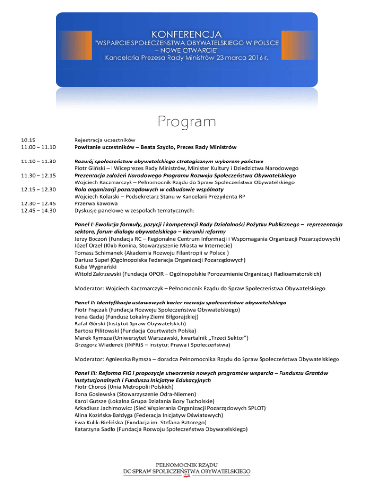 Program 10.15 11.00 – 11.10 Rejestracja uczestników Powitanie uczestników – Beata Szydło, Prezes Rady Ministrów 11.10 – 11.30 Rozwój społeczeństwa obywatelskiego strategicznym wyborem państwa Piotr Gliński – I Wiceprezes Rady Ministrów, Minister Kultury i Dziedzictwa Narodowego Prezentacja założeń Narodowego Programu Rozwoju Społeczeństwa Obywatelskiego Wojciech Kaczmarczyk – Pełnomocnik Rządu do Spraw Społeczeństwa Obywatelskiego Rola organizacji pozarządowych w odbudowie wspólnoty Wojciech Kolarski – Podsekretarz Stanu w Kancelarii Prezydenta RP Przerwa kawowa Dyskusje panelowe w zespołach tematycznych: 11.30 – 12.15 12.15 – 12.30 12.30 – 12.45 12.45 – 14.30 Panel I: Ewolucja formuły, pozycji i kompetencji Rady Działalności Pożytku Publicznego – reprezentacja sektora, forum dialogu obywatelskiego – kierunki reformy Jerzy Boczoń (Fundacja RC – Regionalne Centrum Informacji i Wspomagania Organizacji Pozarządowych) Józef Orzeł (Klub Ronina, Stowarzyszenie Miasta w Internecie) Tomasz Schimanek (Akademia Rozwoju Filantropii w Polsce ) Dariusz Supeł (Ogólnopolska Federacja Organizacji Pozarządowych) Kuba Wygnański Witold Zakrzewski (Fundacja OPOR – Ogólnopolskie Porozumienie Organizacji Radioamatorskich) Moderator: Wojciech Kaczmarczyk – Pełnomocnik Rządu do Spraw Społeczeństwa Obywatelskiego Panel II: Identyfikacja ustawowych barier rozwoju społeczeństwa obywatelskiego Piotr Frączak (Fundacja Rozwoju Społeczeństwa Obywatelskiego) Irena Gadaj (Fundusz Lokalny Ziemi Biłgorajskiej) Rafał Górski (Instytut Spraw Obywatelskich) Bartosz Pilitowski (Fundacja Courtwatch Polska) Marek Rymsza (Uniwersytet Warszawski, kwartalnik „Trzeci Sektor”) Grzegorz Wiaderek (INPRIS – Instytut Prawa i Społeczeństwa) Moderator: Agnieszka Rymsza – doradca Pełnomocnika Rządu do Spraw Społeczeństwa Obywatelskiego Panel III: Reforma FIO i propozycje utworzenia nowych programów wsparcia – Funduszu Grantów Instytucjonalnych i Funduszu Inicjatyw Edukacyjnych Piotr Choroś (Unia Metropolii Polskich) Ilona Gosiewska (Stowarzyszenie Odra-Niemen) Karol Gutsze (Lokalna Grupa Działania Bory Tucholskie) Arkadiusz Jachimowicz (Sieć Wspierania Organizacji Pozarządowych SPLOT) Alina Kozińska-Bałdyga (Federacja Inicjatyw Oświatowych) Ewa Kulik-Bielińska (Fundacja im. Stefana Batorego) Katarzyna Sadło (Fundacja Rozwoju Społeczeństwa Obywatelskiego) Moderator: Ryszard Kamiński (Forum Aktywizacji Obszarów Wiejskich) Panel IV: Promocja wolontariatu długotrwałego i solidarności międzypokoleniowej – Polski Korpus Solidarności Ks. Jan Oleszko SAC (Wspólnota Księży Pallotynów na Karczówce) Dariusz Pietrowski (Sieć Centrów Wolontariatu) Ks. Marian Subocz (Caritas Polska) Beata Tokarz-Kamińska (Towarzystwo Inicjatyw Twórczych „Ę”) Mirosława Tomasik (Forum Aktywizacji Obszarów Wiejskich) Moderator: Paweł Lewandowski – doradca Wiceprezesa Rady Ministrów Piotra Glińskiego Panel V: Edukacja obywatelska w szkole i mediach publicznych Marta Gontarska (Instytut Globalnej Odpowiedzialności) Przemysław Jaśkiewicz (Fundacja Niepodległości) Piotr Pawłowski (Stowarzyszenie Integracja) Ewa Smuk Stratenwerth (Ekologiczny Uniwersytet Ludowy) Barbara Stanisławczyk-Żyła (Polskie Radio S.A.) Jacek Strzemieczny (CEO – Centrum Edukacji Obywatelskiej) Moderator: Piotr Krygiel – doradca Pełnomocnika Rządu do Spraw Społeczeństwa Obywatelskiego 14.30 – 15.00 Podsumowanie dyskusji panelowych w zespołach tematycznych i przedstawienie planu dalszej współpracy nad przygotowaniem programu Zakończenie konferencji 15.00 Obiad