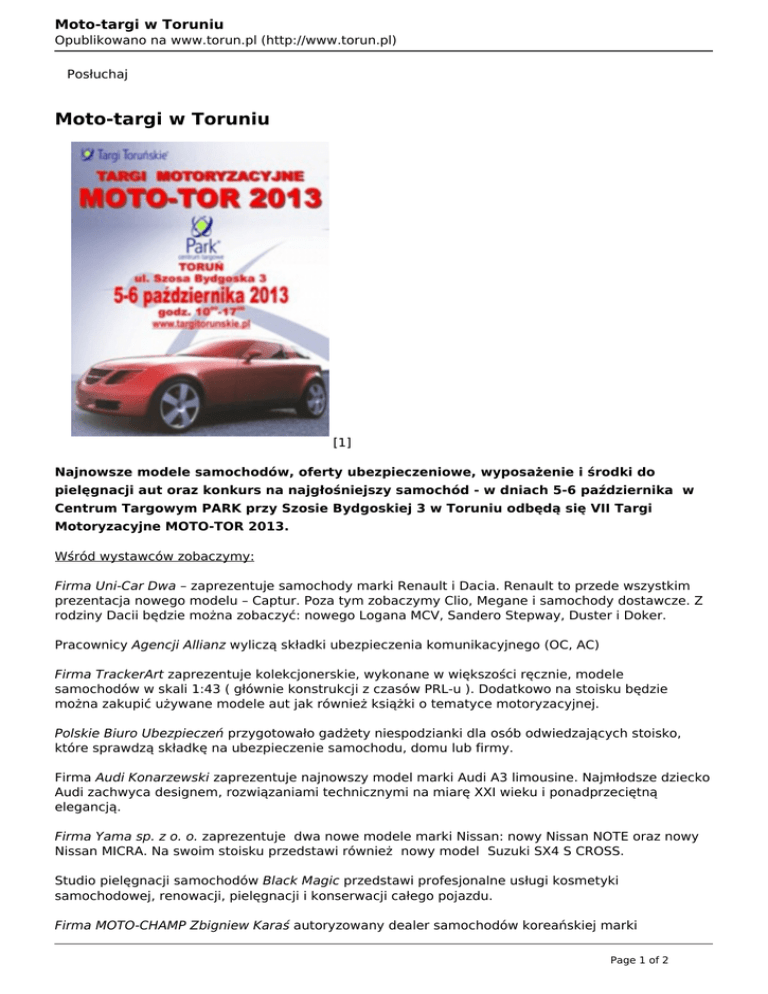 Moto-targi w Toruniu Opublikowano na www.torun.pl (http://www.torun.pl) Posłuchaj Moto-targi w Toruniu [1] Najnowsze modele samochodów, oferty ubezpieczeniowe, wyposażenie i środki do pielęgnacji aut oraz konkurs na najgłośniejszy samochód - w dniach 5-6 października w Centrum Targowym PARK przy Szosie Bydgoskiej 3 w Toruniu odbędą się VII Targi Motoryzacyjne MOTO-TOR 2013. Wśród wystawców zobaczymy: Firma Uni-Car Dwa – zaprezentuje samochody marki Renault i Dacia. Renault to przede wszystkim prezentacja nowego modelu – Captur. Poza tym zobaczymy Clio, Megane i samochody dostawcze. Z rodziny Dacii będzie można zobaczyć: nowego Logana MCV, Sandero Stepway, Duster i Doker. Pracownicy Agencji Allianz wyliczą składki ubezpieczenia komunikacyjnego (OC, AC) Firma TrackerArt zaprezentuje kolekcjonerskie, wykonane w większości ręcznie, modele samochodów w skali 1:43 ( głównie konstrukcji z czasów PRL-u ). Dodatkowo na stoisku będzie można zakupić używane modele aut jak również książki o tematyce motoryzacyjnej. Polskie Biuro Ubezpieczeń przygotowało gadżety niespodzianki dla osób odwiedzających stoisko, które sprawdzą składkę na ubezpieczenie samochodu, domu lub firmy. Firma Audi Konarzewski zaprezentuje najnowszy model marki Audi A3 limousine. Najmłodsze dziecko Audi zachwyca designem, rozwiązaniami technicznymi na miarę XXI wieku i ponadprzeciętną elegancją. Firma Yama sp. z o. o. zaprezentuje dwa nowe modele marki Nissan: nowy Nissan NOTE oraz nowy Nissan MICRA. Na swoim stoisku przedstawi również nowy model Suzuki SX4 S CROSS. Studio pielęgnacji samochodów Black Magic przedstawi profesjonalne usługi kosmetyki samochodowej, renowacji, pielęgnacji i konserwacji całego pojazdu. Firma MOTO-CHAMP Zbigniew Karaś autoryzowany dealer samochodów koreańskiej marki Page 1 of 2 Moto-targi w Toruniu Opublikowano na www.torun.pl (http://www.torun.pl) SsangYong zaprezentuje modele: Korando, Rexton, Actyon Sports i Rodius. W regionie kujawsko-pomorskim pojawiła się nowa marka pojazdu AIXAM z Francji, którą na targach zaprezentuje Moto-Champ Zbigniew Karaś. Aixam to ekologiczne pojazdy typu quadrocykl z małolitrażowymi silnikami, którymi mogą jeździć od niedawna 14-latkowie. Na stoisku CUK UBEZPIECZENIA będzie można bezpłatnie i szybko porównać ponad 20 towarzystw ubezpieczeniowych w zakresie OC i AC. Doradca pomoże w wyborze najlepszej polisy i odpowie na wszelkie pytania na temat interesującego ubezpieczenia. Firma Z&Z AUTO ZŁOMAŃCZUK zaprezentuje nowe modele samochodów marki ŠKODA Octavia oraz Superb 4x4 oraz nowe modele marki Ford: Fiesta, Focus i Kuga. Firma HURTOZBYT przy stoisku technicznym udzielać będzie porad w zakresie eksploatacji akumulatorów, będzie również możliwość sprawdzenia stanu i określenie przewidywanej żywotności akumulatorów. Zaprezentowane również zostaną akumulatory do samochodów zabytkowych. Firma Autopol Noskiewicz dealer KIA zaprezentuje nowe modele samochodów Carens oraz pro_cee`d. Pozostałe samochody to Sportage, cee`d HB, RIO HB. Wszystkie te modele samochodów są po face liftingu. Atrakcją stosika firmy Toyota Bednarscy będzie najnowszy model Toyoty Rav4, nowe wcielenie ledendy motoryzacji - Nowa Toyota Corolla, lider segmentu miejskich kompaktów Nowy Auris oraz hybrydowe odmiany Nowego Aurisa TS Kombi oraz Yarisa Firma Mazda Bednarscy zaprezentuje Nową Mazdę 6 z przełomową technologią SKYACTIV, niezrównanego crosovera Mazdę CX-5 oraz kultową Mazdę MX-5 - najpopularniejszego roadstera świata. Dodatkowo będzie można zobaczyć Mazdę 3 w wersji MPS z 260 konnym silnikiem Podczas Targów MOTO-TOR Firma GND CAR AUDIO zorganizuje zawody z ramienia organizacji dB Drag Racing. Będą to FINAŁY POLSKI 2013. dB Drag racing Associations jest prestiżową organizacją międzynarodową organizującą zawody car audio w 29 krajach na świecie. Wśród konkurencji: dB Drag racing - konkurs na najgłosniejsze auto zlotu. Wyłonimy mistrza Polski 2013. Bass Race - konkurs zwany "wyścigiem basów" dB Tuning Cup - połączenie strefy tuningowej z car audio. Samochody i wszystko, co się z nimi wiąże, będzie można oglądać w godz. 10.00 – 17.00. Data publikacji: 2013-10-04 Odnośniki: [1] http://www.torun.pl/sites/default/files/targi_moto_m_0.jpg Page 2 of 2 Powered by TCPDF (www.tcpdf.org)