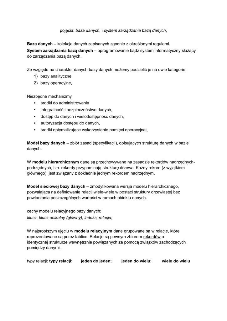 pojęcia: baza danych, i system zarządzania bazą danych, Baza danych – kolekcja danych zapisanych zgodnie z określonymi regułami. System zarządzania bazą danych – oprogramowanie bądź system informatyczny służący do zarządzania bazą danych. Ze względu na charakter danych bazy danych możemy podzielić je na dwie kategorie: 1) bazy analityczne 2) bazy operacyjne, Niezbędne mechanizmy środki do administrowania integralność i bezpieczeństwo danych, dostęp do danych i wielodostępność danych, autoryzacja dostępu do danych, środki optymalizujące wykorzystanie pamięci operacyjnej, Model bazy danych – zbiór zasad (specyfikacji), opisujących strukturę danych w bazie danych. W modelu hierarchicznym dane są przechowywane na zasadzie rekordów nadrzędnychpodrzędnych, tzn. rekordy przypominają strukturę drzewa. Każdy rekord (z wyjątkiem głównego) jest związany z dokładnie jednym rekordem nadrzędnym. Model sieciowej bazy danych – zmodyfikowana wersja modelu hierarchicznego, pozwalająca na definiowanie relacji wiele-wiele w postaci struktury drzewiastej bez powtarzania poszczególnych wartości w ramach obiektu danych. cechy modelu relacyjnego bazy danych; klucz, klucz unikalny (główny), indeks, relacja; W najprostszym ujęciu w modelu relacyjnym dane grupowane są w relacje, które reprezentowane są przez tablice. Relacje są pewnym zbiorem rekordów o identycznej strukturze wewnętrznie powiązanych za pomocą związków zachodzących pomiędzy danymi. typy relacji: typy relacji: jeden do jeden; jeden do wielu; wiele do wielu ogólnie etapy przygotowania bazy danych, m.in. zasady planowania pól i tworzenia tabel rola klucza, w tym klucza unikalnego i indeksu w relacyjnych bazach danych Wszystkie atrybuty niekluczowe są w zależności funkcyjnej od klucza. Klucz - klucz kandydujący (prosty i złożony), klucz unikalny (główny), klucz obcy Redundancja – nadmiarowośd danych: * Imię Nazwisko Antoni Anonim Stanowisko Stawka za godzinę Młotkowy 10 zł Natalia Niewiadomska Sekretarz 20 zł Izabela Iksioska Sekretarz 20 zł Adam Abacki Młotkowy 10 zł Barbara Babacka Księgowa 20 zł Zenon Zetowy Prezes 50 zł Józef Kopytko Młotkowy 10 zł Kazimierz Anonim Sekretarz 20 zł Nie ma nadmiarowości: Tabela "Pracownicy" Imię Nazwisko Stanowisko Antoni Anonim Młotkowy Natalia Niewiadomska Sekretarz Izabela Iksioska Sekretarz Adam Abacki Młotkowy Barbara Babacka Księgowa Zenon Zetowy Prezes Józef Kopytko Młotkowy Kazimierz Anonim Sekretarz Tabela "Stawki godzinowe" po normalizacji Stanowisko Stawka za godzinę Młotkowy 10 zł Sekretarz 20 zł Księgowa 20 zł Prezes 50 zł Wszystkie pola niebędące polami klucza głównego są od niego zależne bezpośrednio.