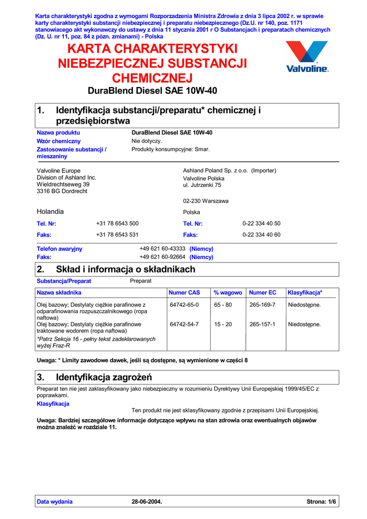 Karta charakterystyki zgodna z wymogami Rozporzadzenia Ministra Zdrowia z dnia 3 lipca 2002 r. w sprawie karty charakterystyki substancji niebezpiecznej i preparatu niebezpiecznego (Dz.U. nr 140, poz. 1171 stanowiacego akt wykonawczy do ustawy z dnia 11 stycznia 2001 r O Substancjach i preparatach chemicznych (Dz. U. nr 11, poz. 84 z pózn. zmianami) - Polska KARTA CHARAKTERYSTYKI NIEBEZPIECZNEJ SUBSTANCJI CHEMICZNEJ DuraBlend Diesel SAE 10W-40 1. Identyfikacja substancji/preparatu* chemicznej i przedsiębiorstwa Nazwa produktu Wzór chemiczny Zastosowanie substancji / mieszaniny DuraBlend Diesel SAE 10W-40 Nie dotyczy. Produkty konsumpcyjne: Smar. Ashland Poland Sp. z o.o. (Importer) Valvoline Polska ul. Jutrzenki 75 Valvoline Europe Division of Ashland Inc. Wieldrechtseweg 39 3316 BG Dordrecht 02-230 Warszawa Holandia Polska Tel. Nr: +31 78 6543 500 Tel. Nr: 0-22 334 40 50 Faks: +31 78 6543 531 Faks: 0-22 334 40 60 Telefon awaryjny Faks: 2. +49 621 60-43333 (Niemcy) +49 621 60-92664 (Niemcy) Skł ad i informacja o skł adnikach Substancja/Preparat Preparat Nazwa skł adnika Numer CAS % wagowo Numer EC Klasyfikacja* Olej bazowy; Destylaty cięż kie parafinowe z odparafinowania rozpuszczalnikowego (ropa naftowa) Olej bazowy; Destylaty cięż kie parafinowe traktowane wodorem (ropa naftowa) *Patrz Sekcja 16 - peł ny tekst zadeklarowanych wyż ej Fraz-R 64742-65-0 65 - 80 265-169-7 Niedostępne. 64742-54-7 15 - 20 265-157-1 Niedostępne. Uwaga: * Limity zawodowe dawek, jeśli sądostępne, sąwymienione w części 8 3. Identyfikacja zagroż eń Preparat ten nie jest zaklasyfikowany jako niebezpieczny w rozumieniu Dyrektywy Unii Europejskiej 1999/45/EC z poprawkami. Klasyfikacja Ten produkt nie jest sklasyfikowany zgodnie z przepisami Unii Europejskiej. Uwaga: Bardziej szczegół owe informacje dotyczące wpł ywu na stan zdrowia oraz ewentualnych objawów moż na znaleź ćw rozdziale 11. Data wydania 28-06-2004. Strona: 1/6 DuraBlend Diesel SAE 10W-40 4. Pierwsza pomoc Pierwsza pomoc Wdychanie Jeż eli wdychano substancję, wyjś ćna ś wież e powietrze. Jeś li oddychanie sprawia trudnoś ci, należ y podaćtlen. Jeż eli osoba nie oddycha, należ y zastosować sztuczne oddychanie. Zasięgnąćporady medycznej. NIE wywoł ywaćwymiotów, jeś li nie jest to zalecane przez personel medyczny. Spoż ycie Nigdy nie podawaćniczego doustnie osobie nieprzytomnej. W razie poł knięcia duż ych iloś ci tego materiał u, niezwł ocznie wezwaćlekarza. Umyćmydł em i wodą. W przypadku nasilenia podraż nenia, należ y skorzystaćz Kontakt ze skórą pomocy lekarskiej. Usunąćszkł a kontaktowe jeż eli są. W przypadku kontaktu, niezwł ocznie Kontakt z okiem przemywaćoczy duż ąiloś ciąwody, przez co najmniej 15 minut. Zasięgnąć porady medycznej. Uwaga: Bardziej szczegół owe informacje dotyczące wpł ywu na stan zdrowia oraz ewentualnych objawów moż na znaleź ćw rozdziale 11. 5. Postępowanie w przypadku poż aru Środki gaśnicze MAŁY POŻAR: Uż yćproszku gaś niczego lub CO2. DUŻY POŻAR: Uż ywaćzraszania wodą, mgł y lub piany. Nie uż ywaćstrumienia wody. Szczególne ryzyko naraż enia Bez szczególnego niebezpieczeństwa. Niebezpieczne produkty rozkł adu termicznego Ochrona straż aków Produkty te, to tlenki węgla (CO, CO2) i woda. Straż acy powinni nosićaparaty oddechowe izolacyjne (SCBA) i funkcjonalną odzież(peł nąodzieżochronną). Specjalne wyposaż enie ochronne Nie dotyczy. dla straż aków 6. Postępowanie w przypadku niezamierzonego uwolnienia do środowiska Osobiste środki ostroż ności Okulary chroniące przed rozpryskiem. Peł ny ubiór ochronny. Buty (wysokie). Rękawice. Należ y unikaćrozprzestrzeniania sięrozlanego materiał u jego spł ywania do gleby Zabezpieczenia środowiskowe lub kontaktu z glebą, ciekami wodnymi, drenami i kanalizacją. Jeż eli personel ratunkowy jest niedostępny, należ y zebraćrozlany materiał . W Metody usuwania przypadku niewielkiego rozlania, należ y dodaćsubstancjęabsorbującą(przy braku odpowiedniej substancji moż na uż yćpiasku), zebraćmateriał i umieś cićw szczelnym pojemniku, przeznaczonym do usunięcia. Jeż eli rozlana substancja zajmuje duż y obszar, należ y zabezpieczyćgo wał em ochronnym, aby zapobiec przedostawaniu sięrozlanej substancji do zbiorników wodnych i wód. Umieś cić rozlany materiał w pojemniku nadającym siędo likwidacji. Uwaga: Patrz Sekcja 8 - osobiste wyposaż enie ochronne, oraz Sekcja 13 - usuwanie odpadków. 7. Postępowanie z substancją/preparatem* i jej/jego* magazynowanie Posł ugiwanie się Przechowywanie Przechowywaćz dala od ź ródeł ciepł a. Opróż nione pojemniki groż ąpoż arem, usunąćpozostał oś ci pod okapem wyciągowym. Uziemićcał e wyposaż enie zawierające ten materiał . Nie wdychaćgazu, dymów, pary/par lub mgł y. W przypadku spoż ycia, należ y natychmiast zwrócićsiępo pomoc medycznąi pokazaćpojemnik lub etykietę. Przechowywaćpojemnik szczelnie zamknięty. Pojemnik należ y przechowywaćw chł odnym, dobrze wietrzonym miejscu. Materiałopakowaniowy Zaleca się Data wydania Stosowaćoryginalny pojemnik. 28-06-2004. Strona: 2/6 DuraBlend Diesel SAE 10W-40 8. Kontrola naraż enia i środki ochrony indywidualnej Nazwa skł adnika Olej bazowy; Destylaty cięż kie parafinowe z odparafinowania rozpuszczalnikowego (ropa naftowa) Olej bazowy; Destylaty cięż kie parafinowe traktowane wodorem (ropa naftowa) Kontrole ekspozycji Środki inż ynierskie Środki zachowania higieny Ochrona dróg oddechowych Ochrona rąk Ochrona oczu Ochrona skóry 9. Limity ekspozycji zawodowej STEL: 10 mg/m 3 15 minut (minuty). Postać : Mgł a TWA: 5 mg/m3 8 godzin. Postać : Mgł a STEL: 10 mg/m 3 15 minut (minuty). Postać : Mgł a TWA: 5 mg/m3 8 godzin. Postać : Mgł a Zapewnićwentylacjęwyciągowąlub innątechnikękontroli, aby utrzymaćstęż enie par w powietrzu poniż ej ich granicznych wartoś ci. Upewnićsię, ż e miejsce do 