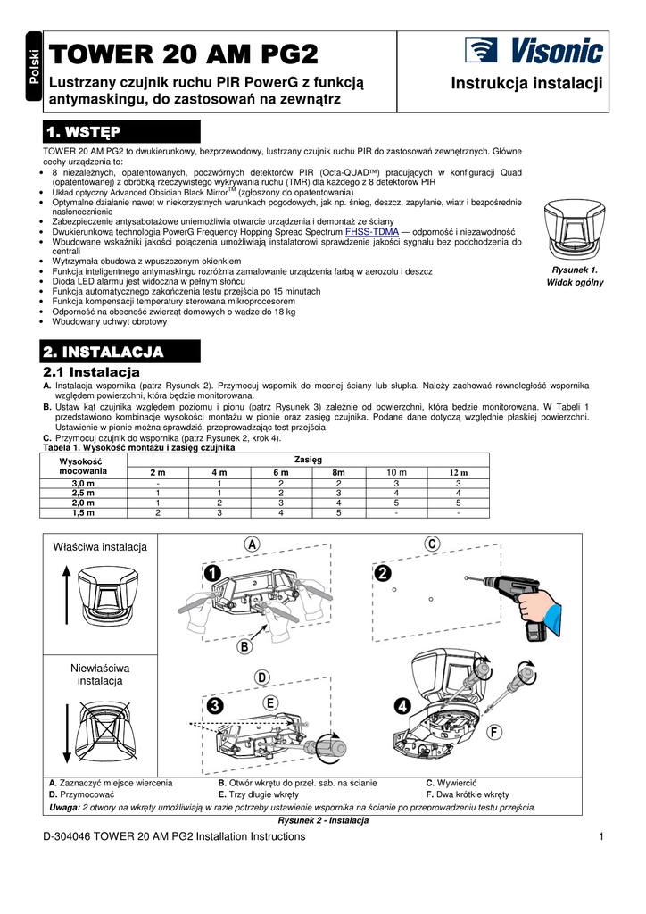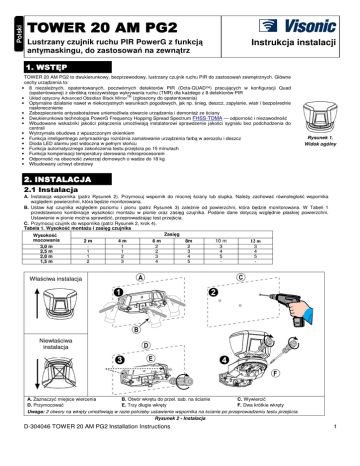 Polski TOWER 20 AM PG2 Lustrzany czujnik ruchu PIR PowerG z funkcją antymaskingu, do zastosowań na zewnątrz Instrukcja instalacji 1. WSTĘP TOWER 20 AM PG2 to dwukierunkowy, bezprzewodowy, lustrzany czujnik ruchu PIR do zastosowań zewnętrznych. Główne cechy urządzenia to: • 8 niezależnych, opatentowanych, poczwórnych detektorów PIR (Octa-QUAD) pracujących w konfiguracji Quad (opatentowanej) z obróbką rzeczywistego wykrywania ruchu (TMR) dla każdego z 8 detektorów PIR • Układ optyczny Advanced Obsidian Black MirrorTM (zgłoszony do opatentowania) • Optymalne działanie nawet w niekorzystnych warunkach pogodowych, jak np. śnieg, deszcz, zapylanie, wiatr i bezpośrednie nasłonecznienie • Zabezpieczenie antysabotażowe uniemożliwia otwarcie urządzenia i demontaż ze ściany • Dwukierunkowa technologia PowerG Frequency Hopping Spread Spectrum FHSS-TDMA — odporność i niezawodność • Wbudowane wskaźniki jakości połączenia umożliwiają instalatorowi sprawdzenie jakości sygnału bez podchodzenia do centrali • Wytrzymała obudowa z wpuszczonym okienkiem • Funkcja inteligentnego antymaskingu rozróżnia zamalowanie urządzenia farbą w aerozolu i deszcz • Dioda LED alarmu jest widoczna w pełnym słońcu • Funkcja automatycznego zakończenia testu przejścia po 15 minutach • Funkcja kompensacji temperatury sterowana mikroprocesorem • Odporność na obecność zwierząt domowych o wadze do 18 kg • Wbudowany uchwyt obrotowy Rysunek 1. Widok ogólny 2. INSTALACJA 2.1 Instalacja A. Instalacja wspornika (patrz Rysunek 2). Przymocuj wspornik do mocnej ściany lub słupka. Należy zachować równoległość wspornika względem powierzchni, która będzie monitorowana. B. Ustaw kąt czujnika względem poziomu i pionu (patrz Rysunek 3) zależnie od powierzchni, która będzie monitorowana. W Tabeli 1 przedstawiono kombinacje wysokości montażu w pionie oraz zasięg czujnika. Podane dane dotyczą względnie płaskiej powierzchni. Ustawienie w pionie można sprawdzić, przeprowadzając test przejścia. C. Przymocuj czujnik do wspornika (patrz Rysunek 2, krok 4). Tabela 1. Wysokość montażu i zasięg czujnika Zasięg Wysokość mocowania 2m 4m 6m 8m 10 m 12 m 3,0 m 1 2 2 3 3 2,5 m 1 1 2 3 4 4 2,0 m 1 2 3 4 5 5 1,5 m 2 3 4 5 - Właściwa instalacja Niewłaściwa instalacja A. Zaznaczyć miejsce wiercenia B. Otwór wkrętu do przeł. sab. na ścianie C. Wywiercić D. Przymocować E. Trzy długie wkręty F. Dwa krótkie wkręty Uwaga: 2 otwory na wkręty umożliwiają w razie potrzeby ustawienie wspornika na ścianie po przeprowadzeniu testu przejścia. Rysunek 2 - Instalacja D-304046 TOWER 20 AM PG2 Installation Instructions 1 REGULACJA W POZIOMIE (od -45°° do +45°°) REGULACJA W PIONIE (od 0°° do -10°° z przeskokiem co 2,5°°) ZAMKNIĘCIE POKRYWY 1. Zwolnić blokadę 6. Zablokować 2. Ustawić 7. Obrócić obudowę i nacisnąć suwak 3. Zablokować 8 i 9. Założyć z powrotem pokrywę 4. Zwolnić blokadę 10. Zamocować wkrętami 5. Ustawić A. Stopniowa regulacja kąta względem pionu 2 D-304046 TOWER 20 AM PG2 Installation Instructions Rysunek 3. Ustawienie i zamknięcie obudowy 2.2 Zakładanie baterii Zaleca się wykonanie pierwszego włożenia baterii na płaskiej powierzchni (patrz Rysunek 4). Po włożeniu baterii dioda LED będzie migać przez 60 sekund, a następnie czujnik przełączy się w trwający 15 minut lokalny tryb diagnostyczny. A. Przełącznik sabotażowy B. Nacisnąć mocno, aby zwolnić wspornik C. 3 wkręty Rysunek 4. Zakładanie baterii 2.3. Zapis W celu zapisania czujnika w centrali, należy postępować wg procedury opisanej w instrukcji instalacji centrali PowerMaster, w części 02: URZADZ./LINIE. Ogólny opis procedury znajduje się również poniżej: Krok 1 Krok 2 Wejdź do trybu instalatora i wybierz 02: URZADZ./LINIE Wybierz opcję DODAJ URZADZ. Patrz Uwaga [1] 02:URZADZ./LINIE DODAJ URZADZ. Krok 3 Krok 4 Zapisz urządzenie wysyłając Wybierz pożądany nr linii sygnał lub podaj jego nr ID WYSLIJ SYGNAL lub L14:CZUJNIK RUCHU ID No. 130-XXXX WPROW. ID:XXX-XXXX Krok 5 Skonfiguruj parametry położenia, typu linii i dźwięku L14.LOKALIZACJA L14.TYP LINII L14.DZWIEK ZMIEN PARAM. URZADZ. Krok 6 Krok 7 Wybierz partycje. Patrz uwaga 2 poniżej. L14:PARTYCJE Krok 8 Przypisz partycję do czujnika wciskając przyciski , lub na klawiaturze centrali oznacza przesunięcie L14:P1 P2 P3 Skonfiguruj ustawienia L14: USTAWIENIA i wciśnięcie Uwagi: [1] Jeżeli czujnik jest już zapisany, możesz zmienić jego parametry poprzez menu ZMIEN PARAM URZADZ. – patrz krok 2. [2] Opcja PARTYCJE pojawi się tylko, jeżeli w panelu została wcześniej uaktywniona funkcja partycjonowania (patrz rozdział PARTYCJE w instrukcji instalacji central PowerMaster). D-304046 TOWER 20 AM PG2 Installation Instructions 3 2.4. Konfiguracja parametrów czujnika Wybierz opcję USTAWIENIA i postępuj zgodnie z opisem z tabeli poniżej: Opcja DIODA LED Instrukcja konfiguracji Umożliwia włączenie lub wyłączenie wskazania diody LED alarmu. Ustawienia opcjonalne: WŁ. (domyślnie) i WYŁ. • • CZUŁOŚĆ PIR Umożliwia wybór czułości PIR — standardowej (wyższa odporność na fałszywe alarmy) lub wysokiej. Dodatkowa opcja JEDNA STREFA umożliwia wywołanie alarmu po przekroczeniu jednej strefy (kurtyny) czujnika Ustawienia opcjonalne: CZULOSC NISKA (domyślnie), CZULOSC WYSOKA, JEDNA STREFA • • OPERACJA ROZBR. Umożliwia włączenie lub wyłączenie czasu aktywności w trybie rozbrojenia. Ustawienia opcjonalne: NIE AKTYWNY (domyślnie), TAK – brak opóźnienia, TAK + 5 s opóźnienia, TAK + 15 s opóźnienia, TAK + 30 s opóźnienia, TAK + 1 m opóźnienia, TAK + 2 m opóźnienia, TAK + 5 m opóźnienia, TAK + 10 m opóźnienia, TAK + 20 m opóźnienia i TAK + 60 m opóźnienia. • • ANTYMASKING Umożliwia włączenie lub wyłączenie funkcji antymaskingu. Ustawienia opcjonalne: Wyłączona (domyślnie) i Włączona. • • GODZ