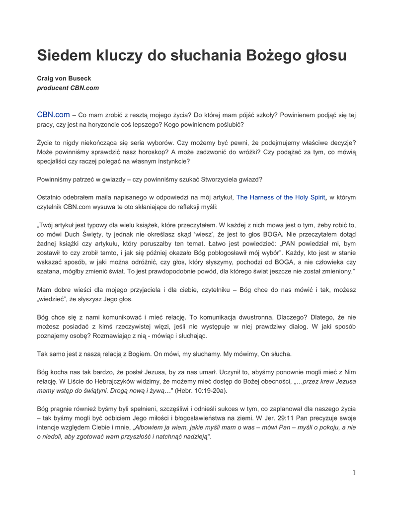 Siedem kluczy do słuchania Bożego głosu Craig von Buseck producent CBN.com CBN.com – Co mam zrobić z resztą mojego życia? Do której mam pójść szkoły? Powinienem podjąć się tej pracy, czy jest na horyzoncie coś lepszego? Kogo powinienem poślubić? Życie to nigdy niekończąca się seria wyborów. Czy możemy być pewni, że podejmujemy właściwe decyzje? Może powinniśmy sprawdzić nasz horoskop? A może zadzwonić do wróżki? Czy podążać za tym, co mówią specjaliści czy raczej polegać na własnym instynkcie? Powinniśmy patrzeć w gwiazdy – czy powinniśmy szukać Stworzyciela gwiazd? Ostatnio odebrałem maila napisanego w odpowiedzi na mój artykuł, The Harness of the Holy Spirit, w którym czytelnik CBN.com wysuwa te oto skłaniające do refleksji myśli: „Twój artykuł jest typowy dla wielu książek, które przeczytałem. W każdej z nich mowa jest o tym, żeby robić to, co mówi Duch Święty, ty jednak nie określasz skąd ‘wiesz’, że jest to głos BOGA. Nie przeczytałem dotąd żadnej książki czy artykułu, który poruszałby ten temat. Łatwo jest powiedzieć: „PAN powiedział mi, bym zostawił to czy zrobił tamto, i jak się później okazało Bóg pobłogosławił mój wybór”. Każdy, kto jest w stanie wskazać sposób, w jaki można odróżnić, czy głos, który słyszymy, pochodzi od BOGA, a nie człowieka czy szatana, mógłby zmienić świat. To jest prawdopodobnie powód, dla którego świat jeszcze nie został zmieniony.” Mam dobre wieści dla mojego przyjaciela i dla ciebie, czytelniku – Bóg chce do nas mówić i tak, możesz „wiedzieć”, że słyszysz Jego głos. Bóg chce się z nami komunikować i mieć relację. To komunikacja dwustronna. Dlaczego? Dlatego, że nie możesz posiadać z kimś rzeczywistej więzi, jeśli nie występuje w niej prawdziwy dialog. W jaki sposób poznajemy osobę? Rozmawiając z nią - mówiąc i słuchając. Tak samo jest z naszą relacją z Bogiem. On mówi, my słuchamy. My mówimy, On słucha. Bóg kocha nas tak bardzo, że posłał Jezusa, by za nas umarł. Uczynił to, abyśmy ponownie mogli mieć z Nim relację. W Liście do Hebrajczyków widzimy, że możemy mieć dostęp do Bożej obecności, „…przez krew Jezusa mamy wstęp do świątyni. Drogą nową i żywą…" (Hebr. 10:19-20a). Bóg pragnie również byśmy byli spełnieni, szczęśliwi i odnieśli sukces w tym, co zaplanował dla naszego życia – tak byśmy mogli być odbiciem Jego miłości i błogosławieństwa na ziemi. W Jer. 29:11 Pan precyzuje swoje intencje względem Ciebie i mnie, „Albowiem ja wiem, jakie myśli mam o was – mówi Pan – myśli o pokoju, a nie o niedoli, aby zgotować wam przyszłość i natchnąć nadzieją". 1 Widzimy w 1Mojż. 3:8a, że „[pierwsi ludzie]...usłyszeli szelest Pana przechadzającego się po ogrodzie w powiewie dziennym..." Taką samą więź pragnie dziś mieć z nami Bóg, To jest Bożym pragnieniem, by chodzić i rozmawiać ze swoimi dziećmi. On chce mówić do nas. A od nas oczekuje również słuchania i mówienia do Niego. Jest więcej tej dobrej nowiny – możemy słyszeć Jego głos. Biblia, Boży list miłosny do ludzkości, precyzuje to, mówiąc że zostaliśmy stworzeni do dwustronnej komunikacji z Bogiem. Jezus powiedział: „Owce moje głosu mojego słuchają i znam je, a one idą za mną" (Jn 10:27). Podczas studiów, odbywałem praktykę w lokalnej stacji telewizyjnej przy nagrywaniu materiałów wideo. Pewnego dnia jechałem z producentem i pewną młodą kobietą pracującą w dziele charytatywnym na zdjęcia. W drodze opowiedziała nam, że pod namową ojca, kupiła ostatnio dwupoziomowe mieszkanie. Czując się wciąż niekomfortowo z tym wielkim zobowiązaniem, jakiego się właśnie podjęła, wypowiedziała głośno myśl, „Skąd mogłabym wiedzieć, że podejmuję właściwą decyzję?” Oto pytanie nurtujące nas od wieków, prawda? Ale jako dzieci Boże nie musimy chodzić na oślep. Możemy mieć pewność, że będziemy słyszeć Jego głos. Apostoł Paweł pisze w Rzym. 8:14, „Bo ci, których Duch Boży prowadzi, są dziećmi Bożymi." I odwrotnie, Pismo wspomina również, że jeśli jesteśmy dziećmi Bożymi, jeśli narodziliśmy się na nowo, będziemy prowadzeni przez Jego Ducha. Takie zapewnienie mamy również w Ps. 37:23 i 24, „Pan kieruje krokami męża (sprawiedliwego, nowonarodzonego). Wspiera tego, którego droga mu się podoba. Choćby się potknął, nie przewróci się, gdyż Pan podtrzyma go ręką swoja.” Bóg pokieruje naszymi krokami i nawet jeśli coś zepsujemy, gdy będziemy szczerze próbować pełnić Jego wolę, On nas podniesie i da nam drugą szansę. Najtrudniejszą częścią słuchania Bożego głosu jest fakt, że nauczenie się rozróżniania Bożego głosu wymaga czasu – i pokornego serca. W Jer. 29:12-13 czytamy: „Gdy będziecie mnie wzywać i zanosić do mnie modły, wysłucham was. A gdy mnie będziecie szukać, znajdziecie mnie, gdy mnie będziecie szukać całym swoim sercem." Nie możemy niczego żądać od Wszechmocnego Boga. Nie możemy grozić niebu pięścią mówiąc, „no dobra, Boże, wypowiedz się!”. Możemy jednak poprosić, szukać i pukać do drzwi, a Biblia obiecuje, że Bóg je otworzy. Bóg objawi siebie tym, którzy szczerze Go szukają. Autor Przypowieści mówi o tym, że nasze myśli i intencje nabierają tego samego kierunku co wola Boża, kiedy w pełni się Jemu poddamy. „Powierz Panu swoje sprawy [poddaj i powierz je Jemu całkowicie; On sprawi, że staną się zgodne z Jego wolą] a wtedy ziszczą się twoje zamysły.” (Przyp. Sal. 16:3). Bóg pokazuje nam siebie, kiedy szczerze Go szukamy. Podobny fragment w Przyp. Sal. 3 sprawia, że staje się to jeszcze bardziej jasne. „Zaufaj Panu z całego swojego serca i nie polegaj na własnym rozumie! Pamiętaj o Nim na wszystkich swoich drogach, a On prostować będzie twoje ścieżki." (Przyp. Sal. 3:5-6).