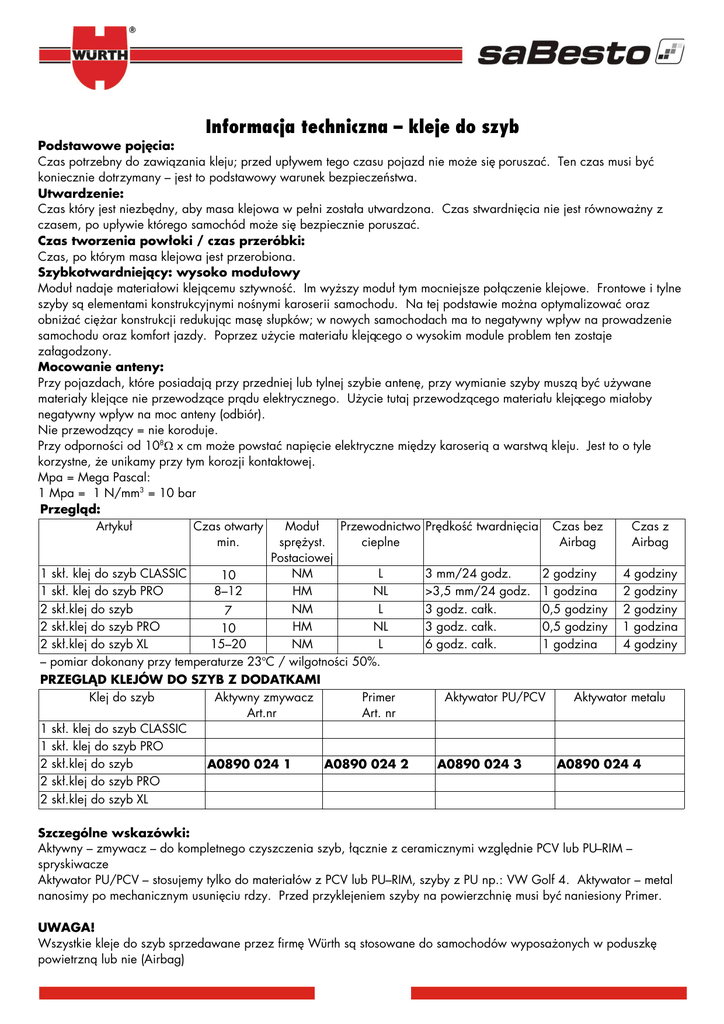 Informacja techniczna – kleje do szyb Podstawowe pojęcia: Czas potrzebny do zawiązania kleju; przed upływem tego czasu pojazd nie może się poruszać. Ten czas musi być koniecznie dotrzymany – jest to podstawowy warunek bezpieczeństwa. Utwardzenie: Czas który jest niezbędny, aby masa klejowa w pełni została utwardzona. Czas stwardnięcia nie jest równoważny z czasem, po upływie którego samochód może się bezpiecznie poruszać. Czas tworzenia powłoki / czas przeróbki: Czas, po którym masa klejowa jest przerobiona. Szybkotwardniejący: wysoko modułowy Moduł nadaje materiałowi klejącemu sztywność. Im wyższy moduł tym mocniejsze połączenie klejowe. Frontowe i tylne szyby są elementami konstrukcyjnymi nośnymi karoserii samochodu. Na tej podstawie można optymalizować oraz obniżać ciężar konstrukcji redukując masę słupków; w nowych samochodach ma to negatywny wpływ na prowadzenie samochodu oraz komfort jazdy. Poprzez użycie materiału klejącego o wysokim module problem ten zostaje załagodzony. Mocowanie anteny: Przy pojazdach, które posiadają przy przedniej lub tylnej szybie antenę, przy wymianie szyby muszą być używane materiały klejące nie przewodzące prądu elektrycznego. Użycie tutaj przewodzącego materiału klejącego miałoby negatywny wpływ na moc anteny (odbiór). Nie przewodzący = nie koroduje. Przy odporności od 108 x cm może powstać napięcie elektryczne między karoserią a warstwą kleju. Jest to o tyle korzystne, że unikamy przy tym korozji kontaktowej. Mpa = Mega Pascal: 1 Mpa = 1 N/mm3 = 10 bar Przegląd: Artykuł Czas otwarty Moduł Przewodnictwo Prędkość twardnięcia Czas bez Czas z min. sprężyst. cieplne Airbag Airbag Postaciowej 1 skł. klej do szyb CLASSIC NM L 3 mm/24 godz. 2 godziny 4 godziny 10 1 skł. klej do szyb PRO 8–12 HM NL >3,5 mm/24 godz. 1 godzina 2 godziny 2 skł.klej do szyb NM L 3 godz. całk. 0,5 godziny 2 godziny 7 2 skł.klej do szyb PRO HM NL 3 godz. całk. 0,5 godziny 1 godzina 10 2 skł.klej do szyb XL 15–20 NM L 6 godz. całk. 1 godzina 4 godziny o – pomiar dokonany przy temperaturze 23 C / wilgotności 50%. PRZEGLĄD KLEJÓW DO SZYB Z DODATKAMI Klej do szyb Aktywny zmywacz Primer Aktywator PU/PCV Aktywator metalu Art.nr Art. nr 1 skł. klej do szyb CLASSIC 1 skł. klej do szyb PRO 2 skł.klej do szyb A0890 024 1 A0890 024 2 A0890 024 3 A0890 024 4 2 skł.klej do szyb PRO 2 skł.klej do szyb XL Szczególne wskazówki: Aktywny – zmywacz – do kompletnego czyszczenia szyb, łącznie z ceramicznymi względnie PCV lub PU–RIM – spryskiwacze Aktywator PU/PCV – stosujemy tylko do materiałów z PCV lub PU–RIM, szyby z PU np.: VW Golf 4. Aktywator – metal nanosimy po mechanicznym usunięciu rdzy. Przed przyklejeniem szyby na powierzchnię musi być naniesiony Primer. UWAGA! Wszystkie kleje do szyb sprzedawane przez firmę Würth są stosowane do samochodów wyposażonych w poduszkę powietrzną lub nie (Airbag) NASTĘPUJĄCE TYPY AUT WYMAGAJĄ WYSOKOMODUŁOWYCH NIEPRZEWODZĄCYCH PRĄDU ELEKTRYCZNEGO KLEJÓW (Stan na 06.98r.) Marka samochodu VW Seat Audi Ford Mercedes Benz BMW Opel Jaguar Porsche Model Polo Golf3/Golf4 Vento Passat T4 Sharan LT2 Wszystkie modele A8 A6 A4 A3 Galaxy E–klasa CLK C–klasa S–klasa 3 er 5 er 7 er Vectra Omega Astra Corsa XJ 40 (salon) XJ 6 XK 8 Wszystkie modele Prod. od roku 1994 1994 1994 1994 1994 1996 1996 1996 1994 1994 1995 1997 1996 09.1995 05.1998 05.1998 09.1998 1996 1996 1996 1996 1996 1996 1996 1996 1997 1997 09.1998 Wysokomodułowe kleje do szyb: moduł sprężystości postaciowej (Moduł – G) > 2,5 Mpa HM – wysokomodułowy NM – niskomodułowy NL – nie przewodzący prądu elektrycznego L – przewodzący prąd elektryczny UWAGA! Proszę zwracać uwagę na producentów samochodów.