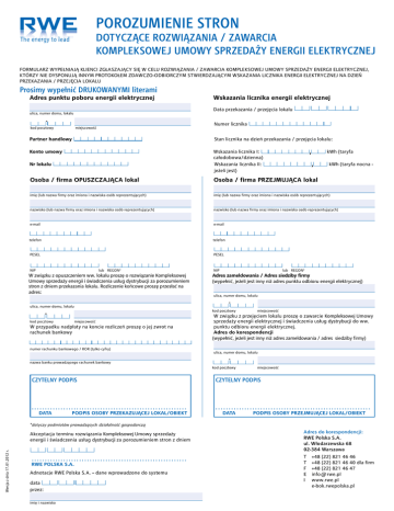 POROZUMIENIE STRON DOTYCZĄCE ROZWIĄZANIA / ZAWARCIA KOMPLEKSOWEJ UMOWY SPRZEDAŻY ENERGII ELEKTRYCZNEJ FORMULARZ WYPEŁNIAJĄ KLIENCI ZGŁASZAJĄCY SIĘ W CELU ROZWIĄZANIA / ZAWARCIA KOMPLEKSOWEJ UMOWY SPRZEDAŻY ENERGII ELEKTRYCZNEJ, KTÓRZY NIE DYSPONUJĄ INNYM PROTOKOŁEM ZDAWCZO-ODBIORCZYM STWIERDZAJĄCYM WSKAZANIA LICZNIKA ENERGII ELEKTRYCZNEJ NA DZIEŃ PRZEKAZANIA / PRZEJĘCIA LOKALU Prosimy wypełnić DRUKOWANYMI literami Adres punktu poboru energii elektrycznej ulica, numer domu, lokalu kod pocztowy Partner handlowy Konto umowy Nr lokalu miejscowość Wskazania licznika energii elektrycznej Data przekazania / przejęcia lokalu Numer licznika Stan licznika na dzień przekazania / przejęcia lokalu: Wskazania licznika I: całodobowa/dzienna) Wskazania licznika II: jeżeli jest) kWh (taryfa kWh (taryfa nocna - Osoba / firma OPUSZCZAJĄCA lokal Osoba / firma PRZEJMUJĄCA lokal imię (lub nazwa firmy oraz imiona i nazwiska osób reprezentujących) nazwisko (lub nazwa firmy oraz imiona i nazwiska osób reprezentujących) imię (lub nazwa firmy oraz imiona i nazwiska osób reprezentujących) nazwisko (lub nazwa firmy oraz imiona i nazwiska osób reprezentujących) e-mail e-mail PESEL PESEL telefon telefon NIP lubREGON2 W związku z opuszczeniem ww. lokalu proszę o rozwiązanie Kompleksowej Umowy sprzedaży energii i świadczenia usług dystrybucji za porozumieniem stron z dniem przekazania lokalu. Rozliczenie końcowe proszę przesłać na adres: lubREGON2 zameldowania / Adres siedziby firmy (wypełnić, jeżeli jest inny niż adres punktu odbioru energii elektrycznej) kod pocztowy W przypadku NIP Adres ulica, numer domu, lokalu ulica, numer domu, lokalu miejscowość nadpłaty na koncie rozliczeń proszę o jej zwrot na rachunek bankowy numer rachunku bankowego / ROR (tylko cyfry) nazwa banku prowadzącego rachunek bankowy kod pocztowy W związku miejscowość z przejęciem lokalu proszę o zawarcie Kompleksowej Umowy sprzedaży energii elektrycznej i świadczenia usług dystrybucji do ww. punktu odbioru energii elektrycznej. Adres do korespondencji (wypełnić, jeżeli jest inny niż adres zameldowania / adres siedziby firmy) ulica, numer domu, lokalu kod pocztowy miejscowość CZYTELNY PODPIS CZYTELNY PODPIS ........................................................... DATA PODPIS OSOBY PRZEKAZUJĄCEJ LOKAL/OBIEKT ........................................................... DATA PODPIS OSOBY PRZEJMUJĄCEJ LOKAL/OBIEKT *dotyczy podmiotów prowadzących działalność gospodarczą Wersja z dnia 17.01.2012 r. Akceptacja terminu rozwiązania Kompleksowej Umowy sprzedaży energii i świadczenia usług dystrybucji za porozumieniem stron z dniem ........................................................... RWE POLSKA S.A. Adnotacje RWE Polska S.A. – dane wprowadzone do systemu data przez: imię i nazwisko Adres do korespondencji: RWE Polska S.A. ul. Włodarzewska 68 02-384 Warszawa T+48 (22) 821 46 46 T +48 (22) 821 46 40 dla firm F +48 (22) 821 46 47 [email protected] Iwww.rwe.pl e-bok.rwepolska.pl